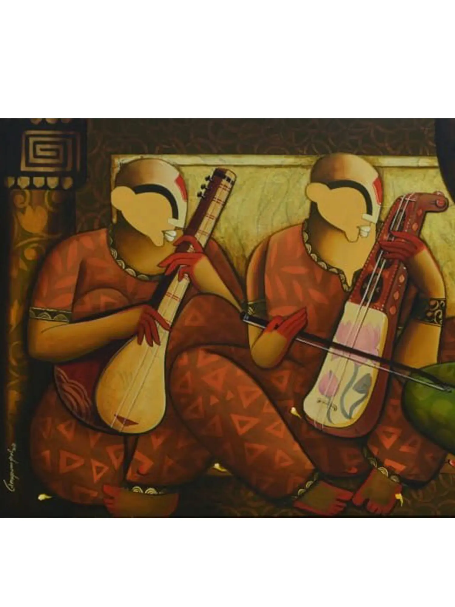 This composition evokes the spirit of traditional Indian musical gatherings, where collective performance fosters a profound sense of unity and shared heritage. The artist draws inspiration from these age-old traditions, translating their vibrant energy and spiritual resonance into a contemporary artistic language that feels both timeless and immediate.
