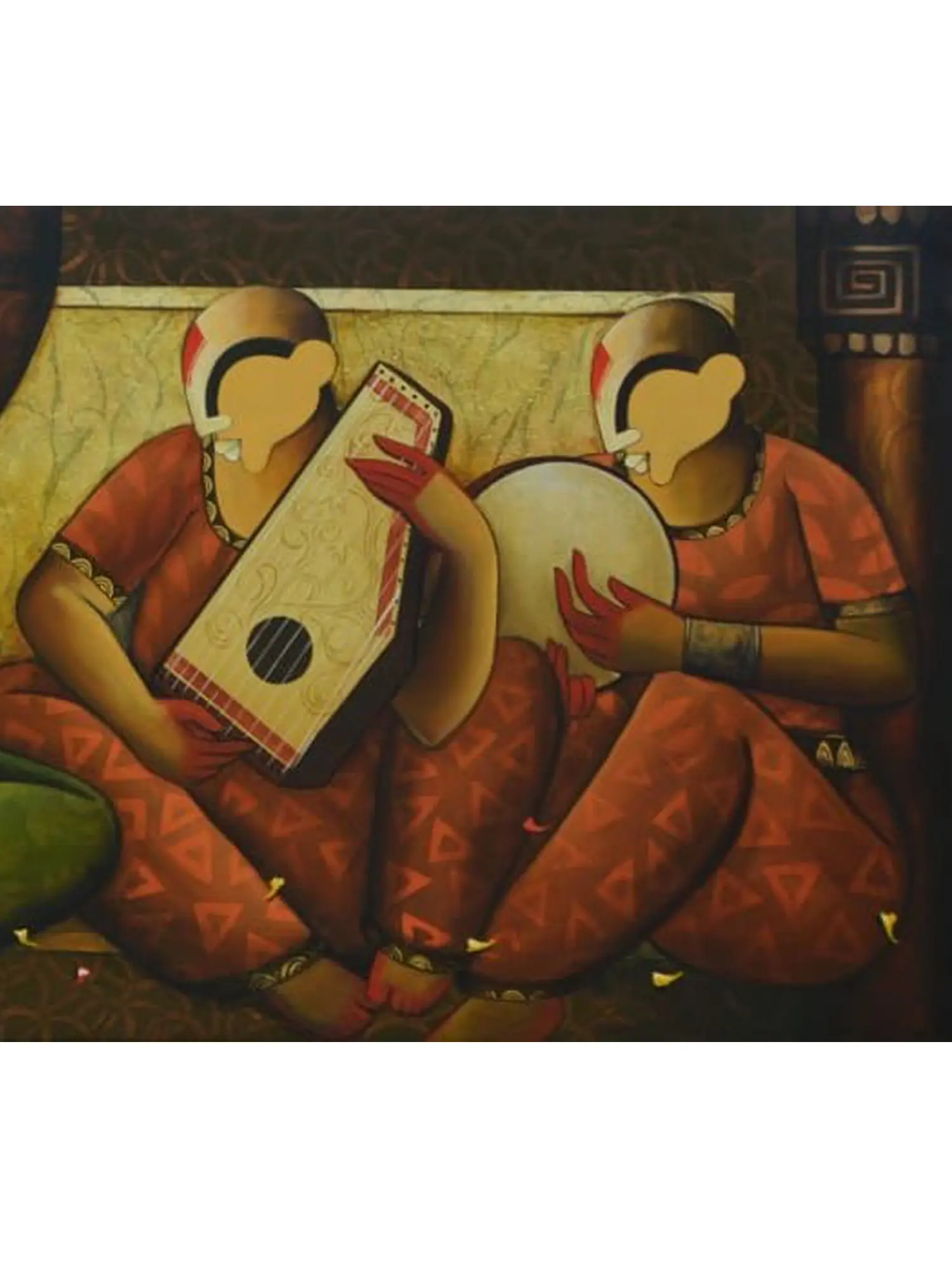 Observe the harmonious arrangement of figures, each engaged with their unique instrument, contributing to a collective symphony. The bold, stylized depictions of the musicians, rendered in earthy tones and punctuated by vibrant accents, draw your eye across the expansive canvas. You'll appreciate the subtle textures and the interplay of light and shadow that lend a captivating dimensionality.