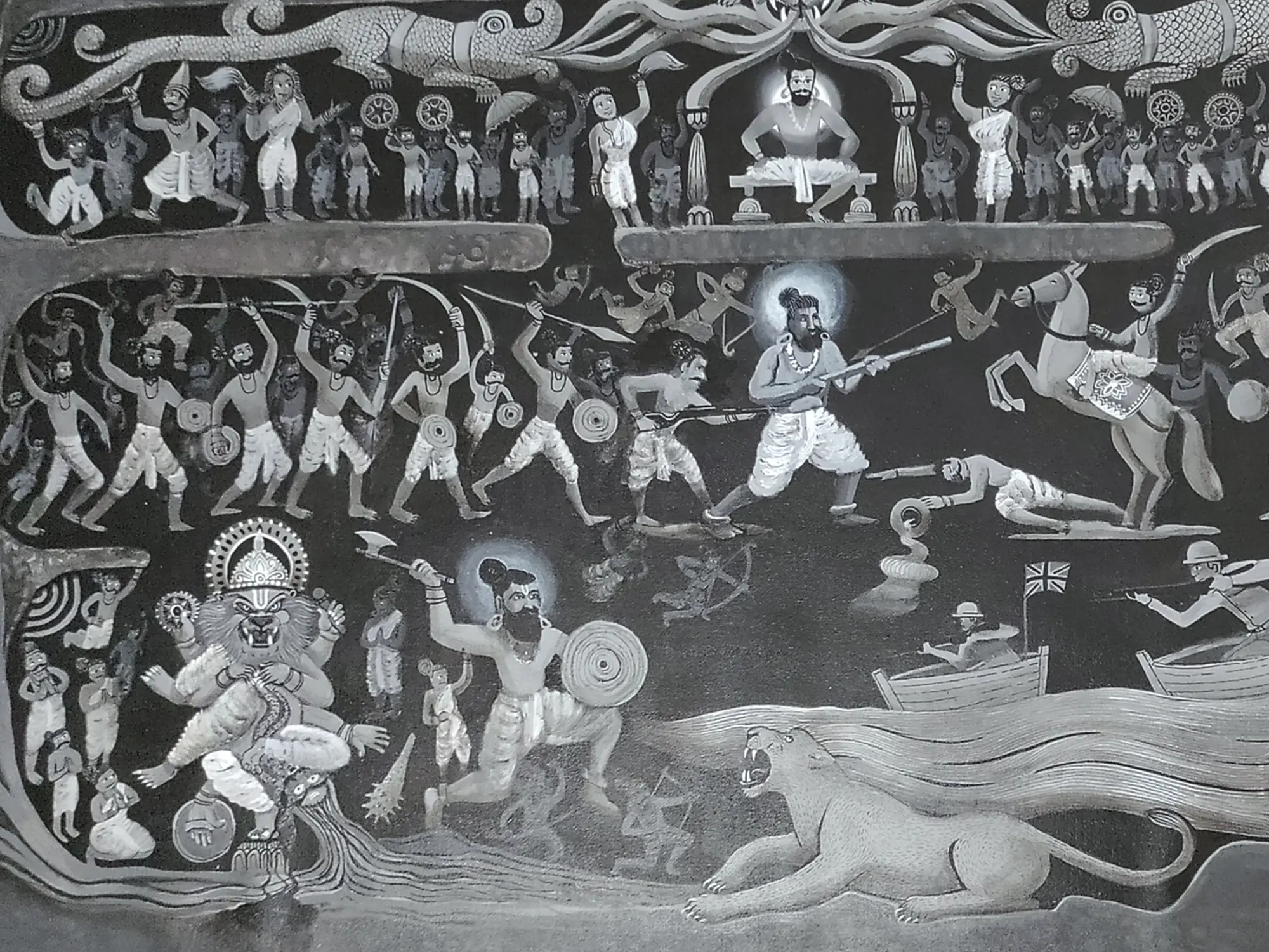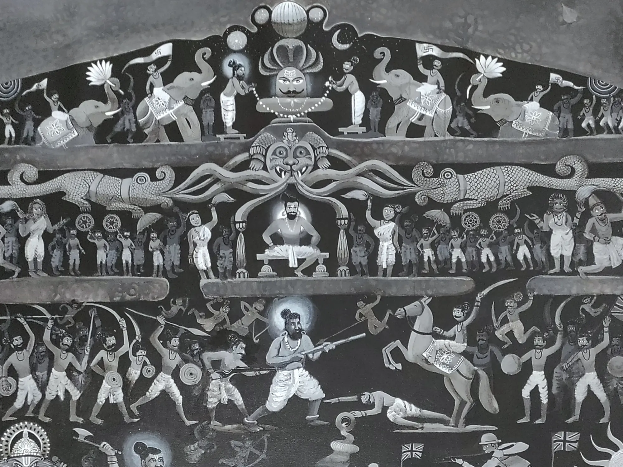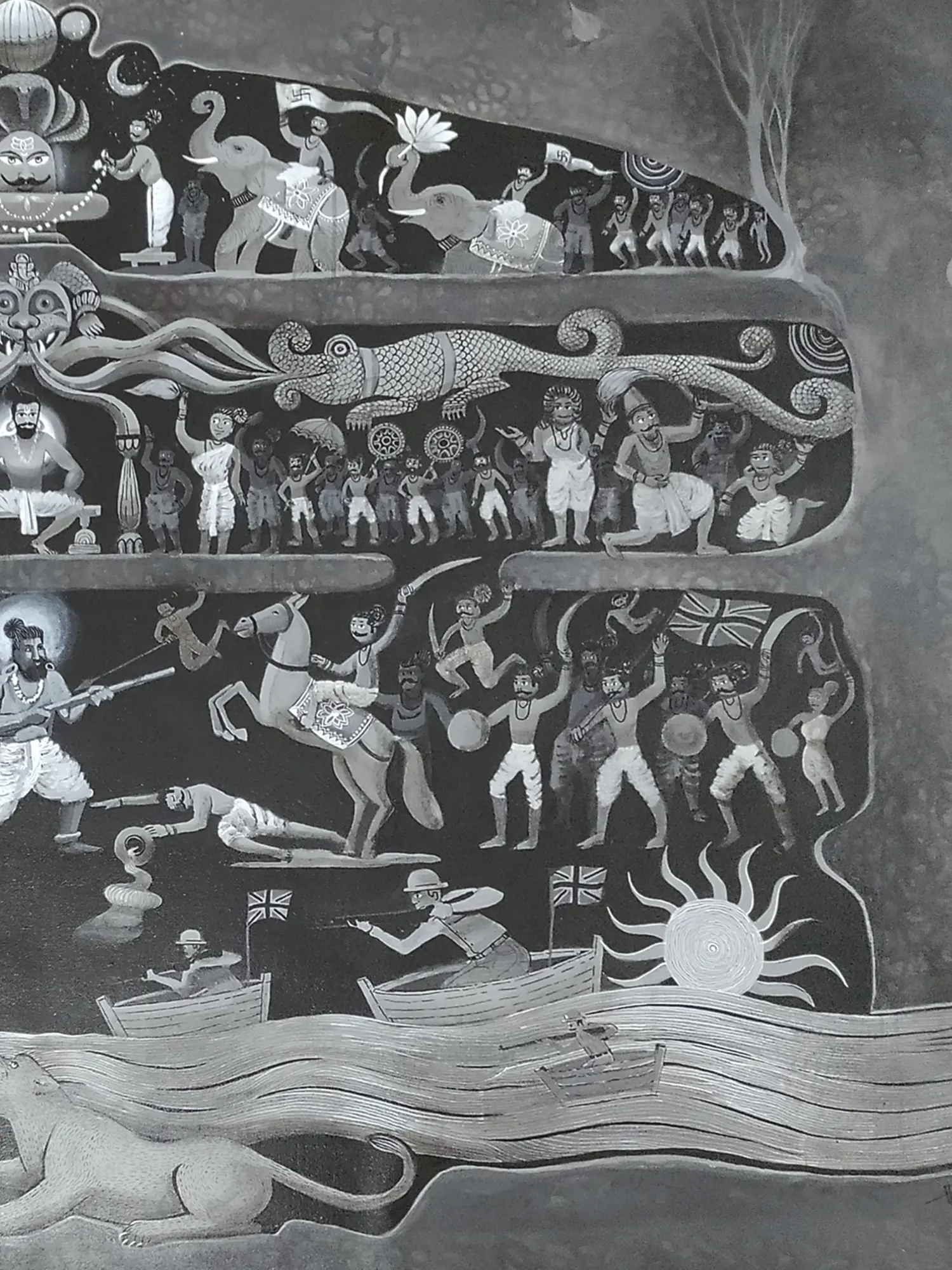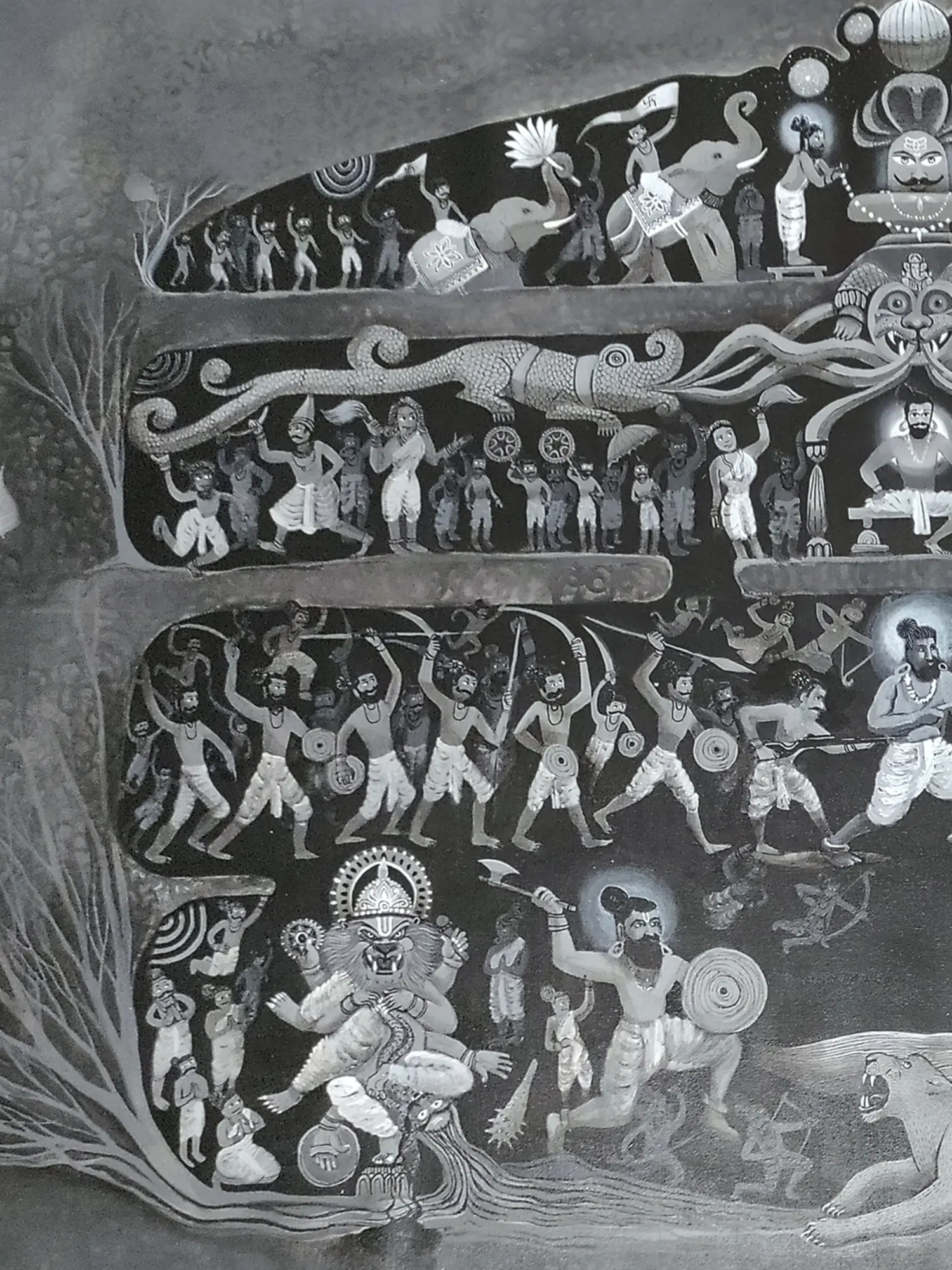 This artwork resonates with the spirit of ancient Indian storytelling, drawing inspiration from epics and folklore that have shaped generations. It offers a window into a rich cultural heritage, presented through a contemporary artistic lens. The symbolic imagery invites contemplation and a deeper connection to the narratives it so powerfully conveys.