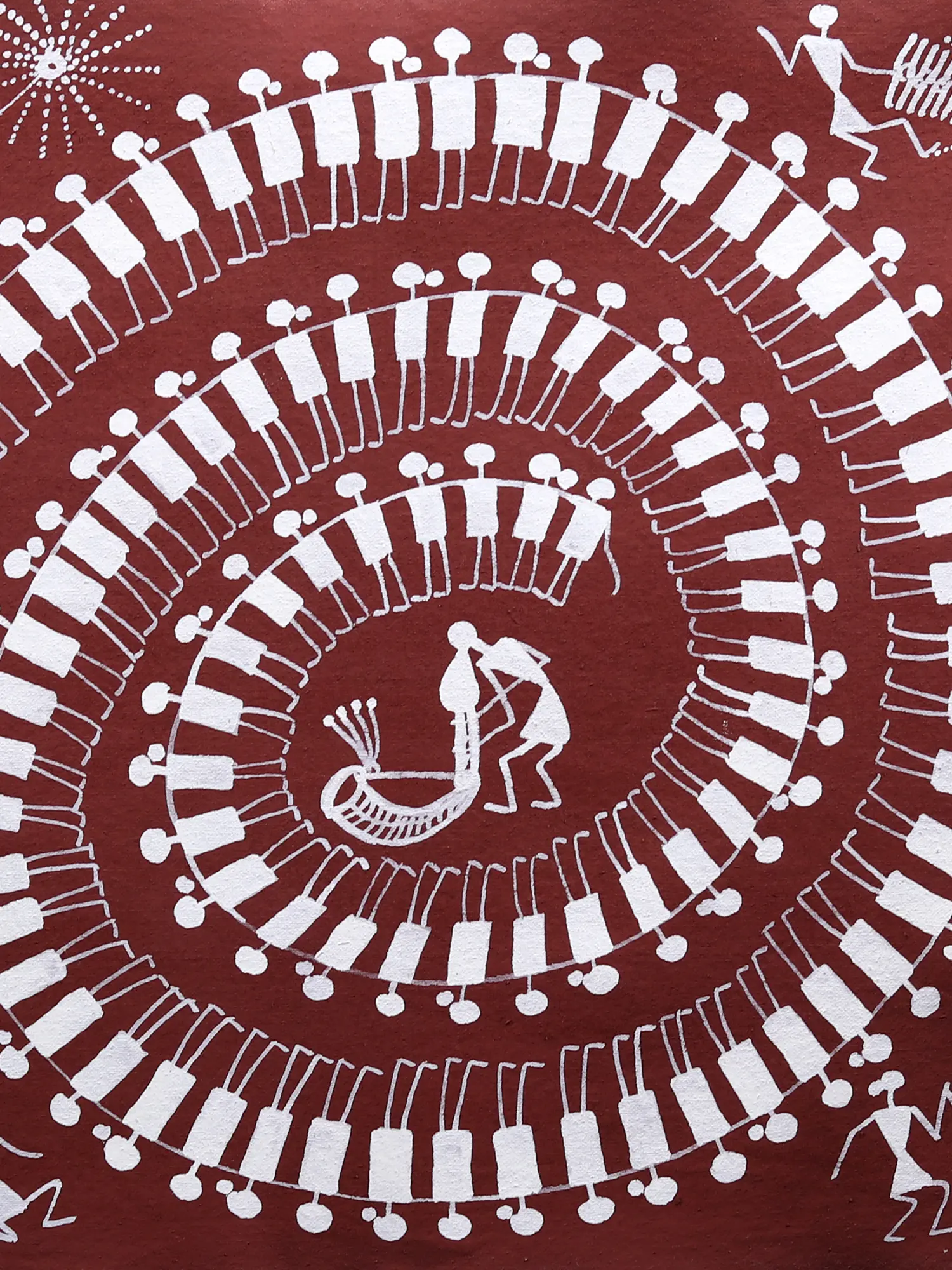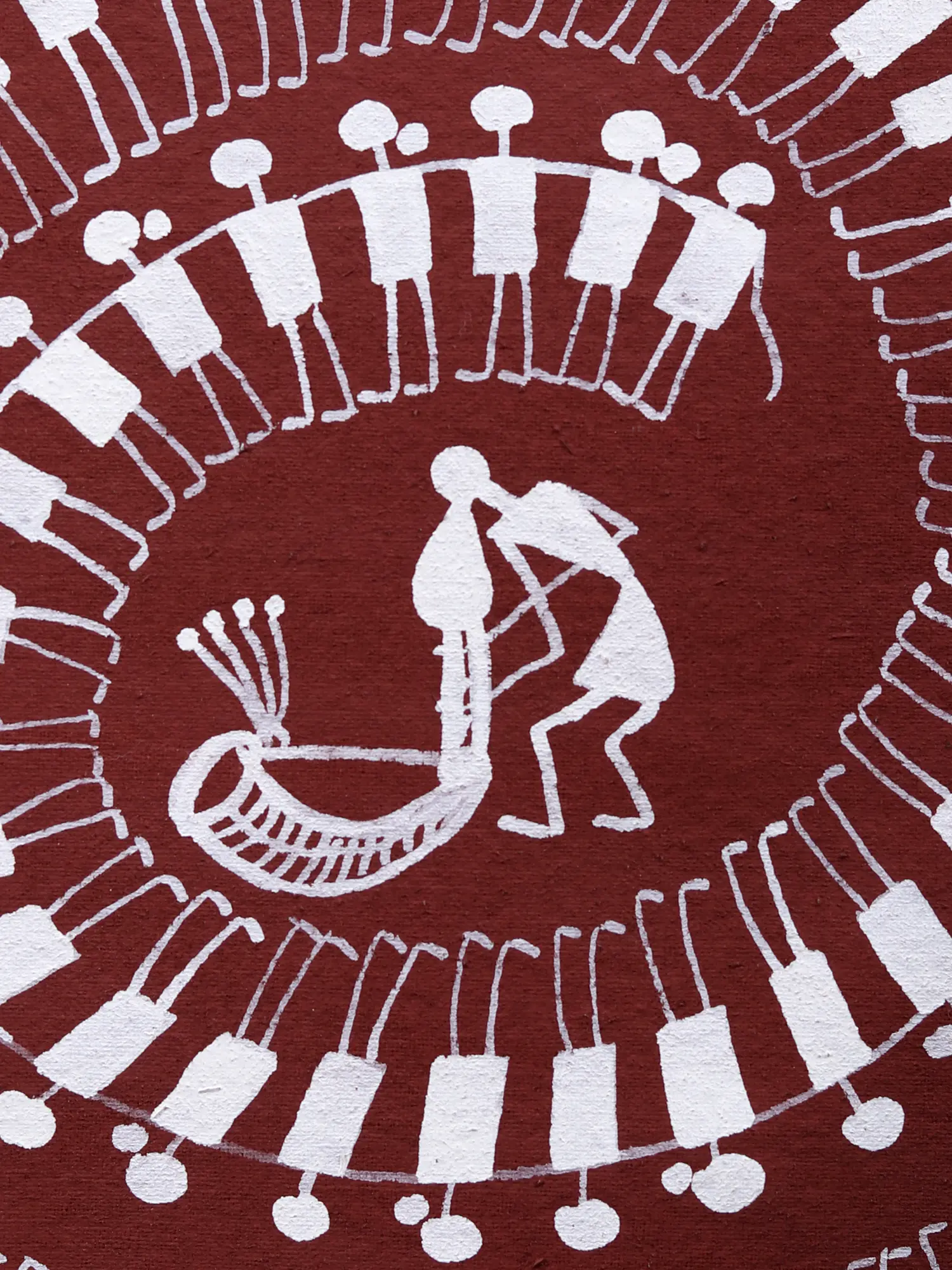 Warli painting originates from the indigenous Warli tribes of Maharashtra, India, an art form historically practiced on mud walls and roofs. These paintings are not mere decoration; they are windows into the beliefs, rituals, and daily lives of their creators. This particular depiction, likely inspired by harvest festivals or celebratory dances, echoes ancient traditions where community bonding and reverence for nature were paramount. You can almost feel the pulse of the music and the energy of the dancers, a testament to the enduring power of this folk art.