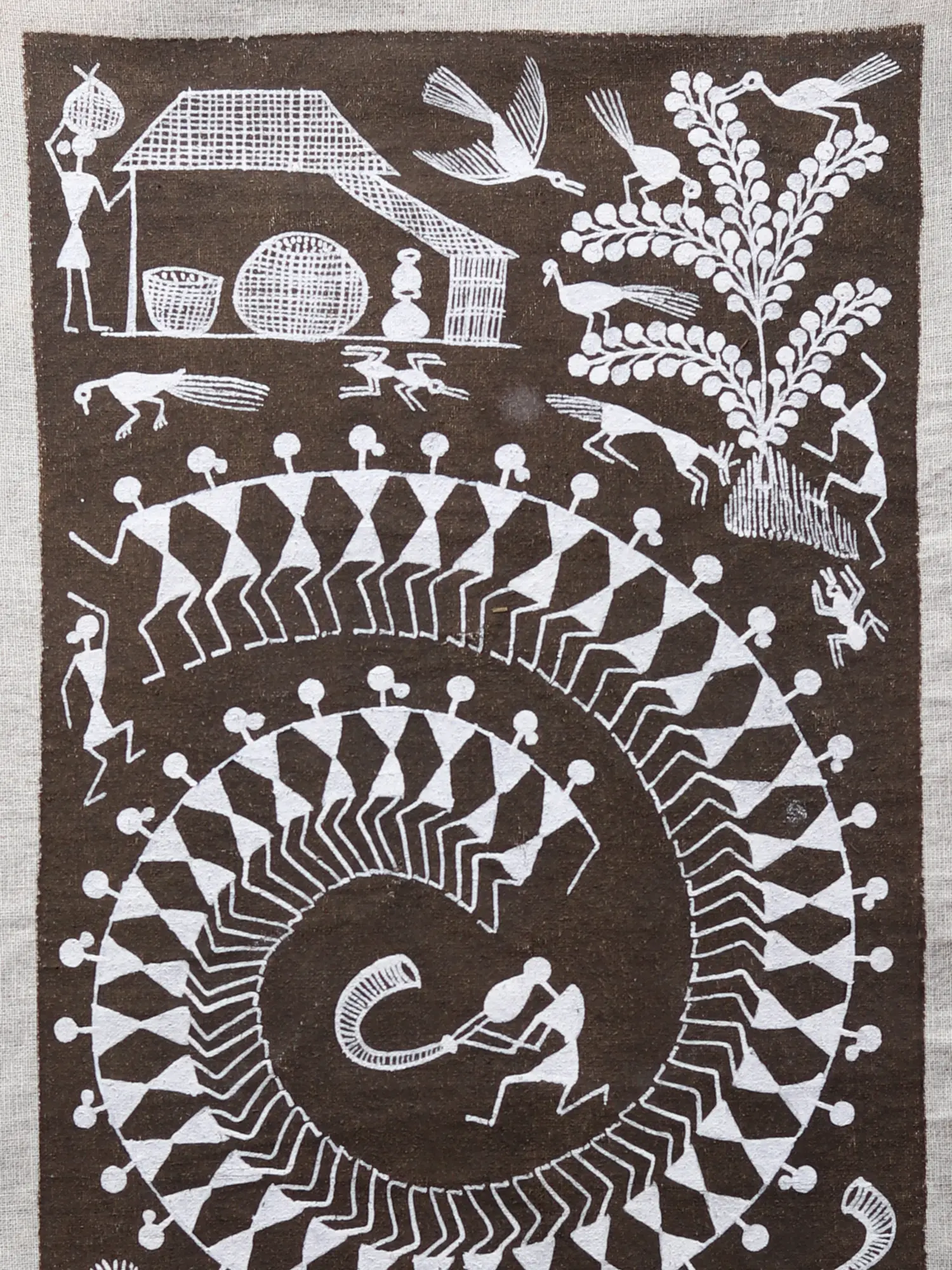 Tree of Life and Village Life Warli Painting on Cotton Cloth by Sanjay Balakrishna Parhad