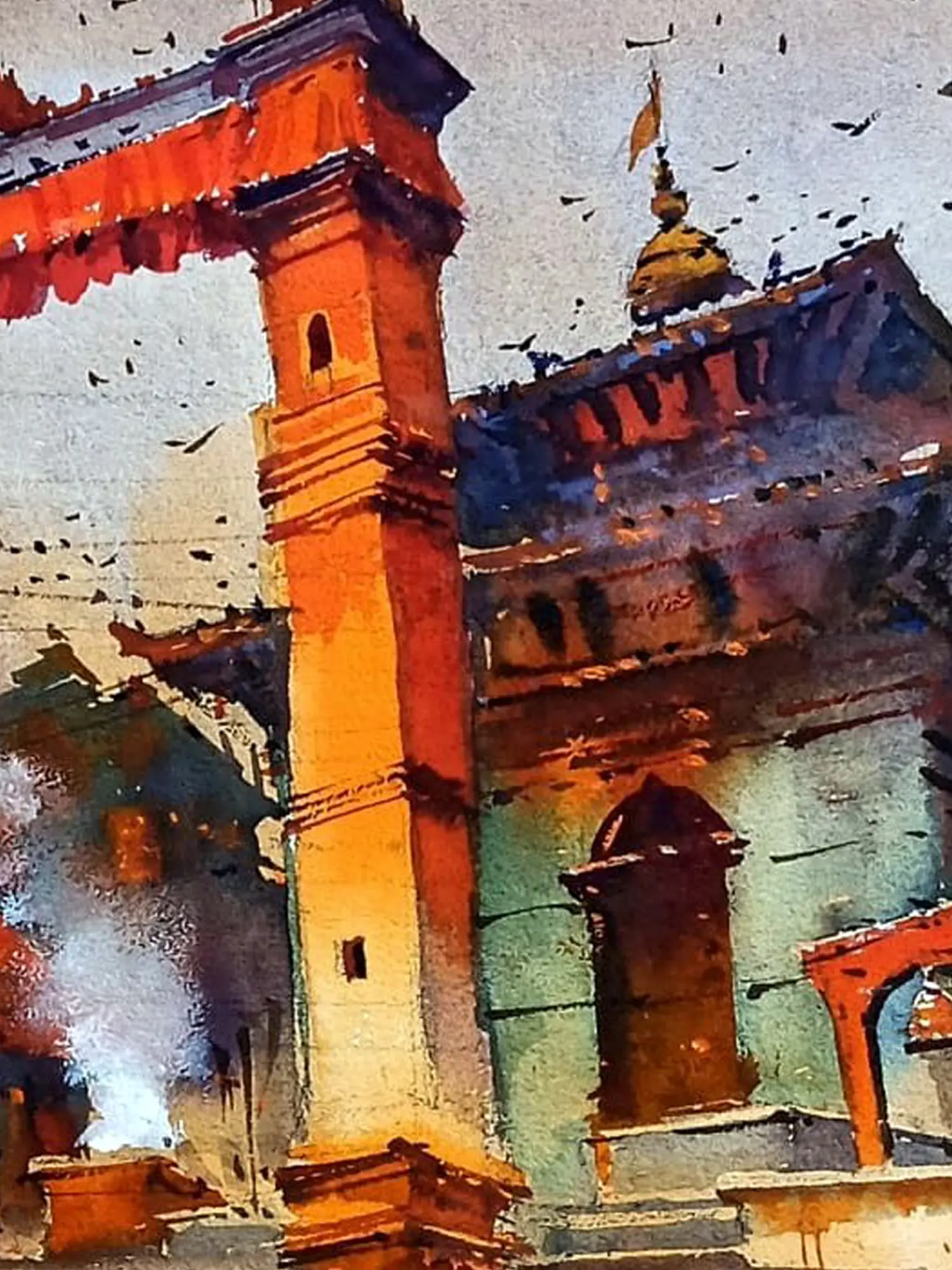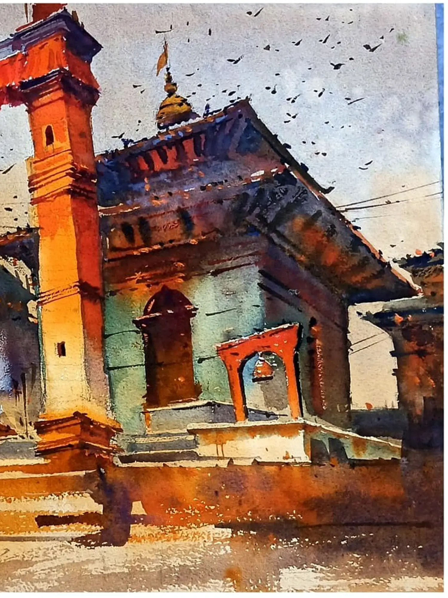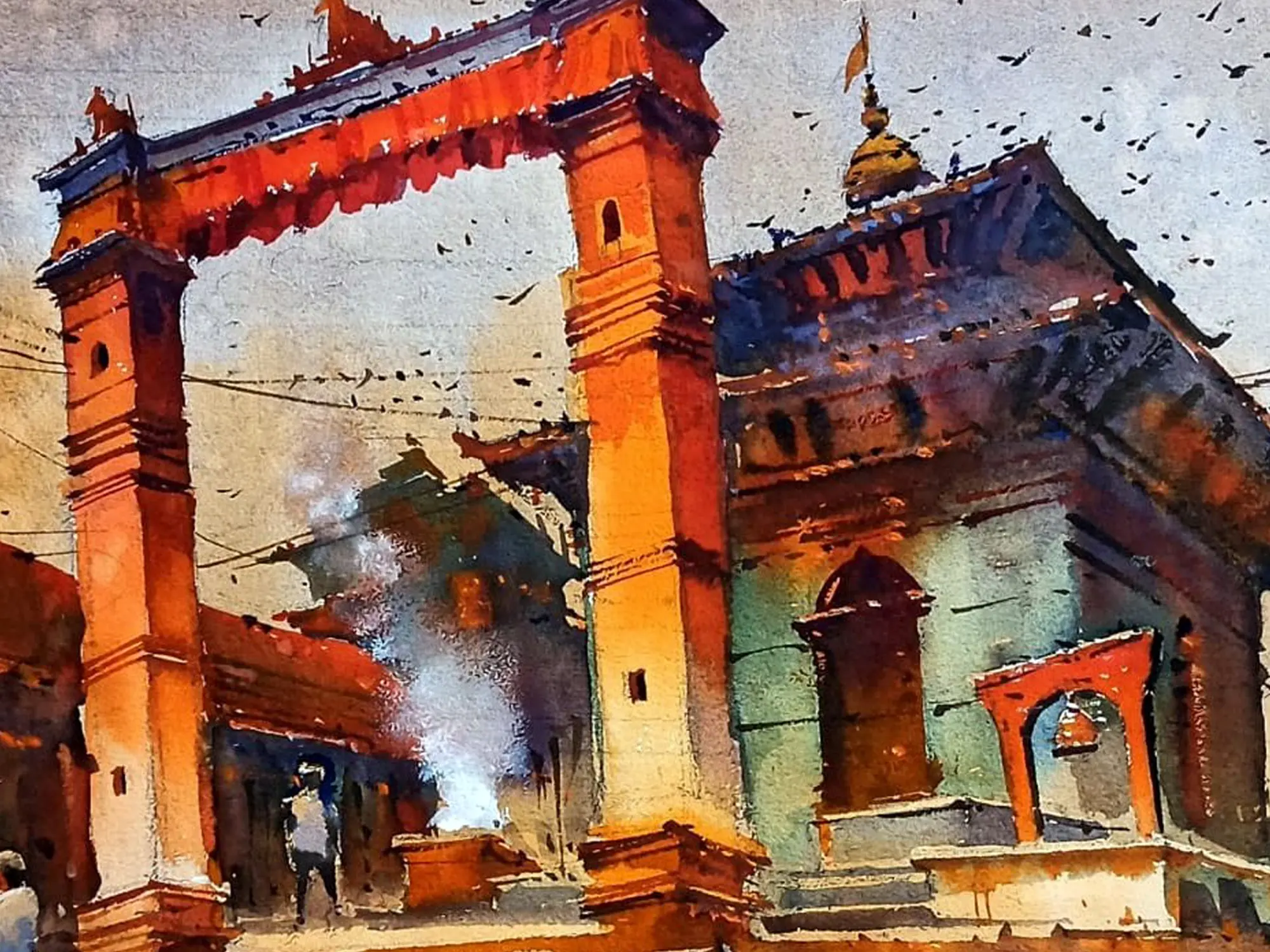 The watercolour painting captures the timeless allure of a temple in Kathmandu, where ancient traditions and spiritual heritage converge in harmony. Against misty mountains and departing flocks, the temple stands as a beacon of faith and devotion, inviting pilgrims into its sacred embrace. With delicate brushstrokes and soft hues, the artwork evokes the serene beauty and mystical charm of Nepal's cultural landscape, inspiring reverence for its rich spiritual legacy. From its ornate architecture to its tranquil ambiance, the painting transports viewers to a realm of divine serenity and transcendent beauty.