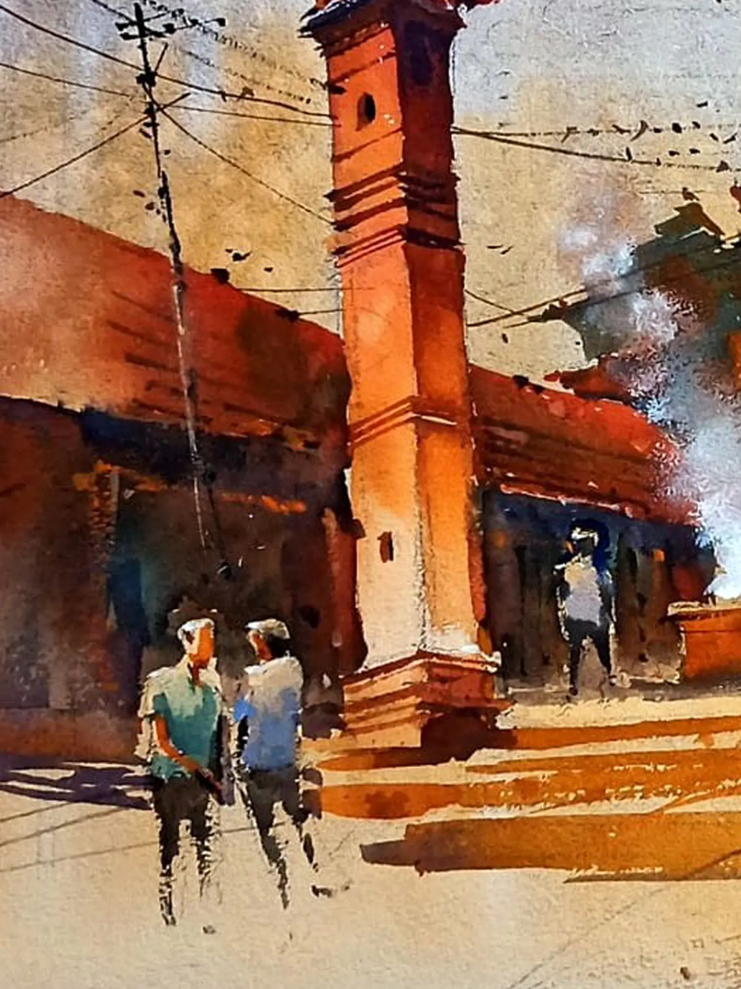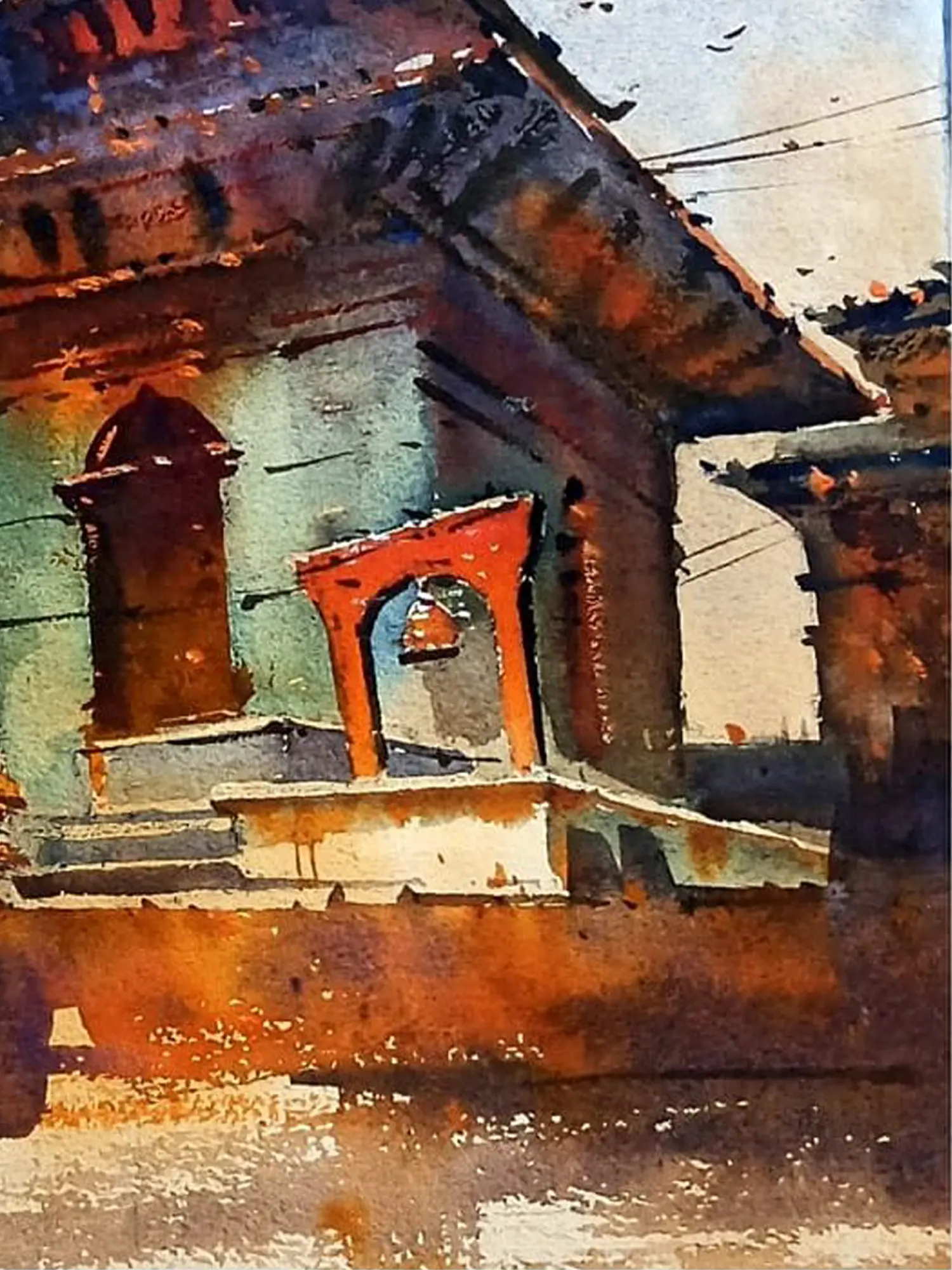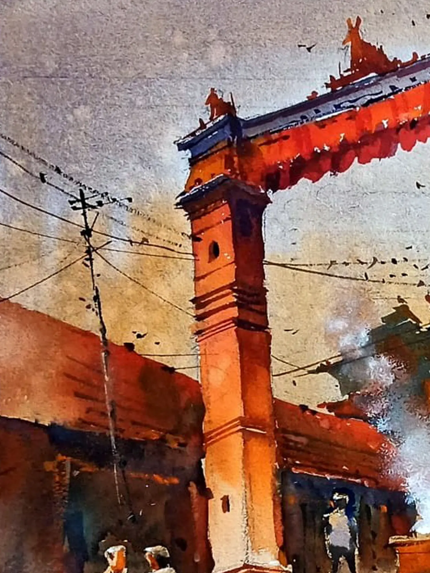 The watercolour painting captures the timeless allure of a temple in Kathmandu, where ancient traditions and spiritual heritage converge in harmony. Against misty mountains and departing flocks, the temple stands as a beacon of faith and devotion, inviting pilgrims into its sacred embrace. With delicate brushstrokes and soft hues, the artwork evokes the serene beauty and mystical charm of Nepal's cultural landscape, inspiring reverence for its rich spiritual legacy. From its ornate architecture to its tranquil ambiance, the painting transports viewers to a realm of divine serenity and transcendent beauty.