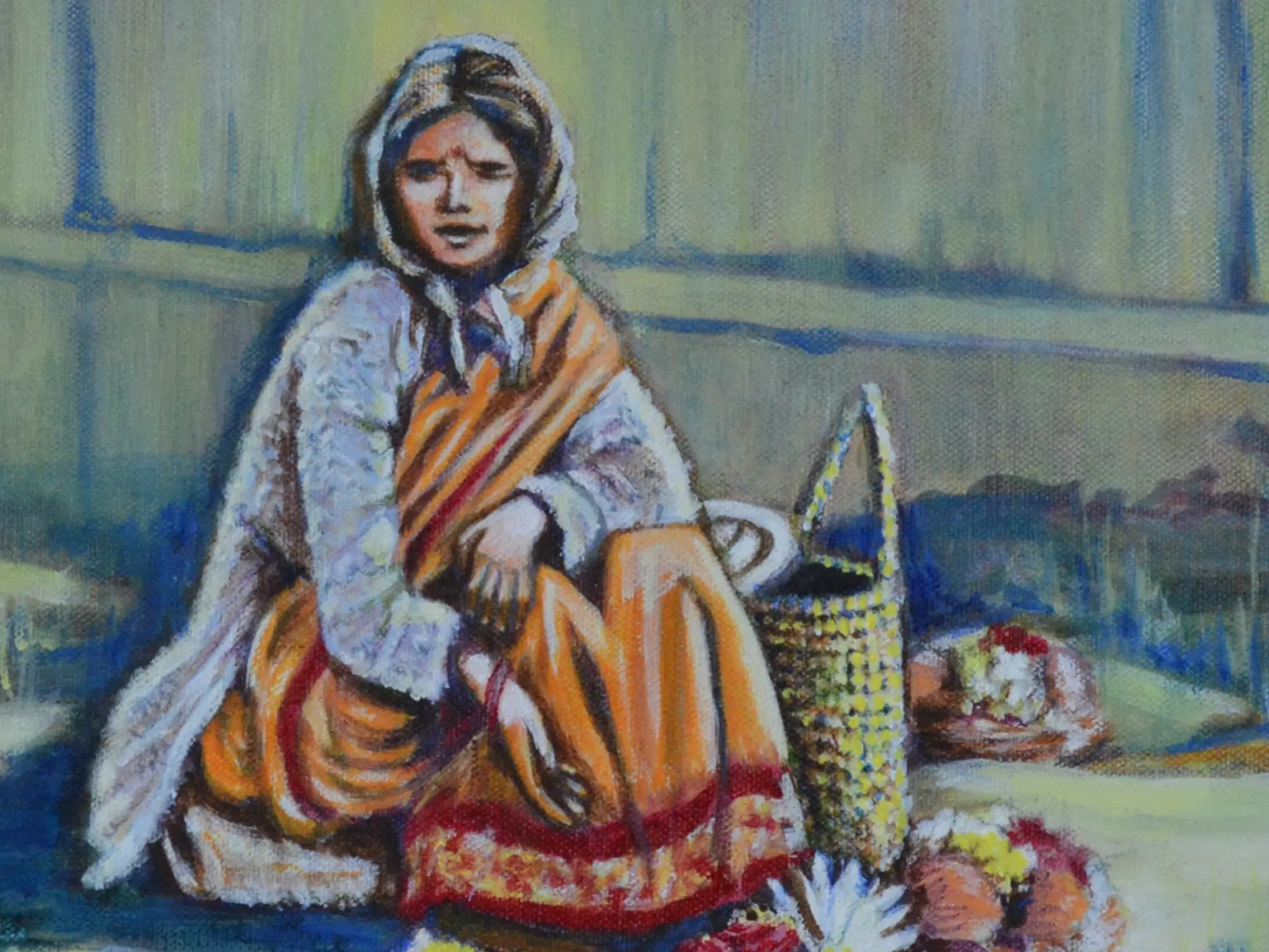 The gentle rendering of the vendor's attire, from the soft folds of her shawl to the intricate patterns of her skirt, speaks to an intimate understanding of her world. Surrounding her, artfully arranged offerings of flowers and fruits, rendered with a discerning eye for form and subtle shadow, draw you closer. The artwork measures 12 by 16 inches, a size that allows for intricate detail without overwhelming your space.