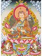 Lord Padmasambhava sits in the center while his consorts sit on either side. On his right side sits Mandarava and on the left side sits Yeshe Tsogyal. The white clouds and snow-peaked mountains at the backdrop enhances the grace and the tone of rich multiple colors of Thangka.