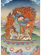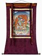 This beautiful Tibetan Thangka painting depicts Guru Dorje Drolo, one of the eight principal forms of Guru Rinpoche assumed at different points of his life. It's the wild, wrathful form of the Guru-saint, where he stands before a flaming aureole, holding a ritual tool, the vajra, in his right hand, ready to strike. He rides a fierce tiger as the flayed skin of an elephant is draped across his shoulders.