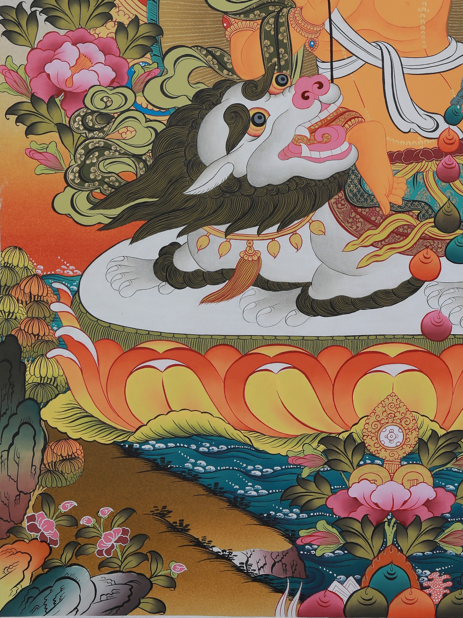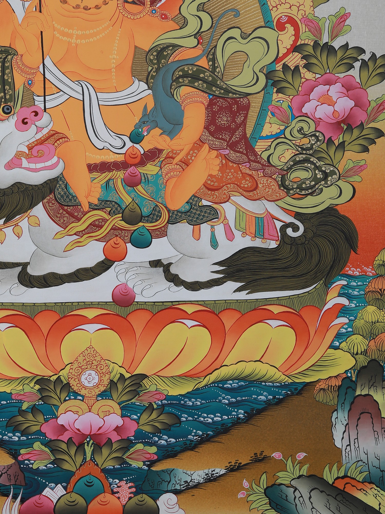 Tibetan Buddhist Deity Vaishravana (Kubera) Seated on White Snow Lion with a Banner of Victory and Mongoose