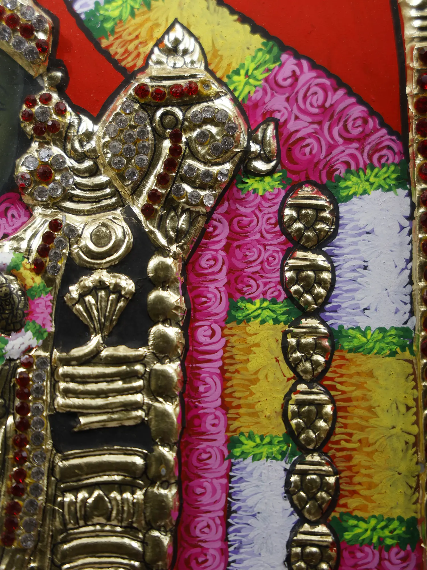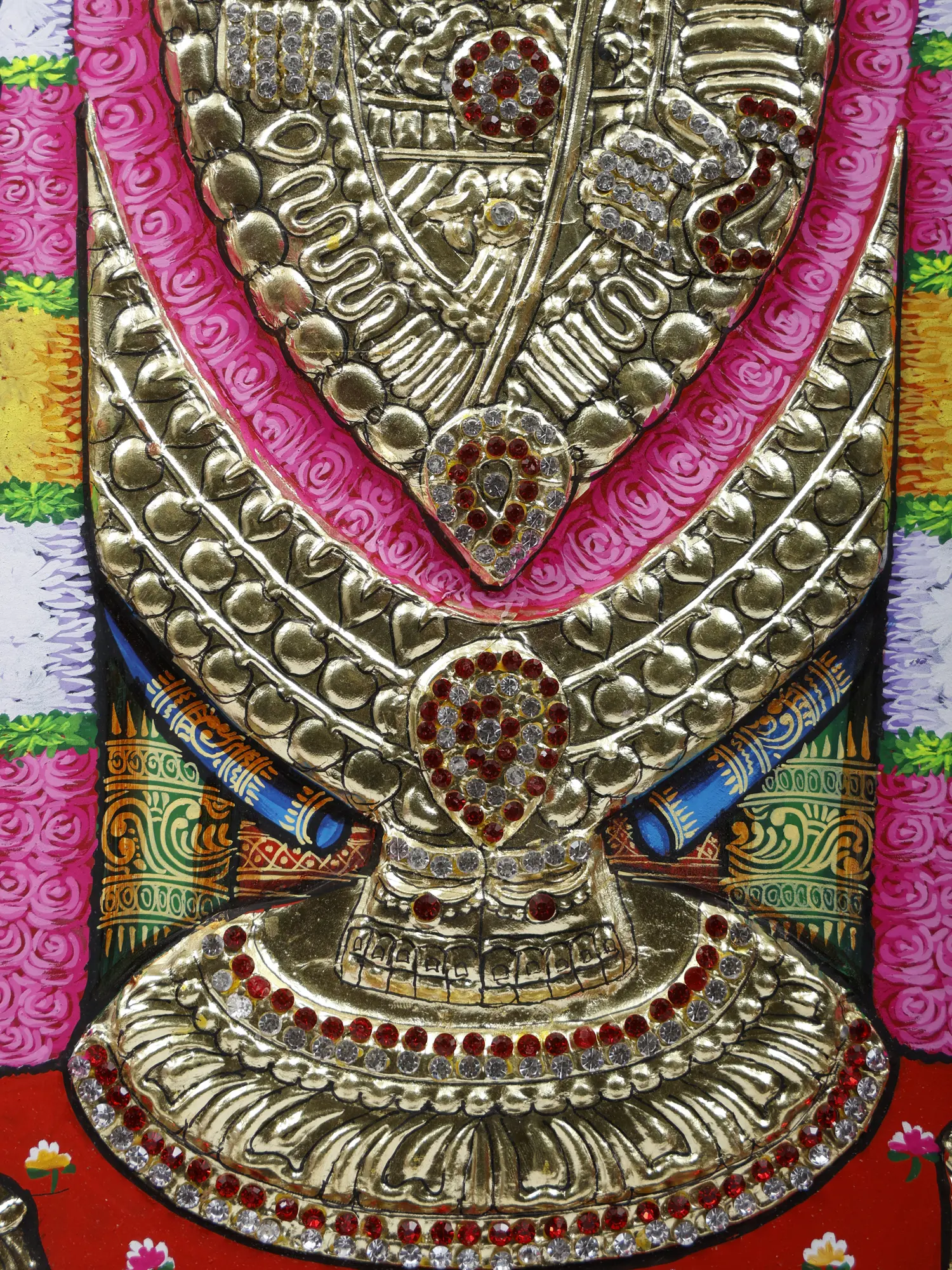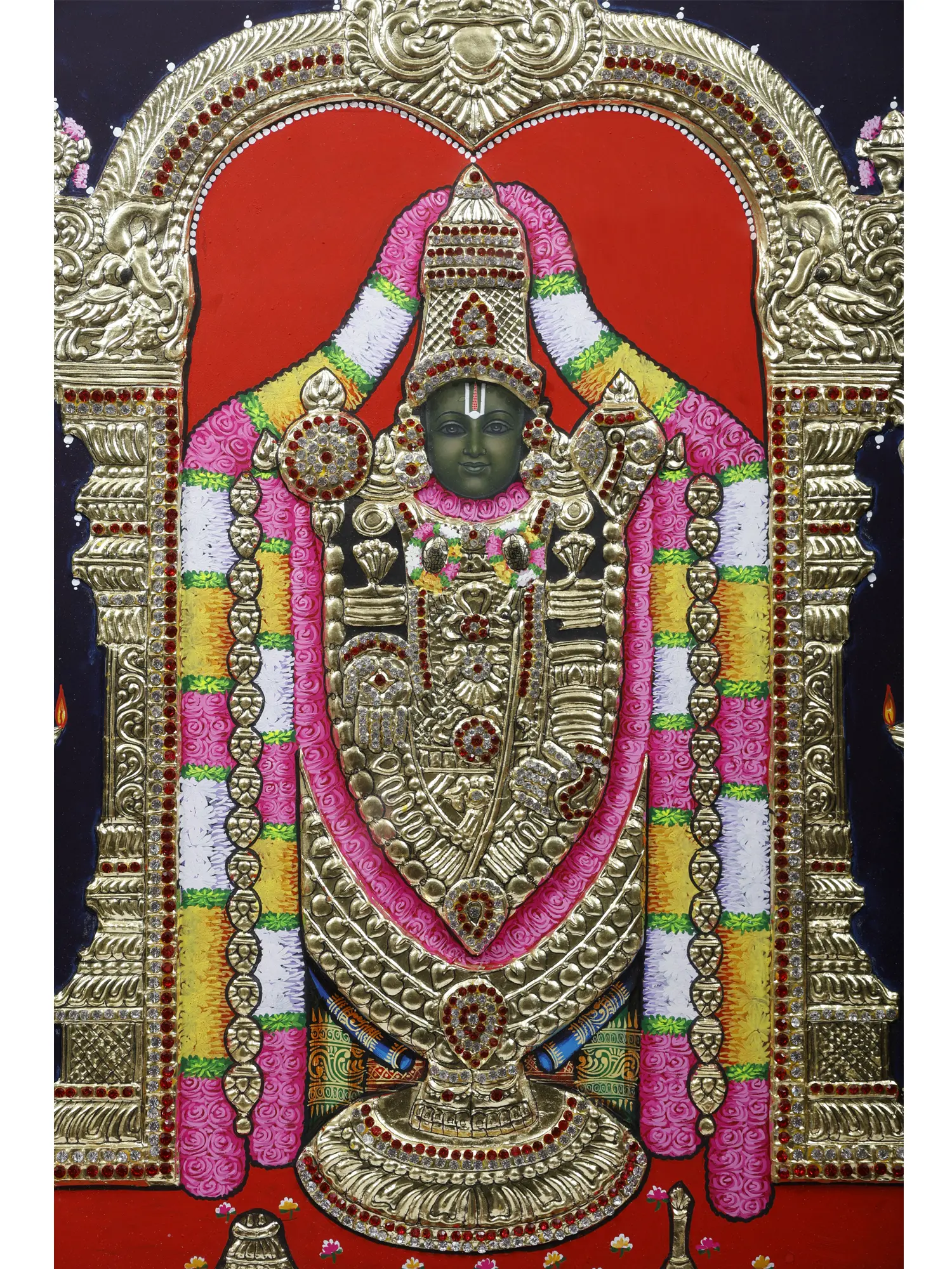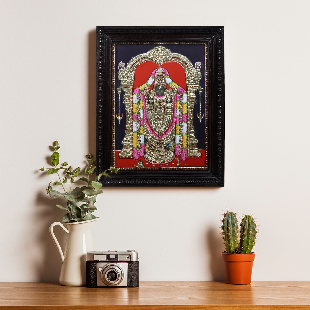 The splendor of Tirupati's famous shrine is presented by this Tanjore painting of Lord Tirupati Balaji.