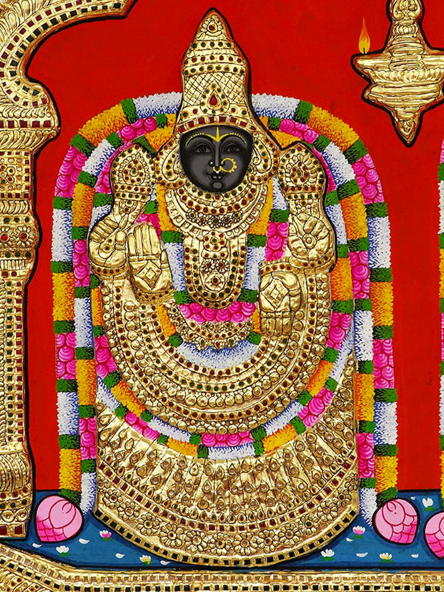 This exquisite Tanjore painting portrays Lord Venkateshwara (Tirupati Balaji) alongside his consort, Padmavati.