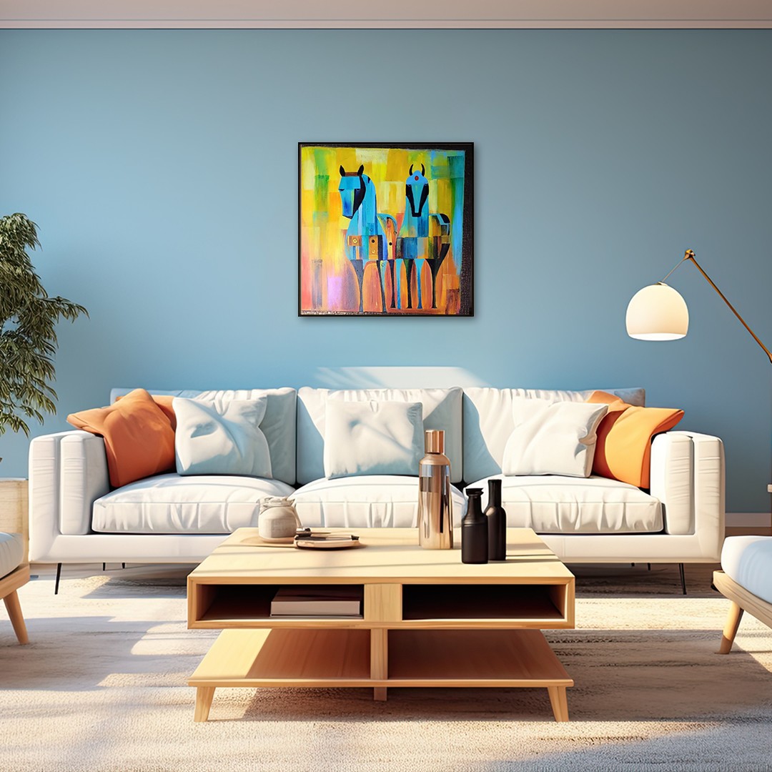 This captivating acrylic painting, "Together Horse Abstract," by Bharati Darshan Bhat, presents a vibrant and stylized depiction of two horses standing side-by-side. The artist’s masterful use of color and form creates a dynamic visual experience that is both modern and evocative of ancient equestrian symbolism. The bold, geometric shapes and contrasting hues suggest a sense of movement and energy, while the overall composition exudes a quiet strength and companionship. The rich, warm background tones complement the cooler blues and blacks of the horses, creating a striking contrast that draws the viewer’s eye. The painting's abstract style invites personal interpretation, making it a piece that can resonate deeply with a variety of viewers and add a unique, artistic flair to any space. The 28x28-inch canvas size allows for the artwork’s vibrant details and striking composition to be fully appreciated.