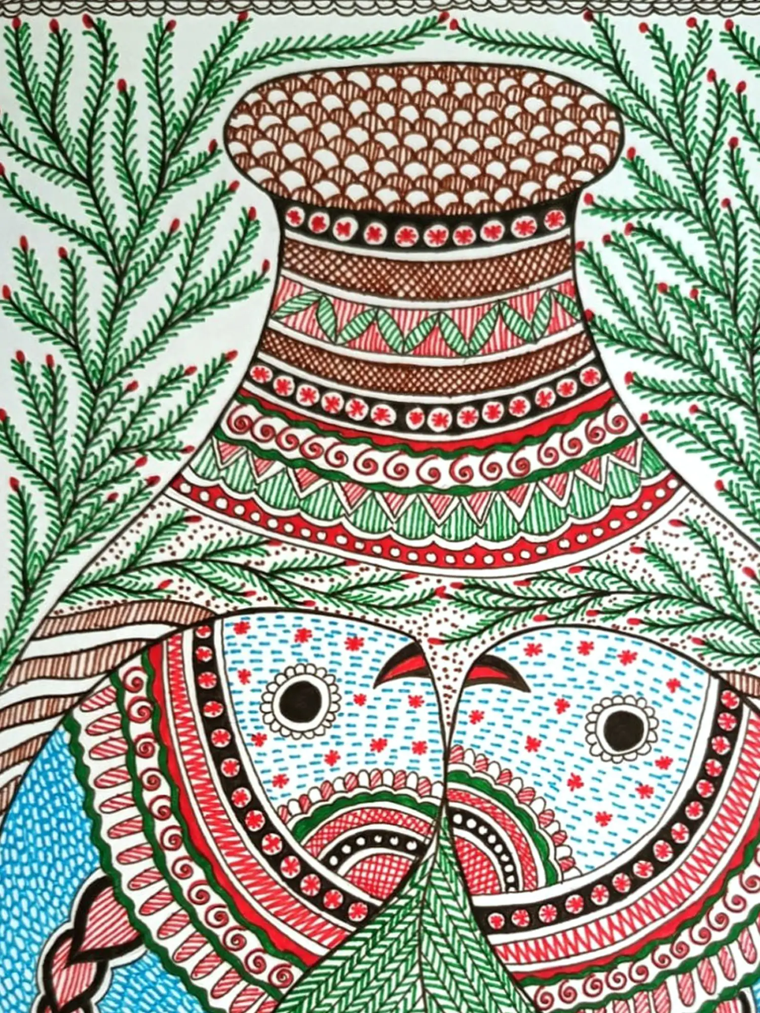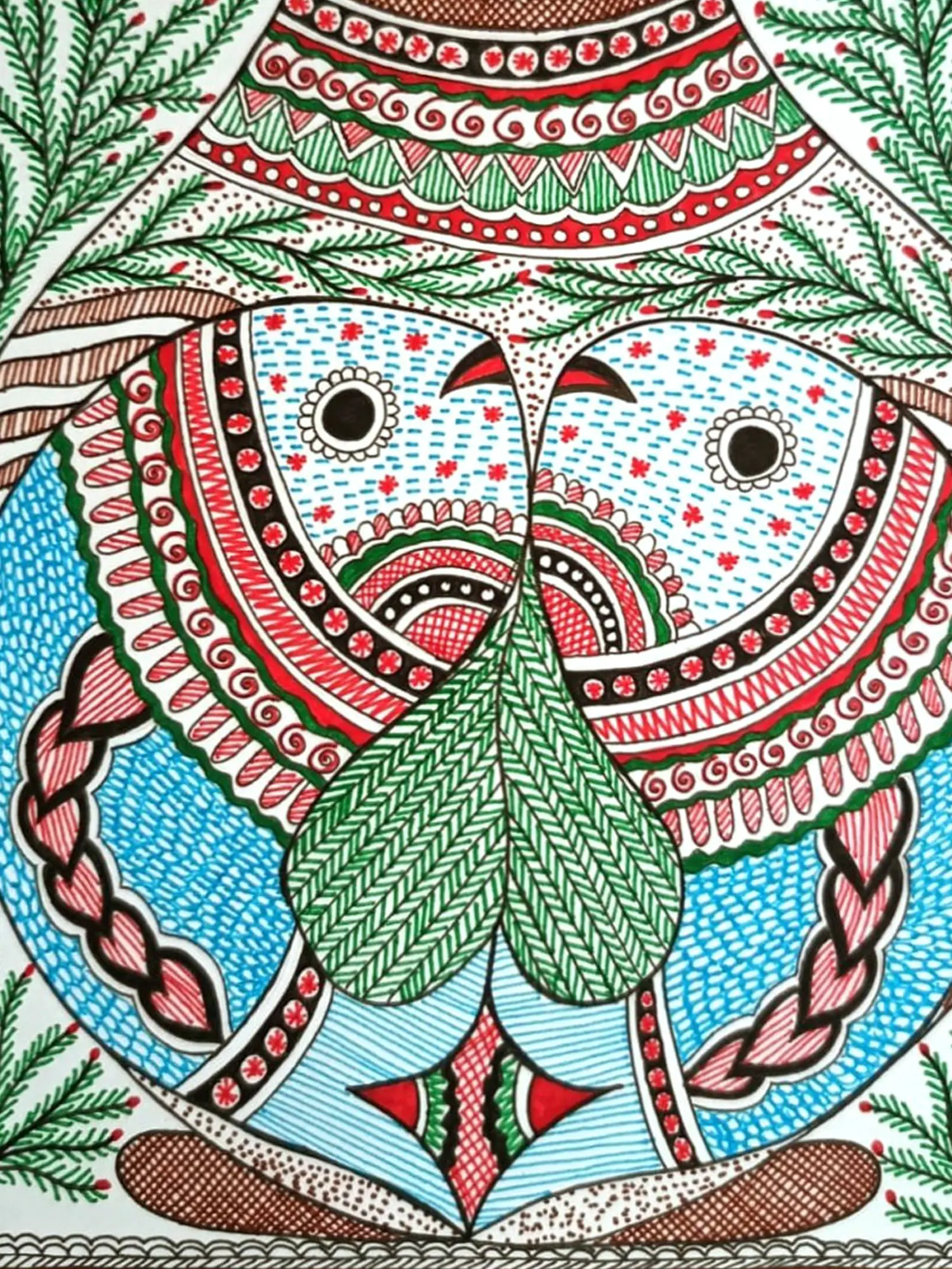 Ruchi's masterful use of alcohol markers and fineliners brings depth and vibrancy to the piece. The fine lines create intricate patterns and textures, while the bold colors add a striking contrast, highlighting the traditional motifs. The artist’s skill is evident in the flawless execution of each element; no detail is overlooked. This blend of precision and vibrancy is what truly elevates Madhubani art to a unique position in the world of visual expression. The painting’s use of a combination of alcohol markers and fineliners makes the colors pop with a dazzling energy.
