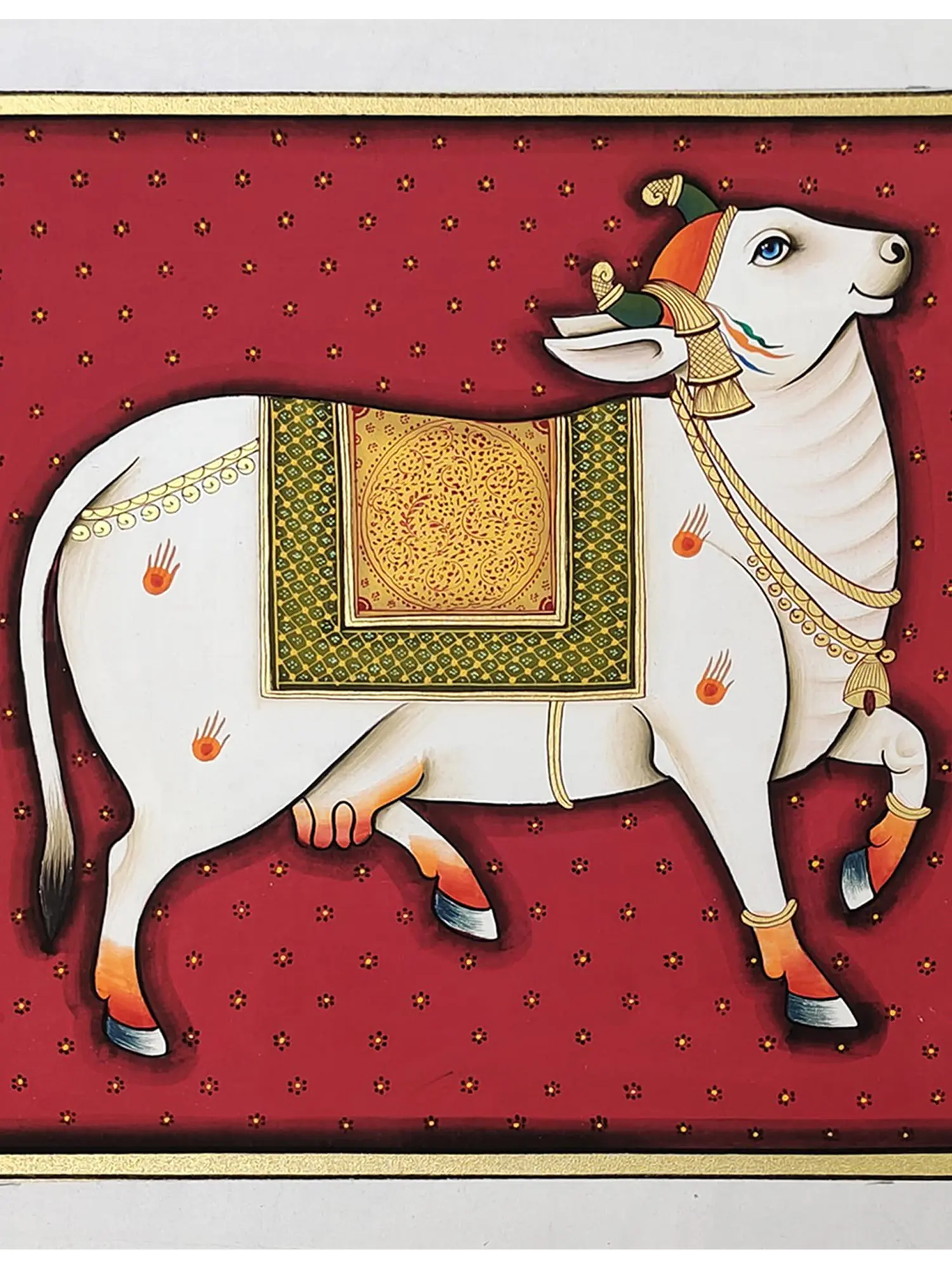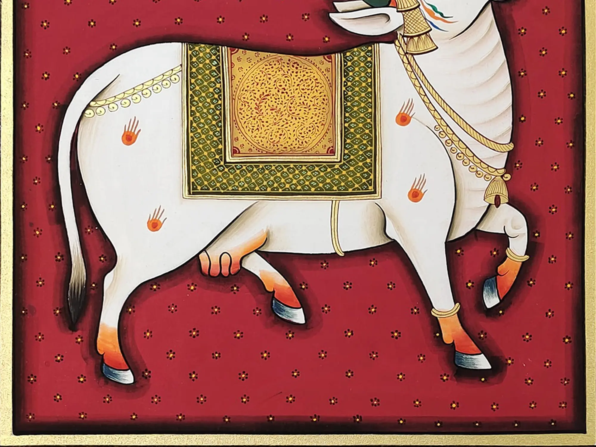 Cows play a very important role in Pichwai art, symbolizing divine presence, fertility, and abundance in Hindu culture. In traditional Pichwai paintings, they often serve as sacred companions to deities like Krishna, embodying nurturing and maternal qualities. Praveen Munot's rendition elevates the cow's status, adorning it with ornate coverings, symbolizing its revered and regal stature. The joyous expression of the cow, coupled with intricate decorations, exudes a sense of celebration and reverence. Through meticulous detailing, Munot captures the essence of the cow's revered position in Hindu tradition, honoring its role as a symbol of prosperity and divine grace.