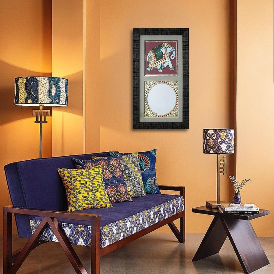 Traditionally Dressed Elephant with Mirror | Traditional Colour With 24 Karat Gold | Tanjore Painting with Frame