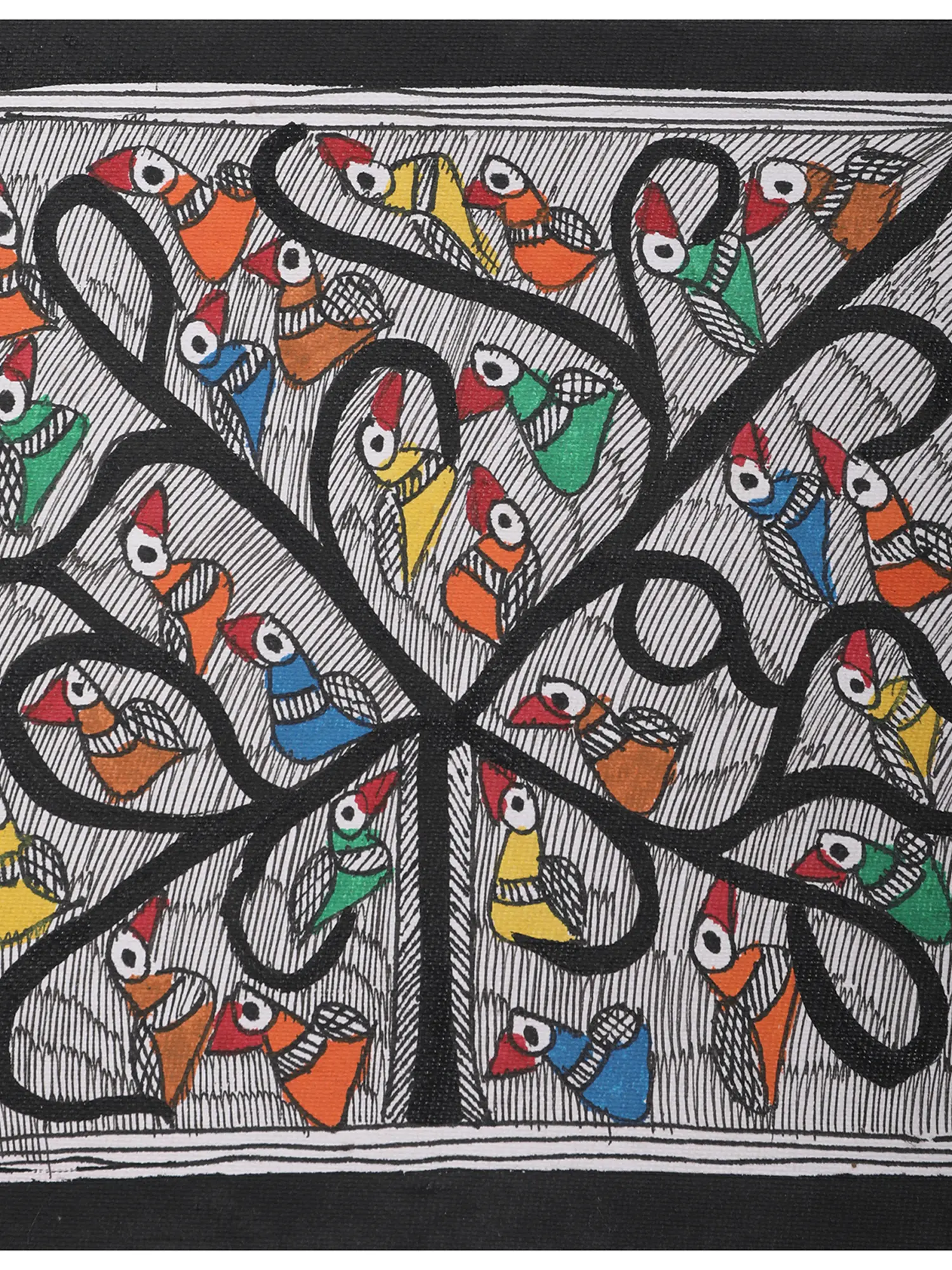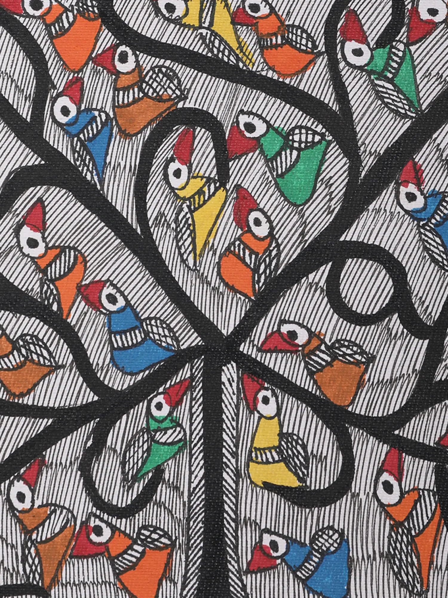 Ajay Kumar Jha Madhubani painting on handmade paper beautifully captures the essence of the Tree of Life. The bountiful branches play host to a diverse group of birds, symbolizing happiness and growth. Each avian presence signifies vitality and harmony within the intricate branches. The clever use of colors on the birds adds a vivid contrast to the predominantly black and white palette, infusing life and vibrancy into the artwork.