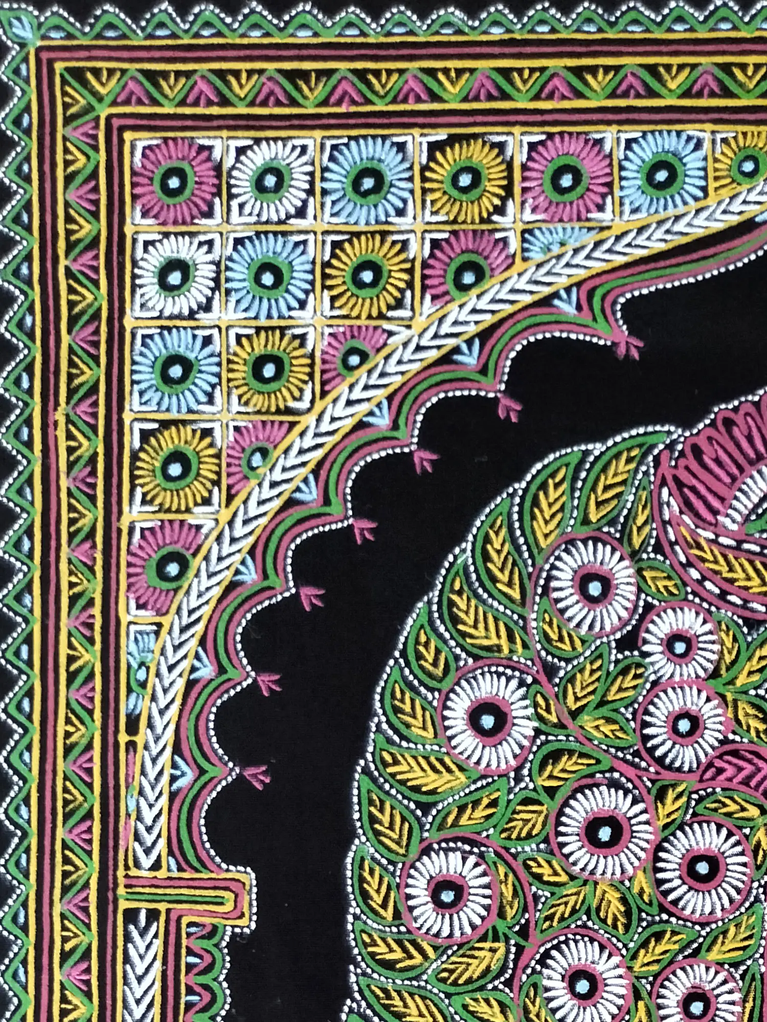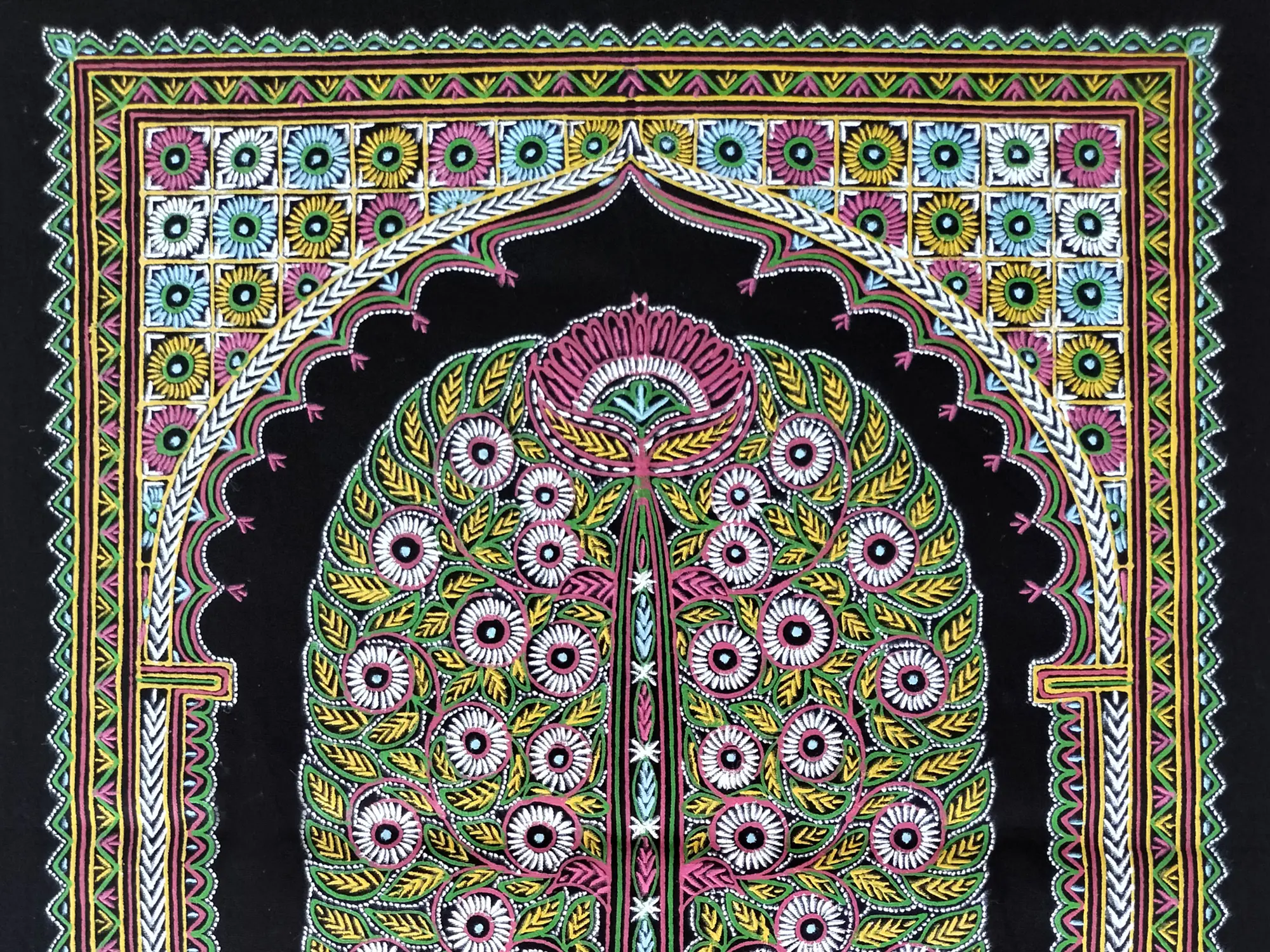 Rizwan Khatri's Tree of Life - Rogan Art is a stunning testament to the exquisite fusion of traditional craftsmanship and natural beauty. Crafted on cotton cloth using the ancient Rogan Art technique, the painting features a vibrant Tree of Life motif. Rogan painting was traditionally a seasonal craft used to embellish various traditional attire components such as Ghaghra, Lehenga, Odhani, Dupatta, Dharajo, and Chabla, as well as household fabrics such as bed sheets, quilts, pillow covers, and small pieces of fabric used to cover dishes; these fabrics were major components of dowry fabrics.