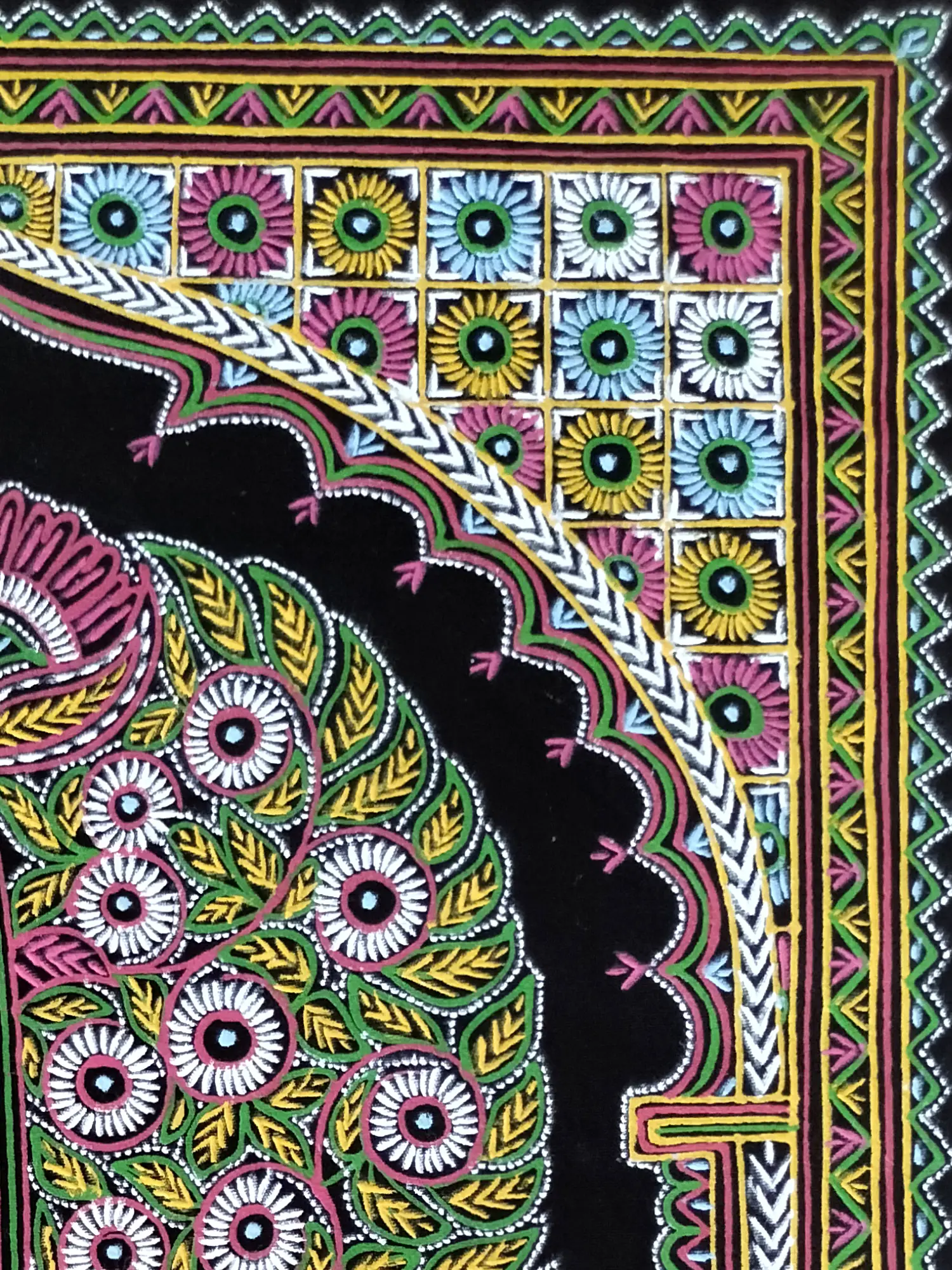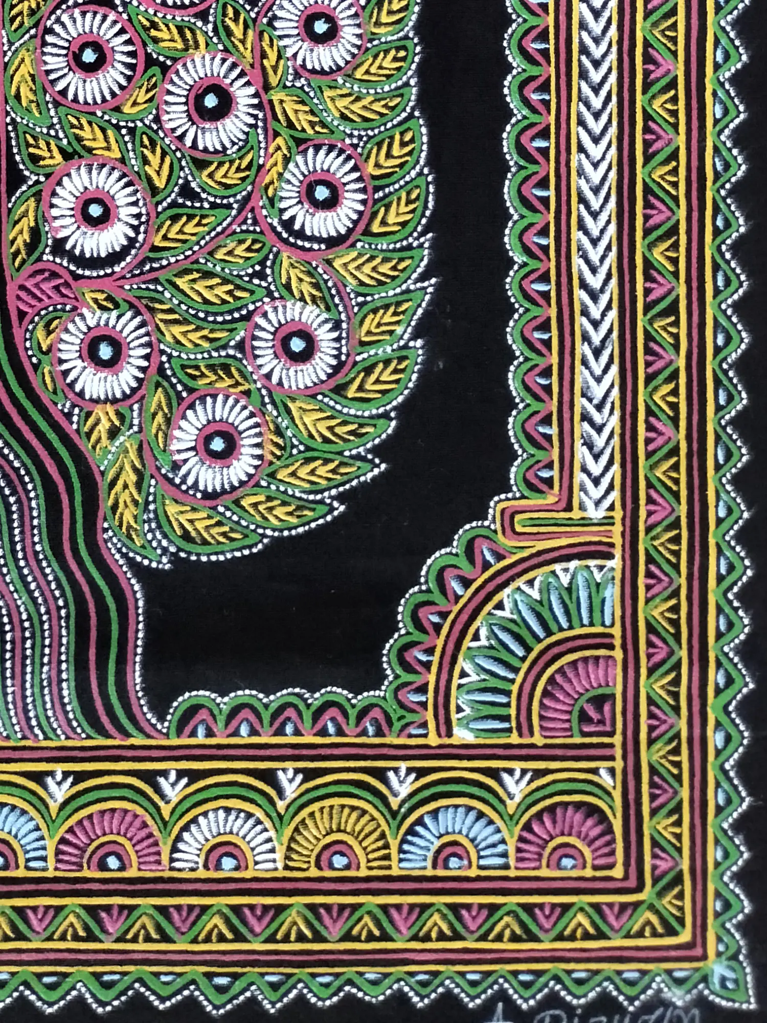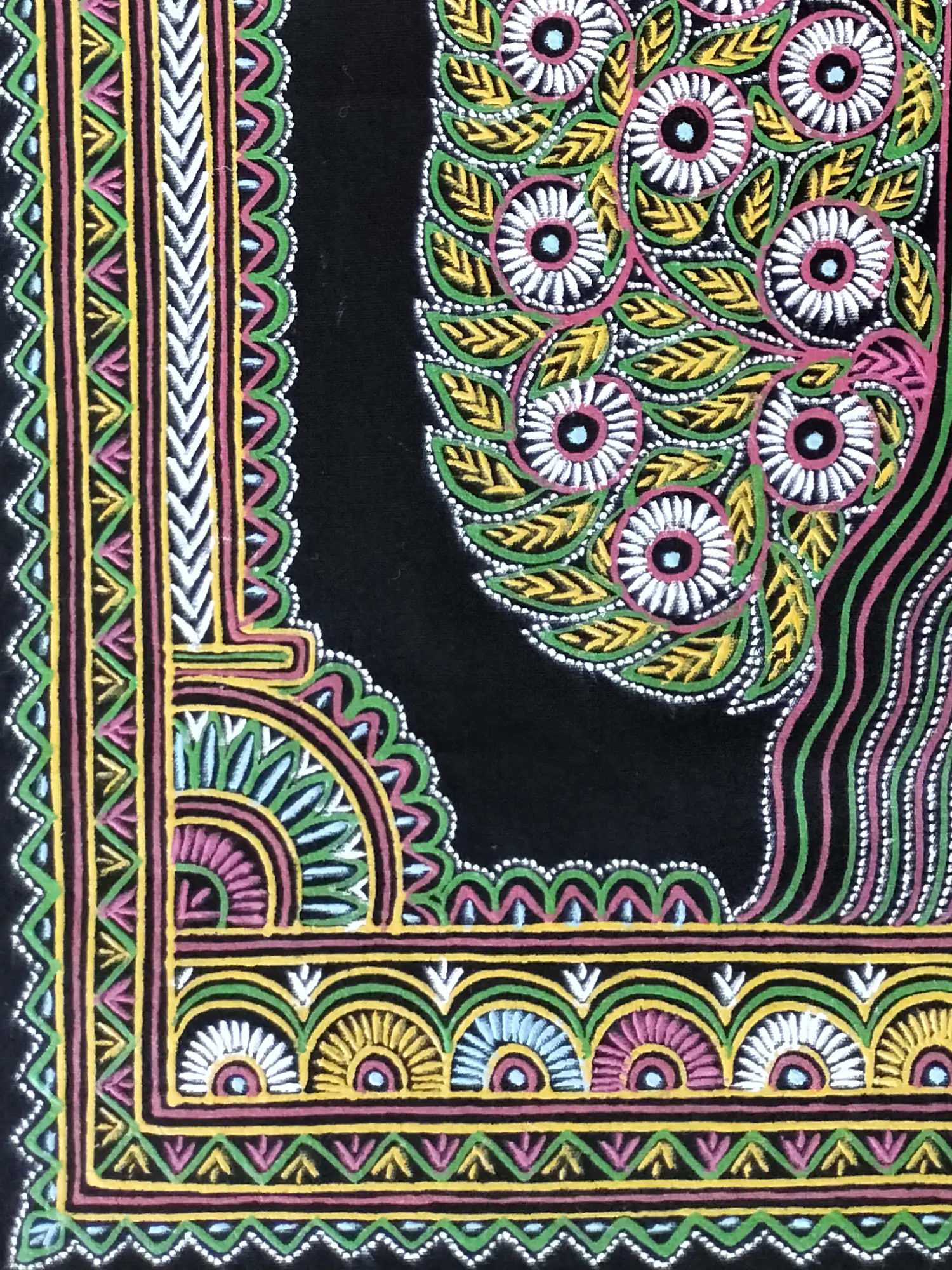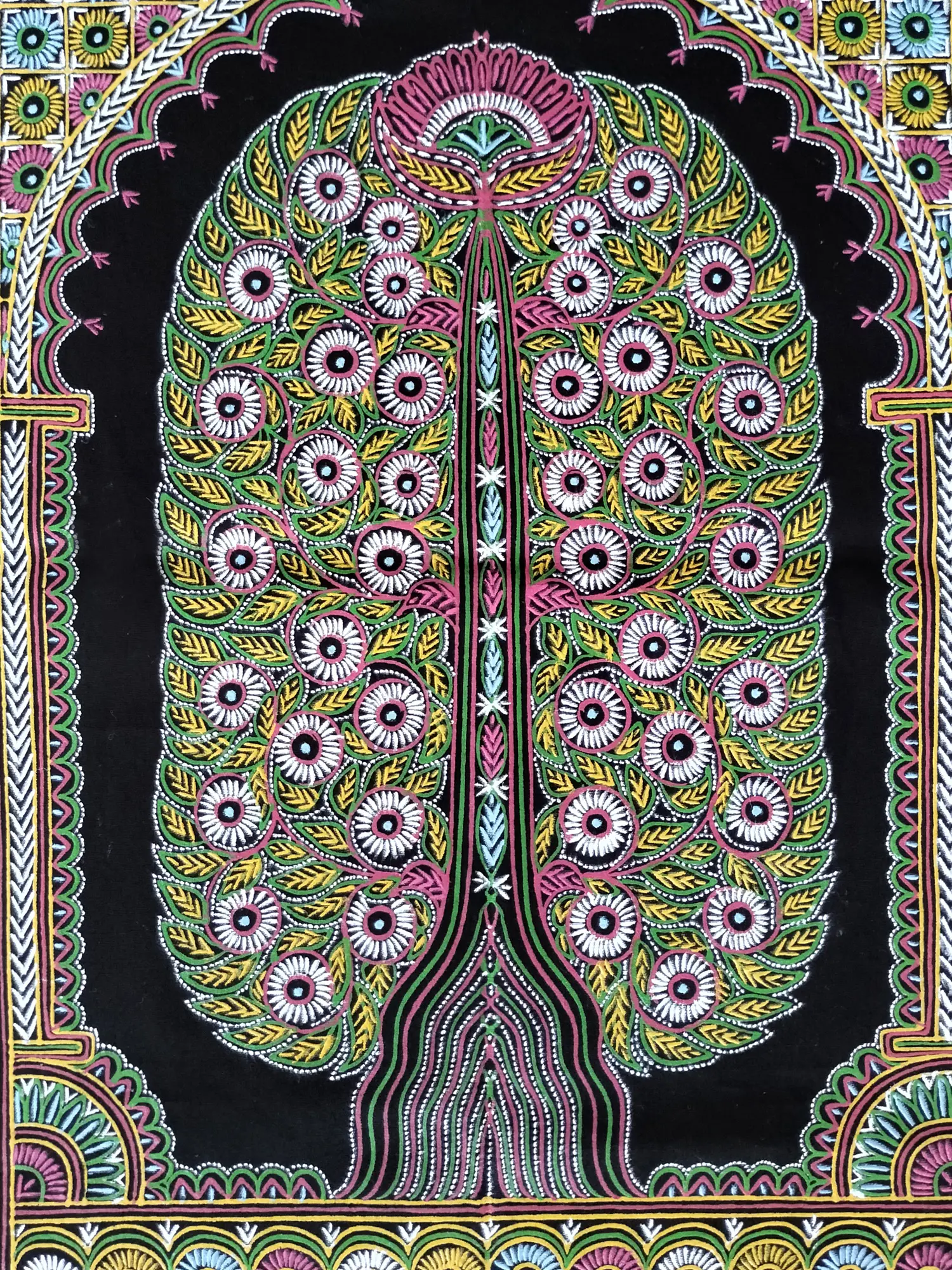 Khatri employs natural mineral colors, creating a rich palette that breathes life into the artwork. The intricate detailing of the tree's branches and foliage showcases the artist's mastery. Utilizing Rogan Art's distinctive natural pigments, this masterpiece becomes a symphony of organic hues on cotton canvas, exemplifying Khatri's dedication to preserving heritage and creating a masterpiece that resonates with the earthy beauty of natural mineral colors.