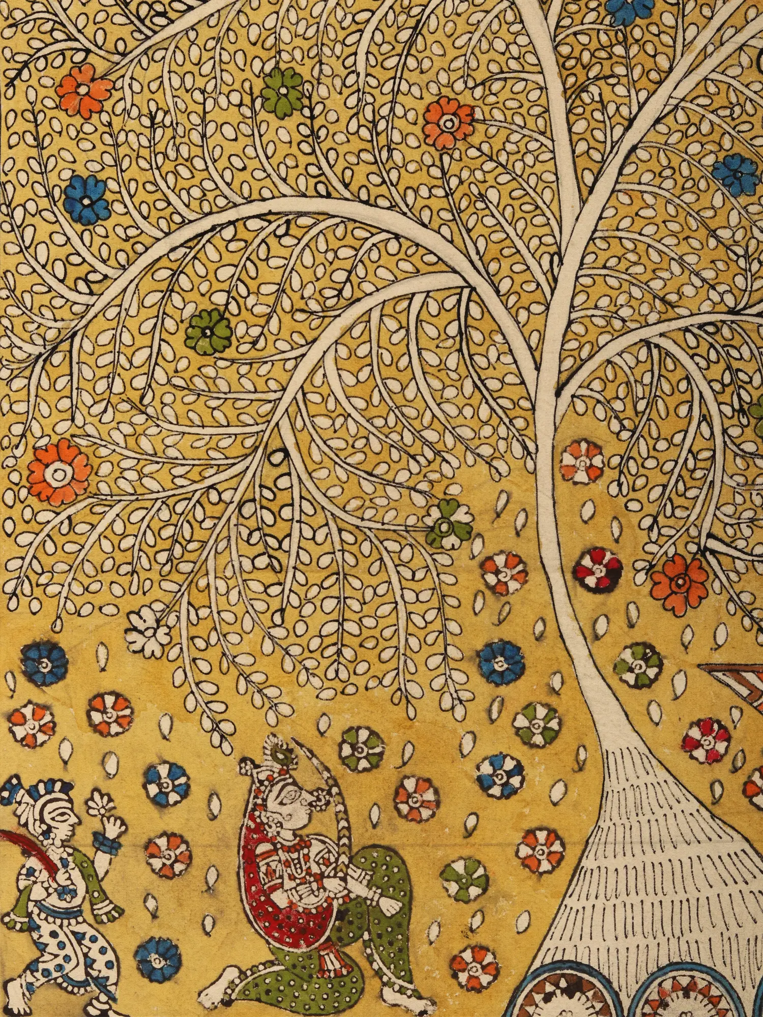 This stunning piece is crafted on high-quality Madarpat cotton, a fabric known for its softness and durability. The vibrant colors and fine detailing are achieved through a meticulous hand-painting process. The 26x26 inch dimensions make this a perfect statement piece for any home or collection, easily capturing attention and adding a rich cultural touch to any space. The use of Madarpat cotton contributes to the artwork's unique texture and aesthetic appeal, allowing the colours to truly shine. The hand-painted details create a stunning effect, visible in the intricate work of the foliage and the depiction of the divine figure.