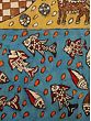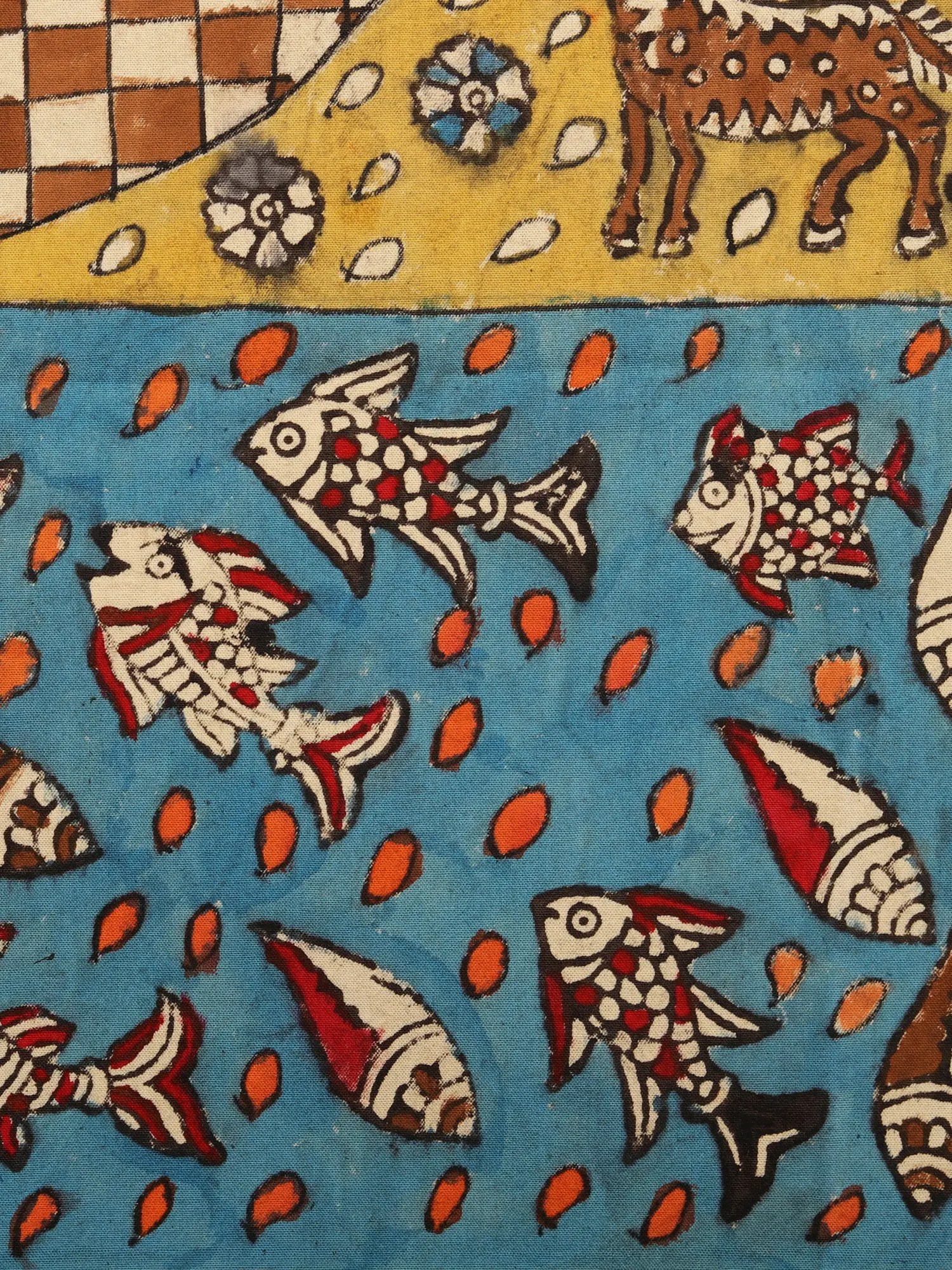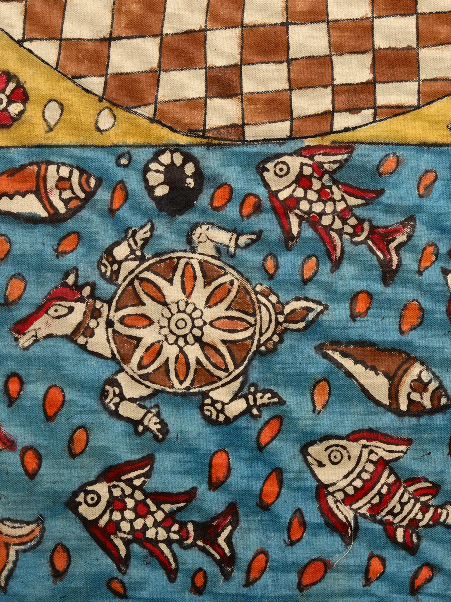 The composition isn't simply decorative; it's a story woven in vibrant color and meticulous detail. The figures surrounding the central deity, the checkered board-like platform, and the lively aquatic scene at the bottom—all contribute to a rich narrative. The checkered board can represent the duality of the universe, the constant interplay of light and dark, or even a game of fate. The aquatic life below symbolizes the nurturing power of the earth, while the other figures add to the depth of storytelling within the artwork. These detailed elements are what make Mata Ni Pachedi paintings unique and captivating, inviting viewers into a world of spiritual significance and cultural symbolism.