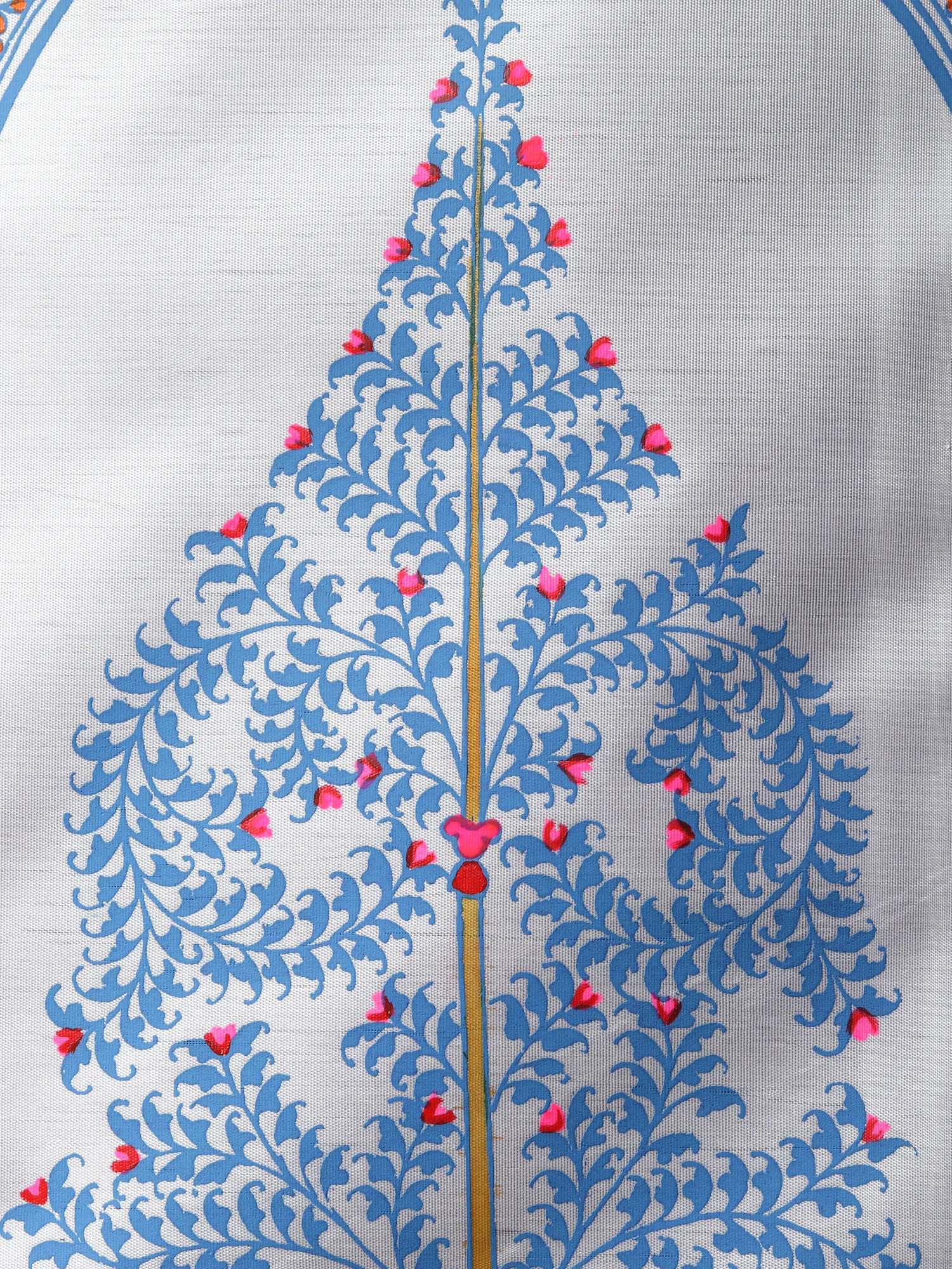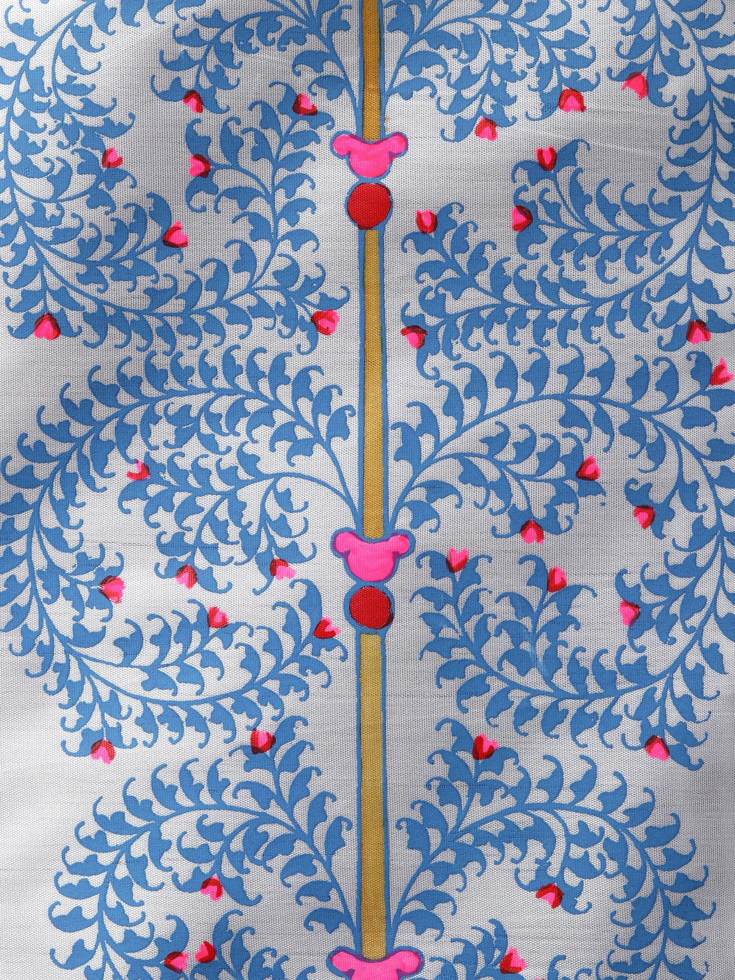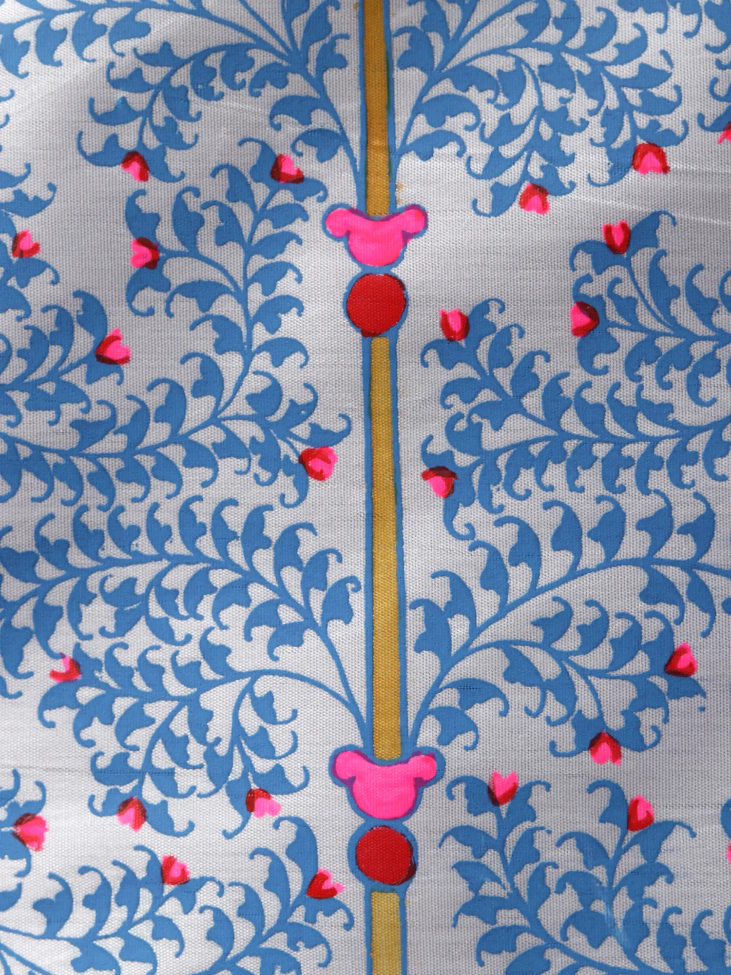 You'll appreciate the captivating composition, a majestic tree rendered in captivating shades of blue, its branches adorned with delicate pink blossoms and the occasional crimson fruit. A golden trunk serves as the grounding element, rising from a base framed by an ornamental border in soothing blues and vibrant oranges, each detail thoughtfully placed to create a harmonious visual experience. The interplay of light and shadow on the silk adds a unique dimension, imbuing the artwork with a gentle radiance that draws the viewer in. Its slender form, measuring 16.5 inches in height and 6.5 inches in width, makes it a versatile statement piece.