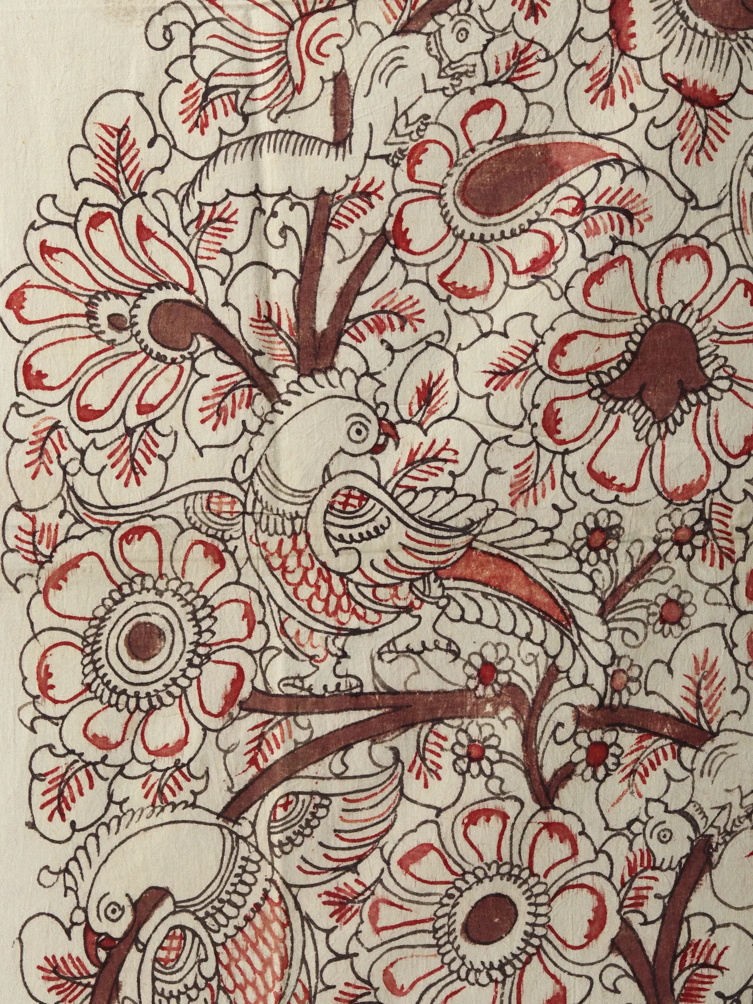 The composition is a rich tapestry of life, featuring a majestic tree teeming with a myriad of birds, their forms gracefully integrated amongst overflowing blossoms. This expansive textile, measuring an impressive 70.50 inches in height and 42.00 inches in width, commands attention and transforms any wall into a gallery of natural wonder. The harmonious blend of deep reds and subtle earthy tones against the creamy cotton canvas creates a visual dialogue that is both striking and serene, inviting closer inspection of its many delightful details.