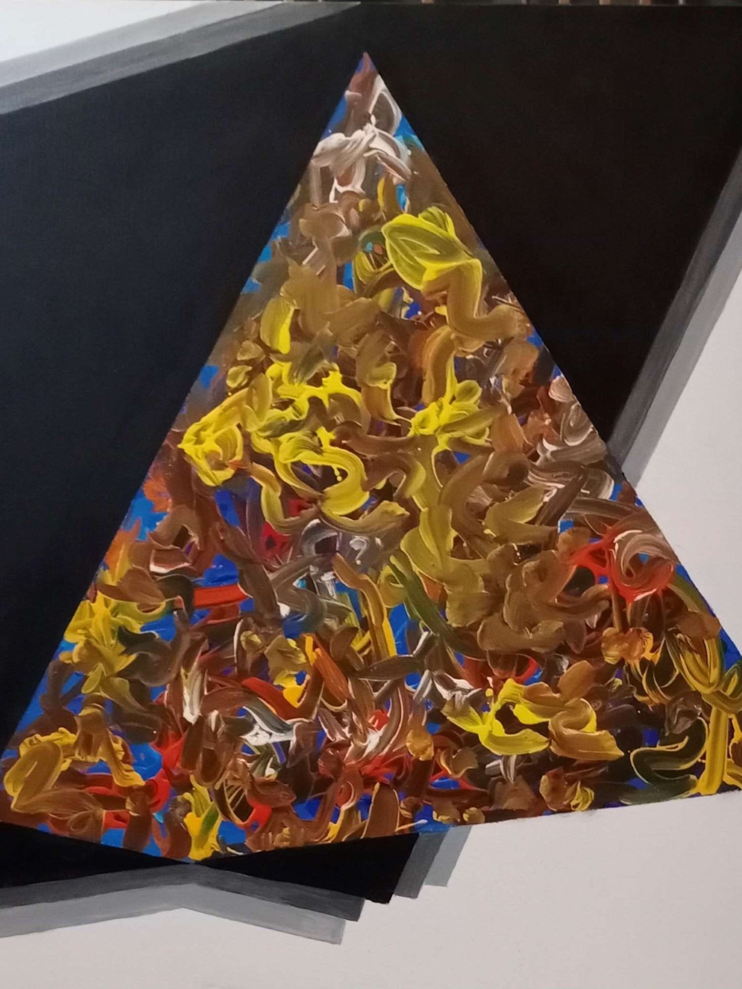 The composition is anchored by a striking triangular form, its edges sharp and defined against a subtly layered background of black and grey planes. Within this geometric structure, a symphony of colors unfolds, with bold strokes of golden yellow, earthy browns, and vivid blues and reds intermingling. The textural application of paint creates an energetic dynamism that draws the eye across the surface. This expansive work measures 35.43 inches in height and width, providing a substantial yet balanced presence.