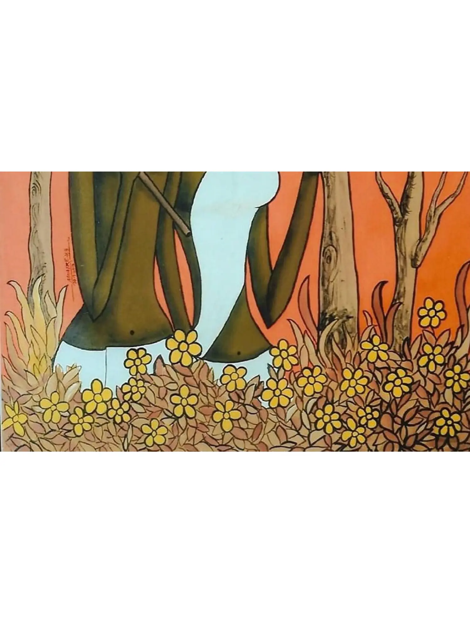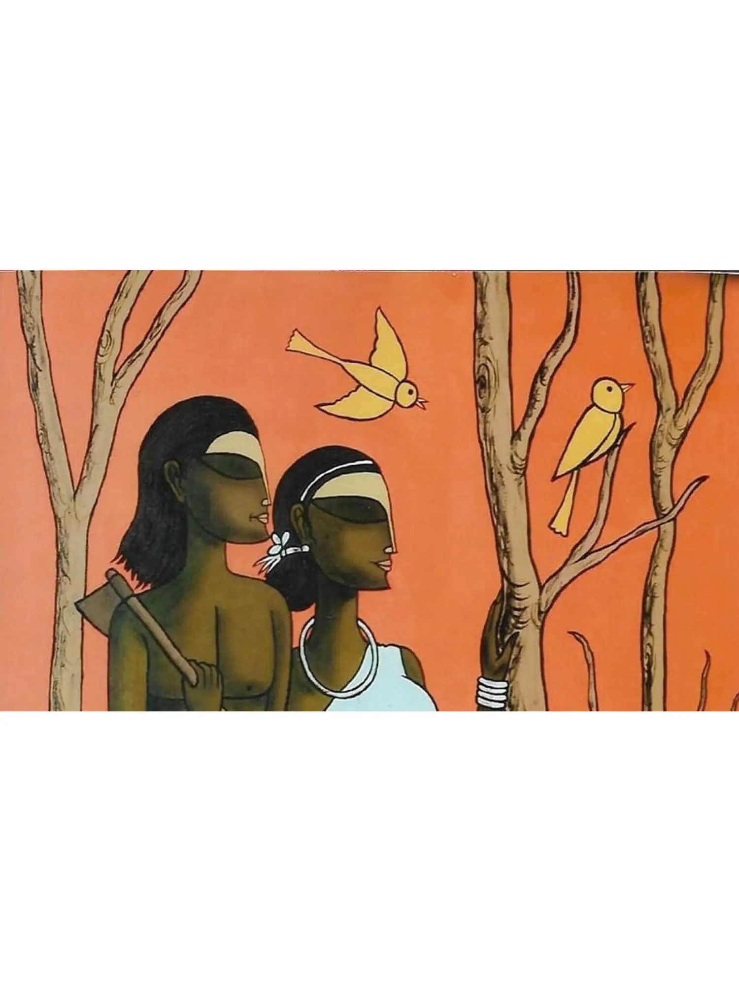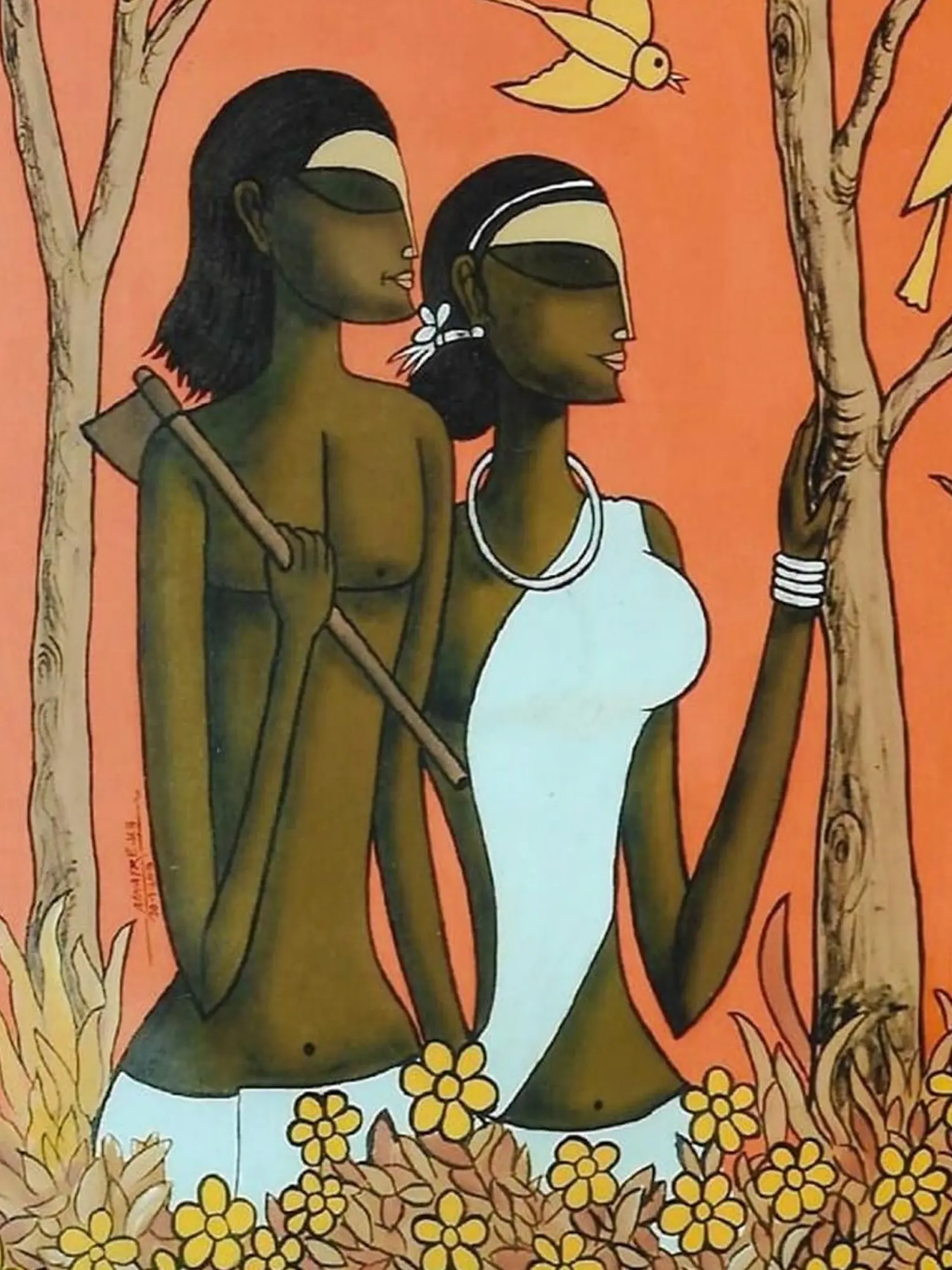 The canvas depicts a tribal couple in the wilderness, the man holding an ax and the woman holding the tree as the bird residing in its branch’s flies away. A lovely orange in the sky and a bed of flowers in the foreground add to the natural beauty of this artwork, a window to the symbiotic lives of Indian tribes.