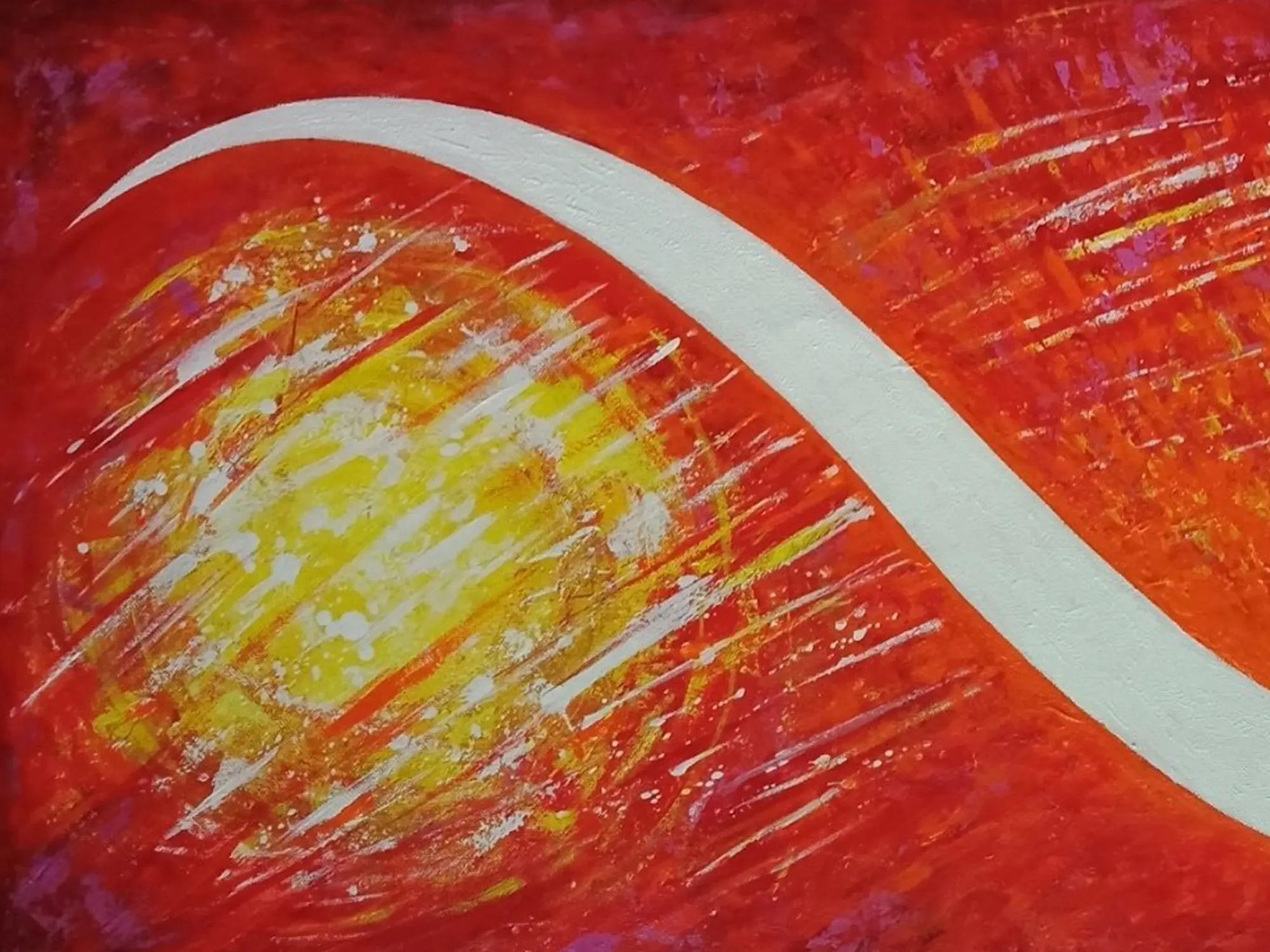 The interplay of bold white lines against a background of fiery reds and sunlit yellows creates a dramatic visual narrative. Measuring sixteen inches in height and thirty-three inches in width, its generous dimensions offer a substantial presence without overwhelming your curated environment. You'll notice the deliberate contrast and the expressive brushwork that conveys a sense of movement and raw power.