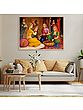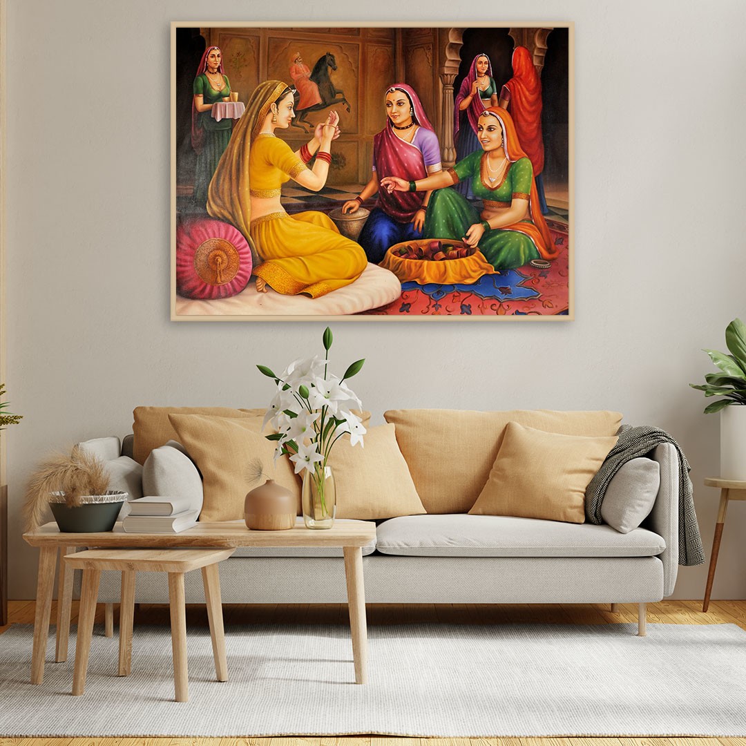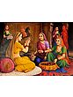 Look keenly at the realistic expressions of each and every lady; the painter has used his utmost skills to portray the happy scene and the blissful feels with the help of their happy-to-go expressions and satisfying gestures. Princess is attired here in an elegant and simple deep yellow lehenga, decorated with a self-textured floral border. Although garbed in a yellow garment, but she prefers to buy red and golden combination bangles, because her lover (prince) likes this color of love ornamented on her. The sweet smile and sparkling eyes of the princess depict her fascination towards the bangles and the thought of her husband’s happiness on seeing them.