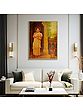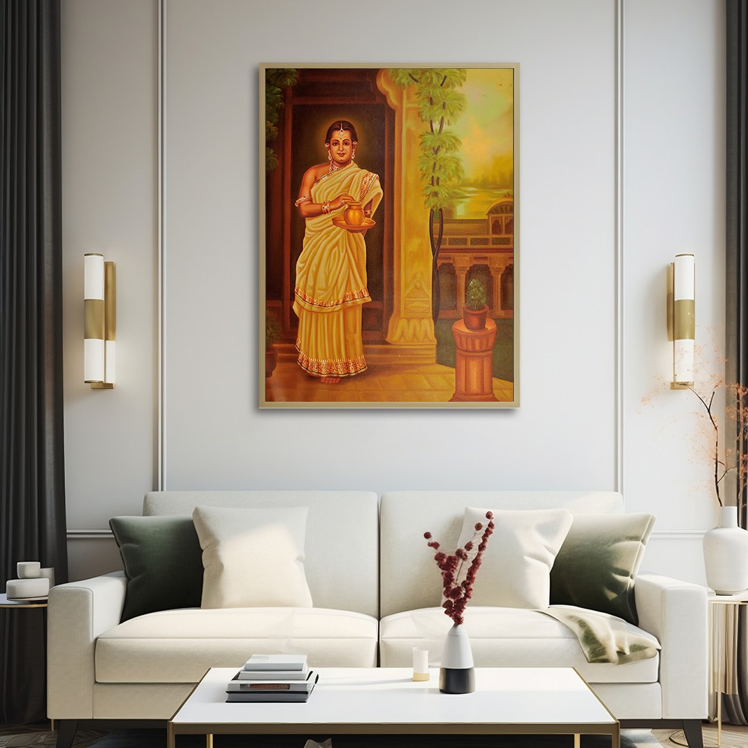 Thick green vine frames the door behind her. In the background, one could see the quarters of the ground floor of her home. A quiet courtyard opens out before it, in keeping with the pre-independence architecture of the homes of the upper classes in India. Into the distance, a gorgeous palette of soft greens and yellows defines the Ganges as She reflects the glamorous rays of the early morning sun.