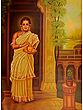 She is clad in a fresh saree of ivory-coloured silk, so new the creases are still intact. Zoom in on the endpiece that she has drawn down the front, lifelike folds painted with bold monotone brushstrokes. A thick brocade of gold defines the border, which is embroidered with a single thread of green. Ample gold ornaments on her person, studded with rubies and emeralds; these are indicative of her status as probably the eldest daughter-in-law. Such is the glow on her face that, in her ivory saree and gold jewellery, she is the very image of Devi Sarasvati.