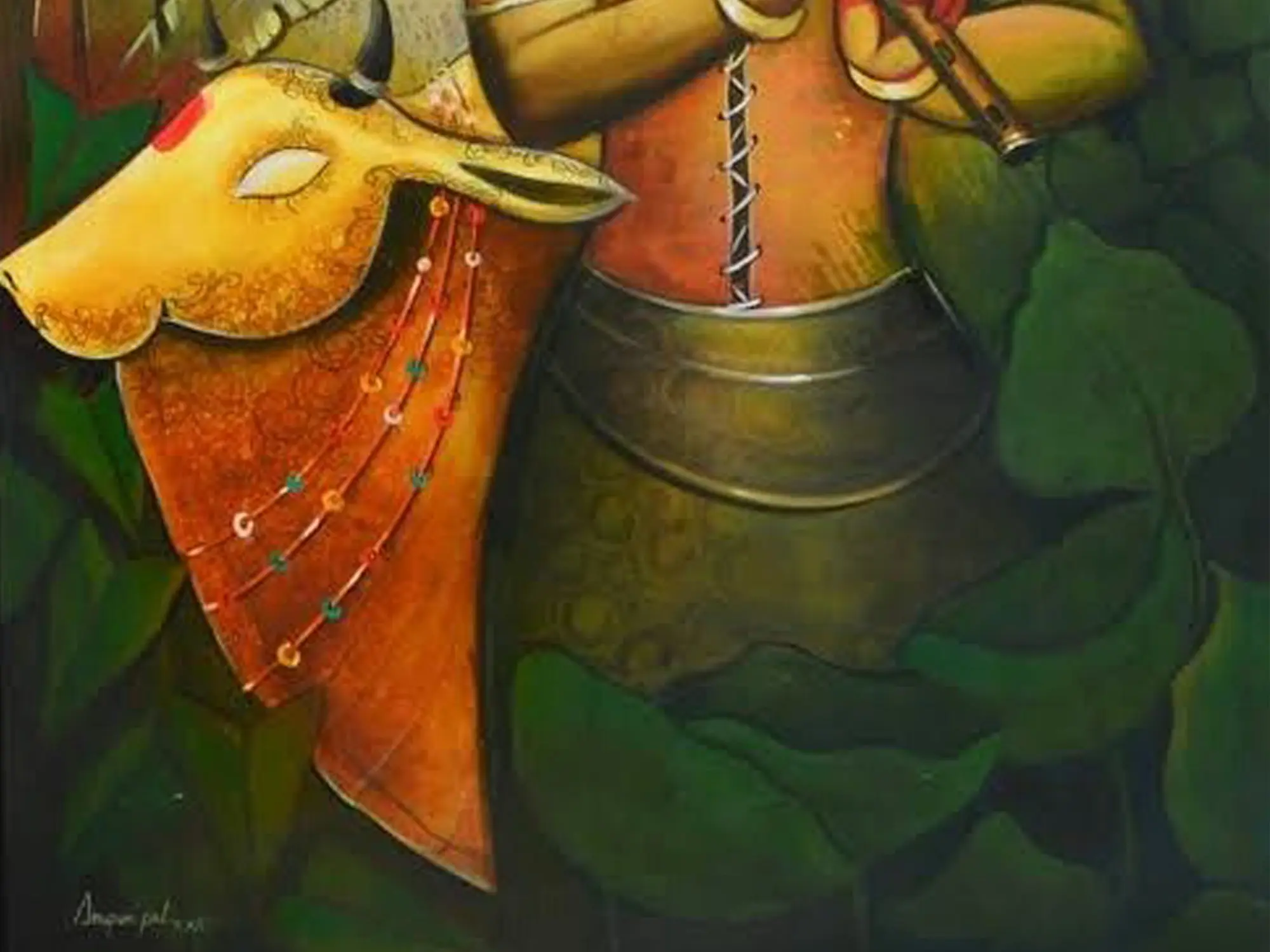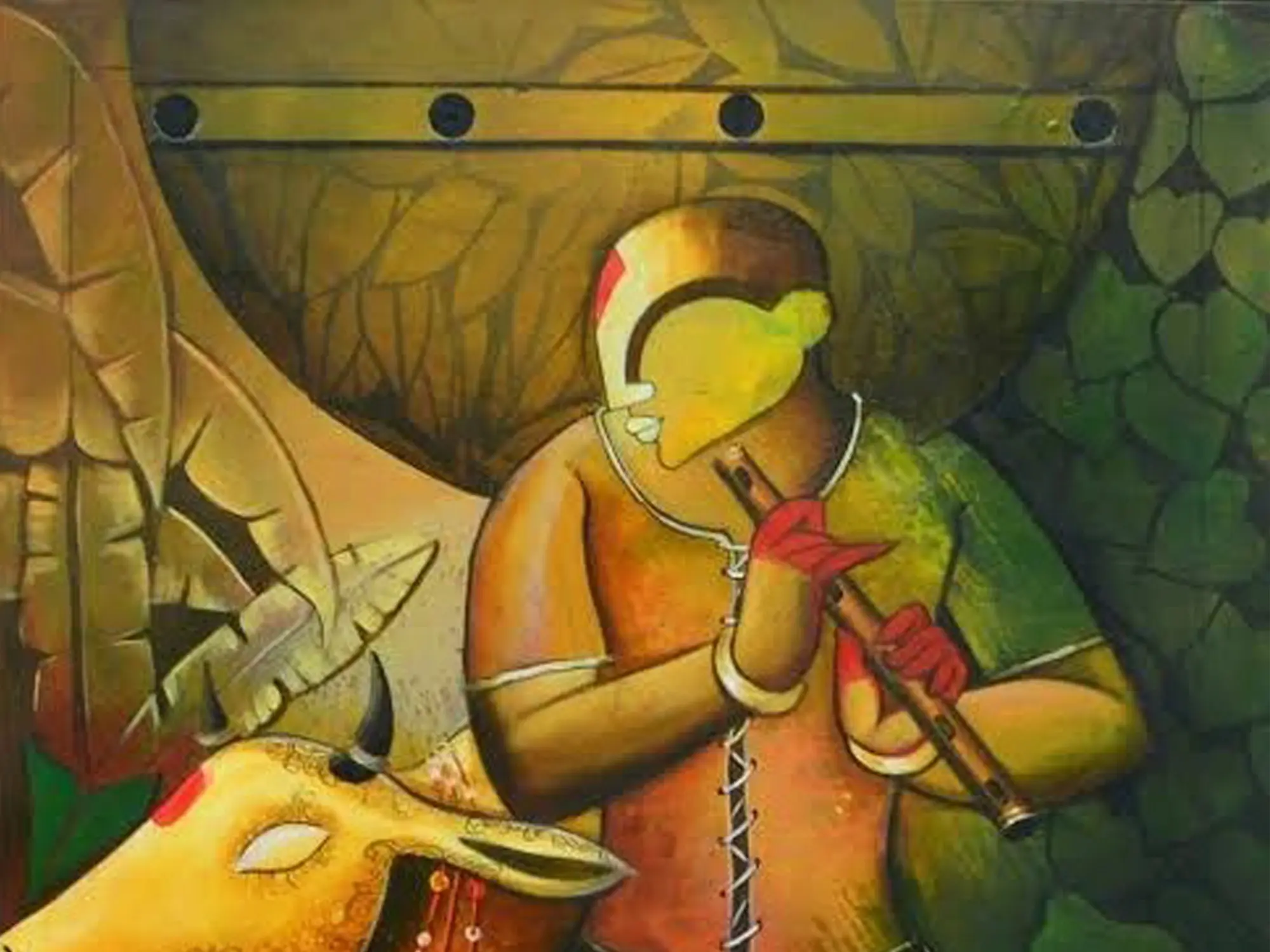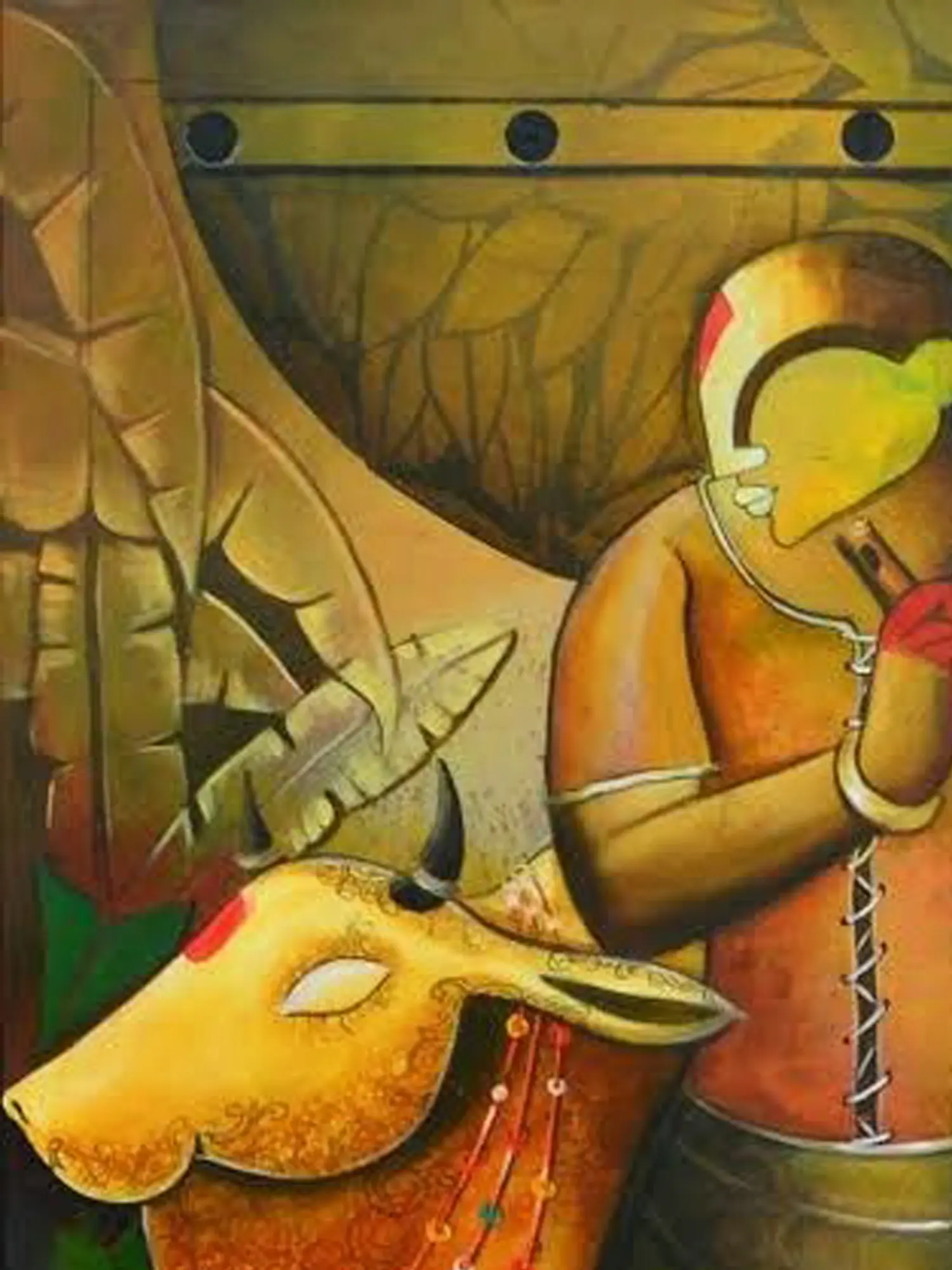 This artwork resonates with the timeless allure of Indian spiritual narratives. The central figure, playing a flute, subtly alludes to divine shepherds who enchanted both gods and mortals with their music. The presence of the adorned cow further grounds the piece in rich cultural symbolism, representing prosperity and earthly bounty. It’s a visual poem that speaks to an ancient yet ever-present spirit.