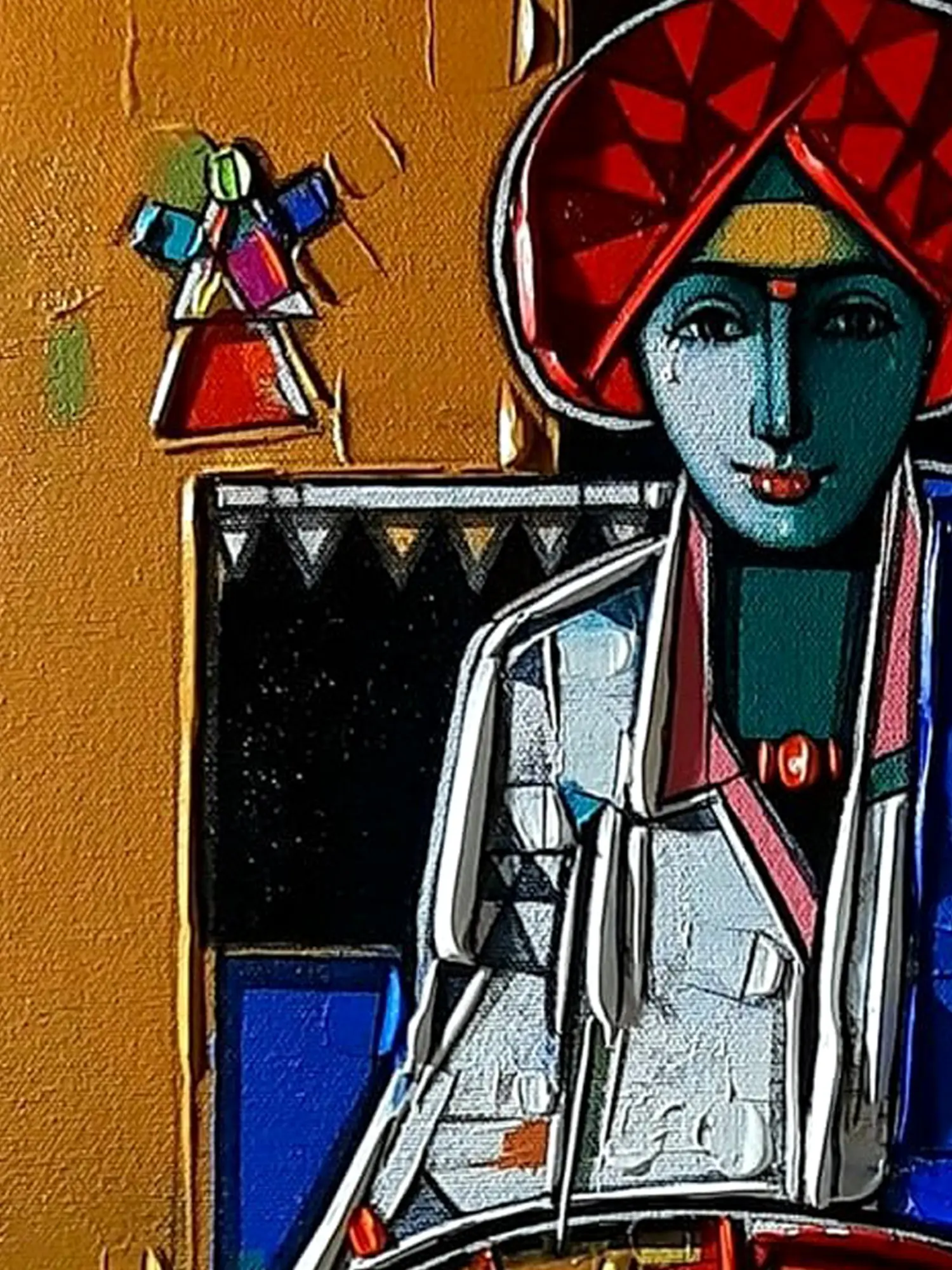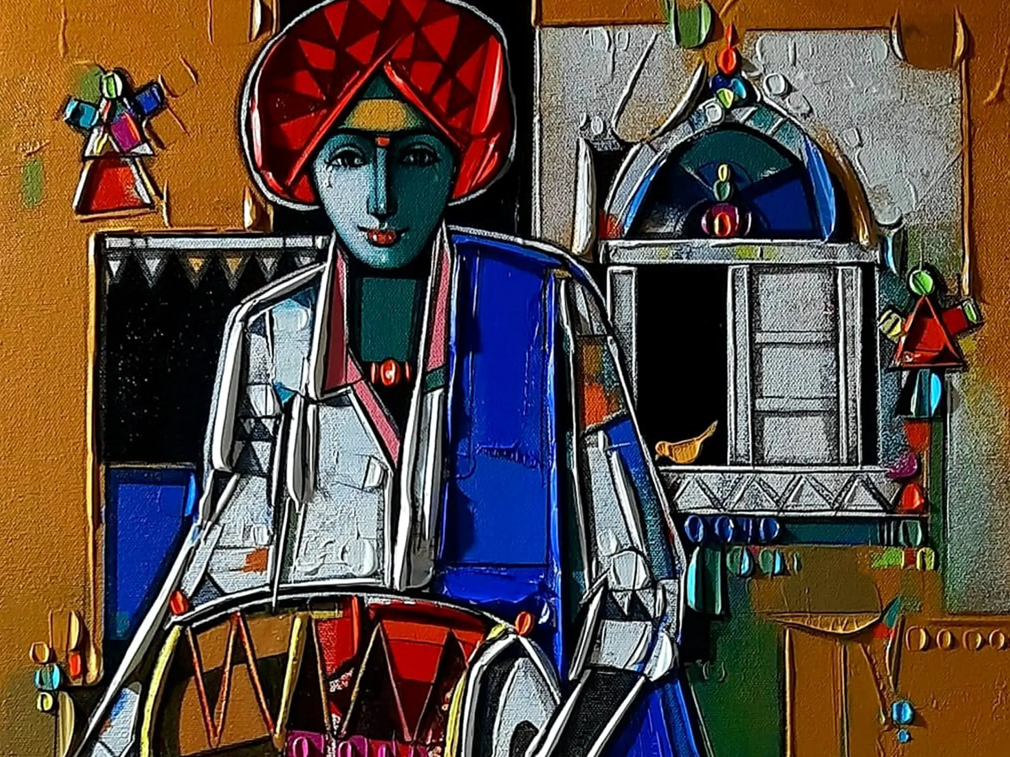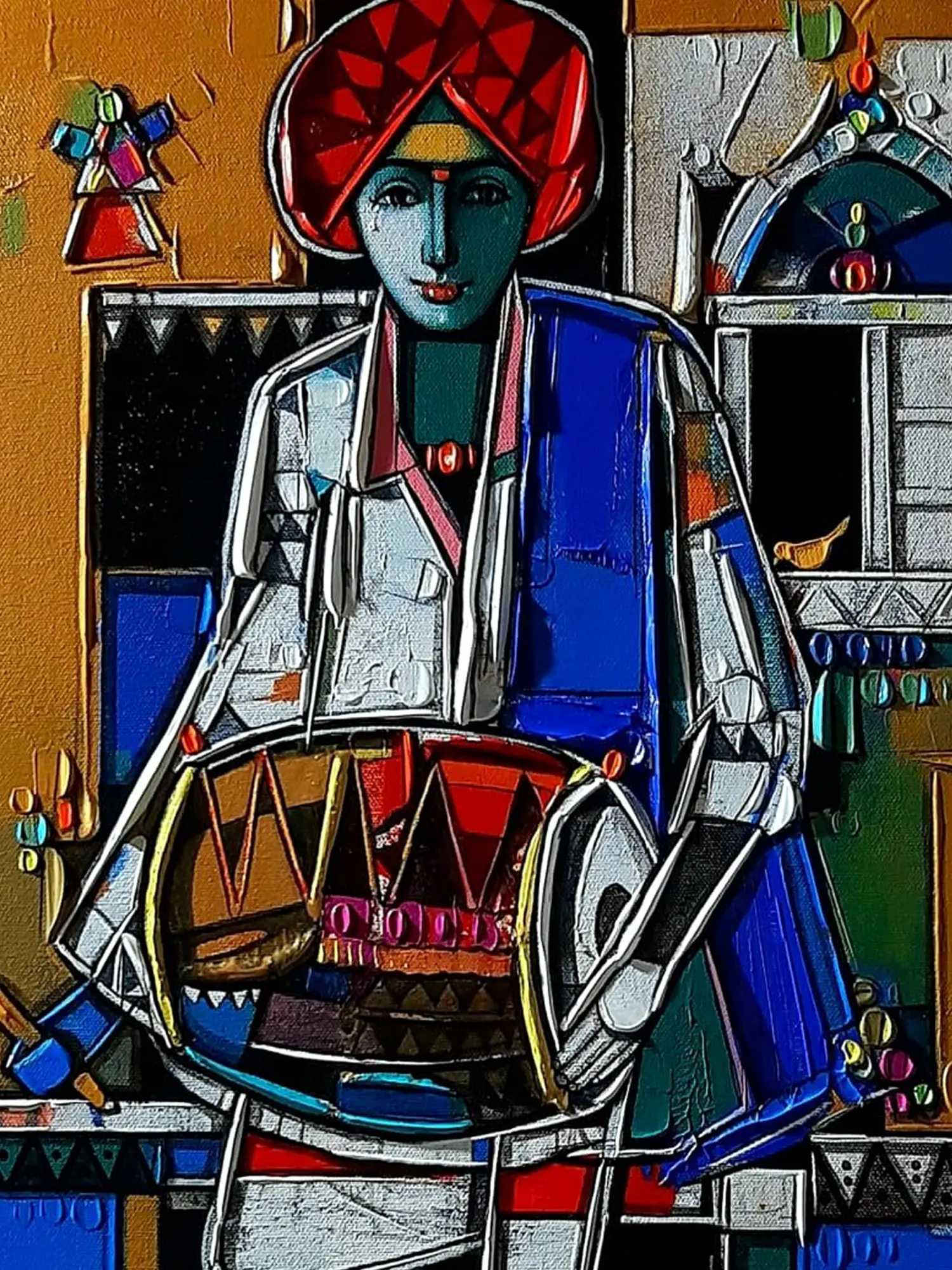 The dimensionality of this artwork, measuring 18 inches in height and 17 inches in width, allows it to command attention without overwhelming your space. You'll appreciate the interplay of bold lines and vibrant hues, from the striking red turban to the deep blues and earthy tones. The textured application of paint imbues the subject with a remarkable presence, making the drum and attire appear almost tangible and adding a captivating sense of depth and character.