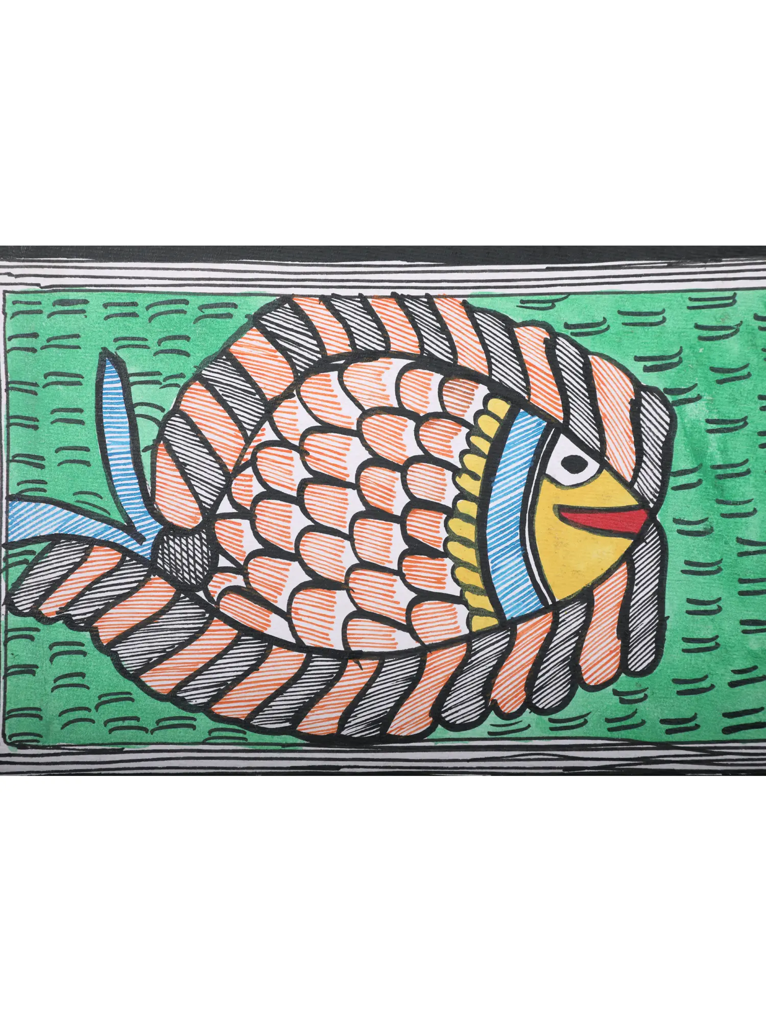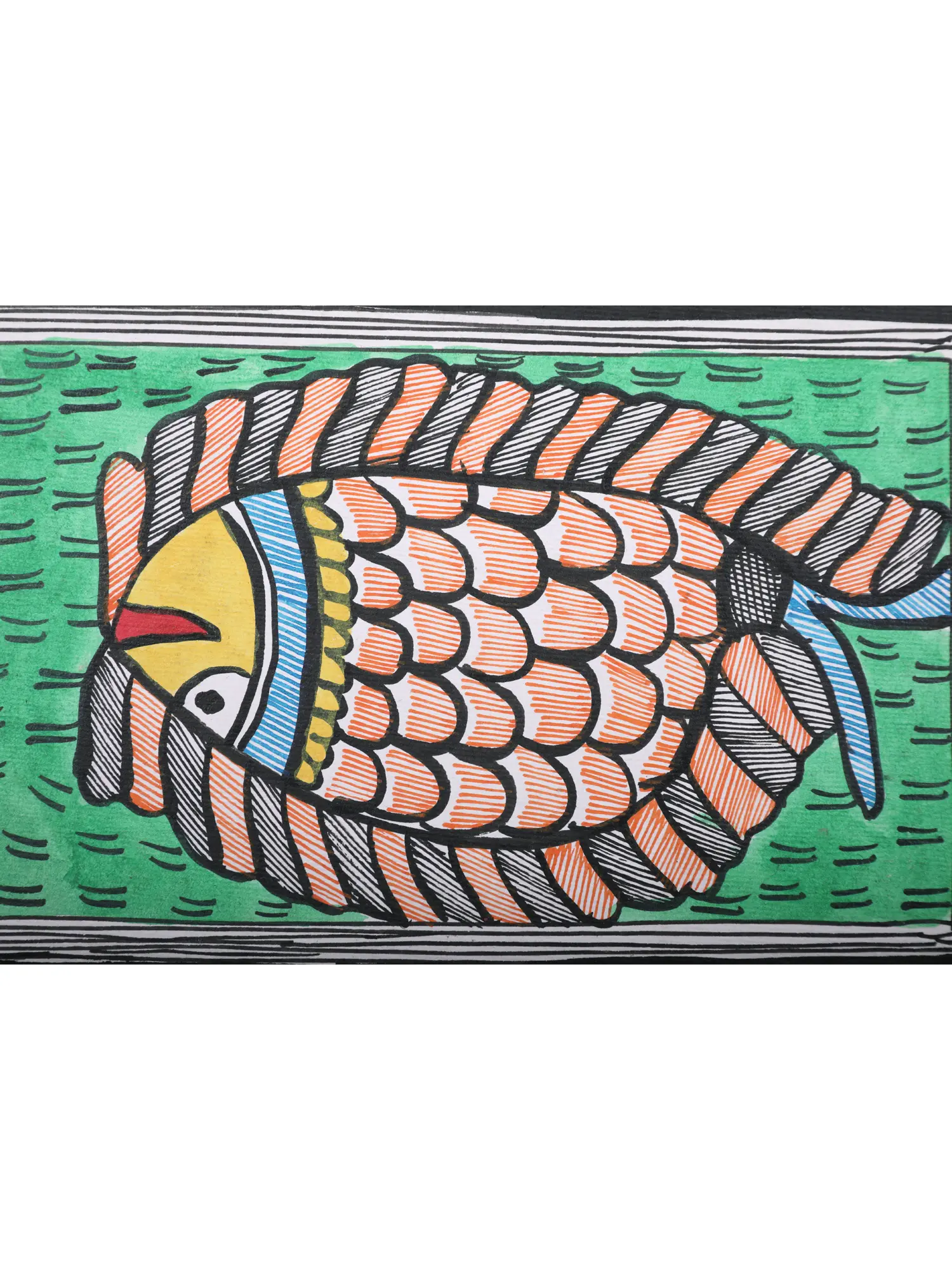 This charming handmade paper artwork features a pair of intertwined fish. In Hindu mythology, the intertwined fish (Matsya Yantra) symbolise the inseparable bond between Purusha and Prakriti, the masculine and feminine aspects of the divine. This artwork celebrates the concept of duality and the harmonious balance that exists within the universe.