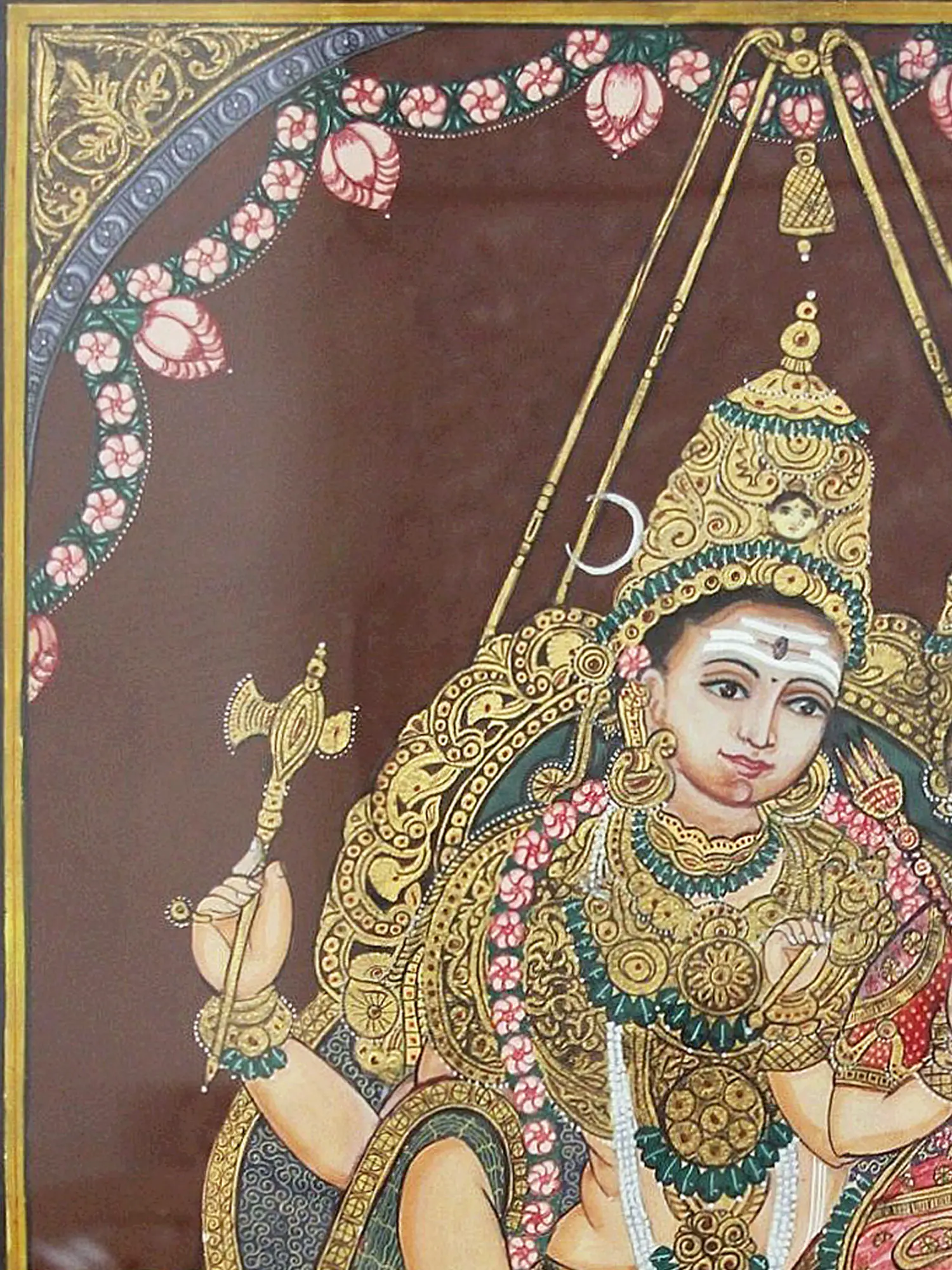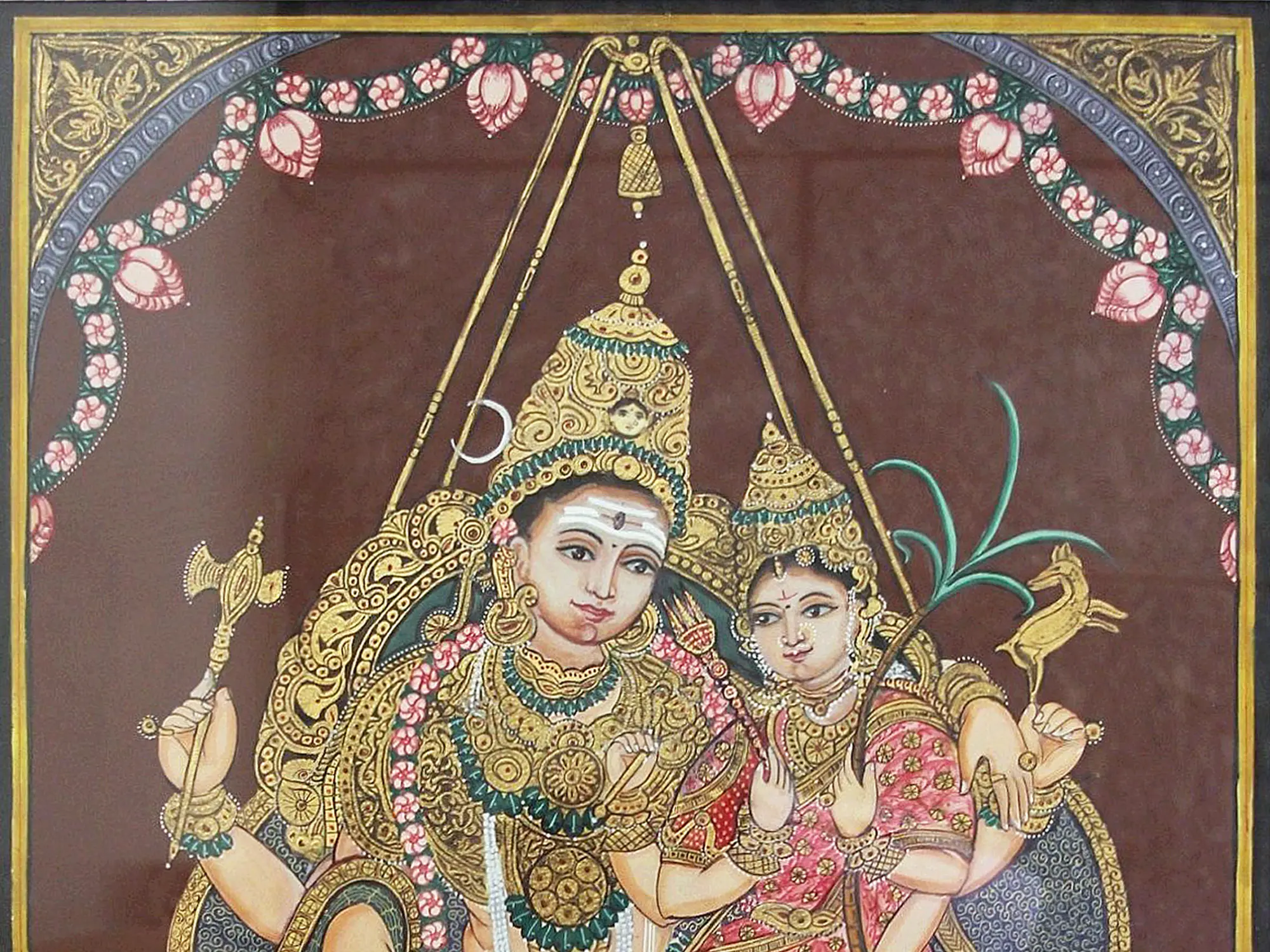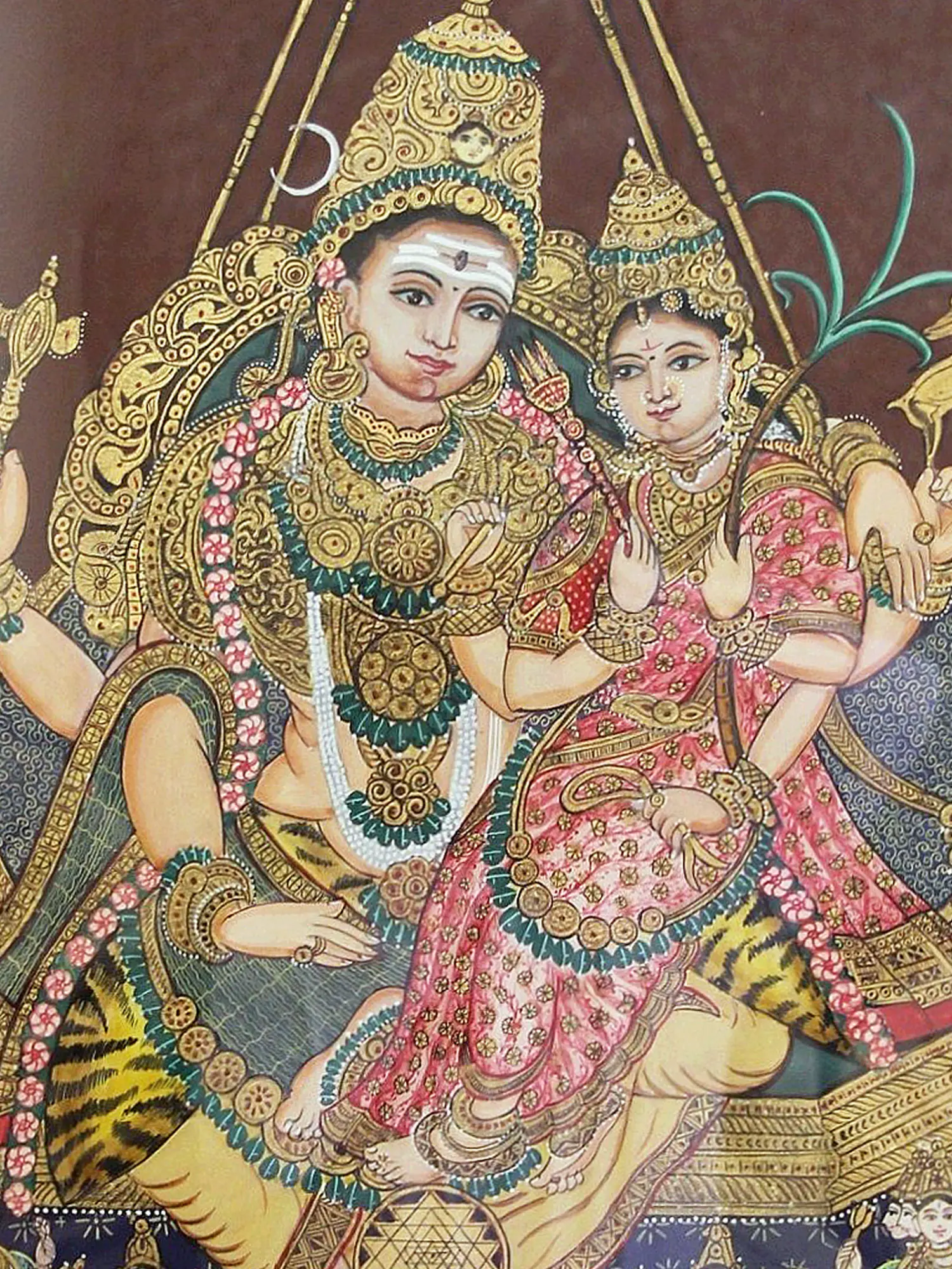 This opulent Mysore painting showcases the divine union of Uma (Parvati) and Maheshwar (Shiva) through the application of gold foil work. The shimmering gold accents elevate the figures, highlighting their divine status.