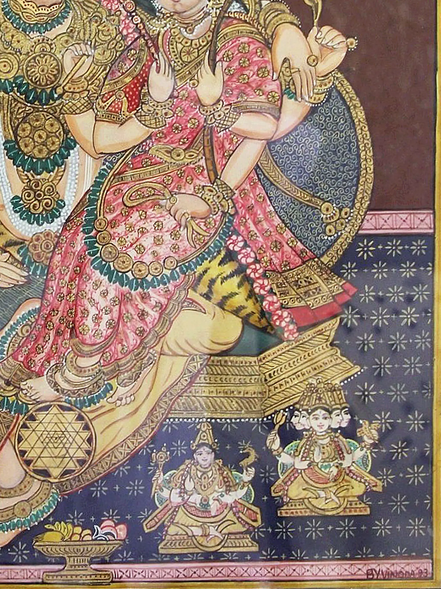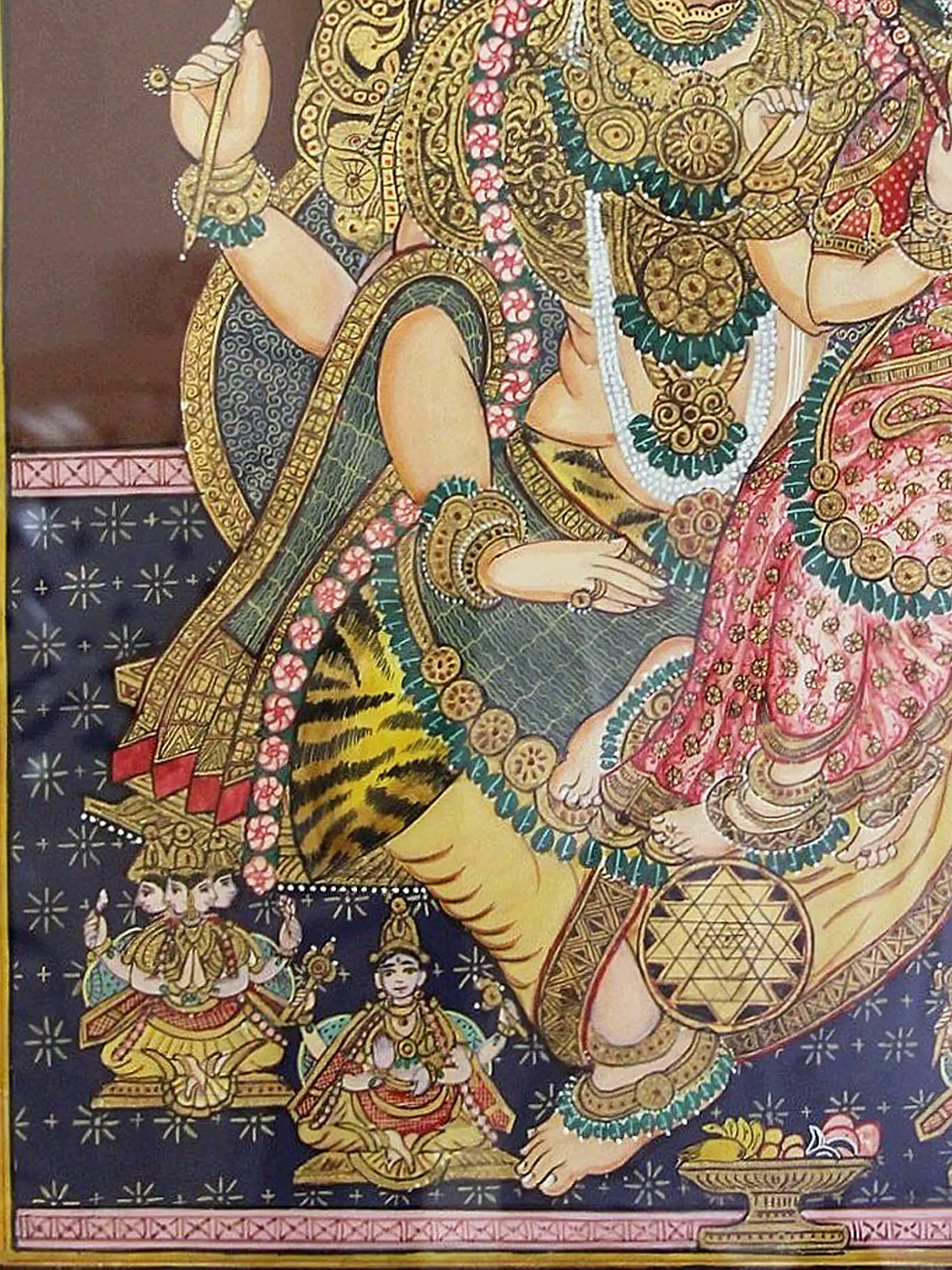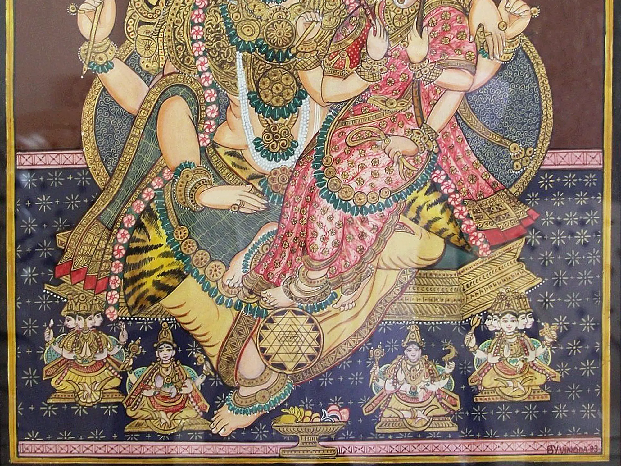This opulent Mysore painting showcases the divine union of Uma (Parvati) and Maheshwar (Shiva) through the application of gold foil work. The shimmering gold accents elevate the figures, highlighting their divine status.