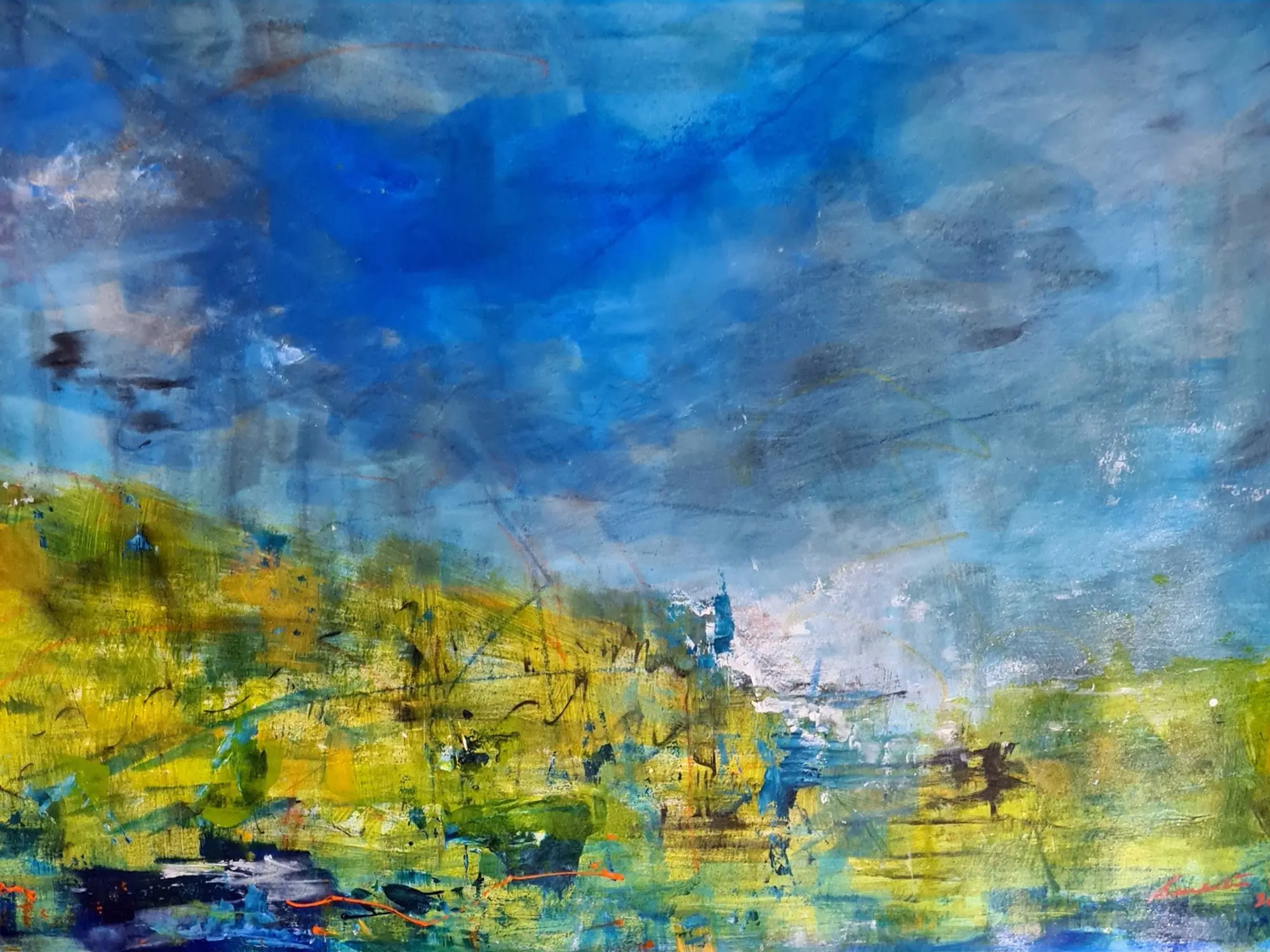 The expansive 24x36-inch format provides a commanding presence, allowing the viewer to get lost in its dynamic interplay of color and form. Vibrant greens and yellows evoke the warmth of the earth, while the deep blues and grays of the sky suggest depth and possibility. The expressive charcoal lines add a spirited energy, anchoring the composition and guiding the eye through the landscape.