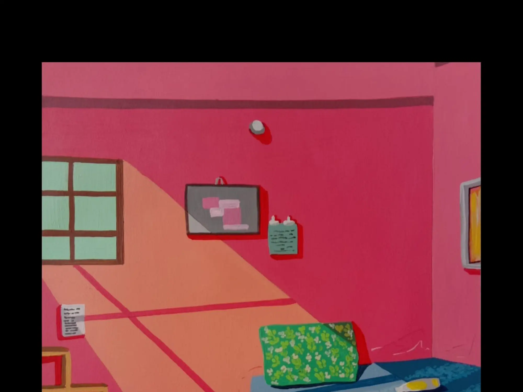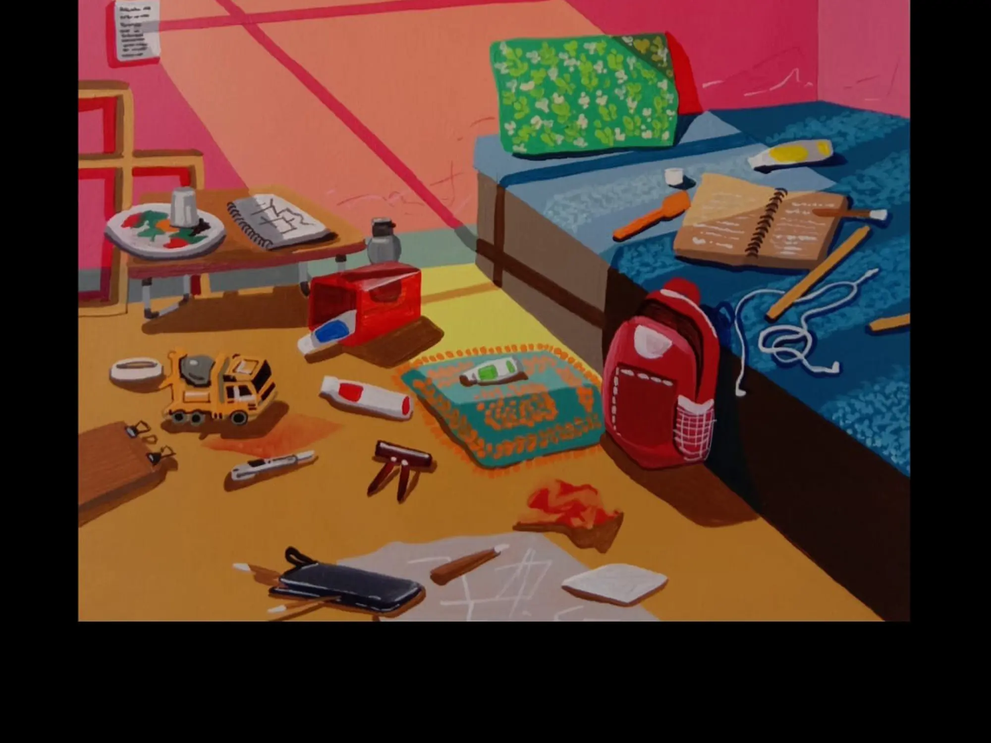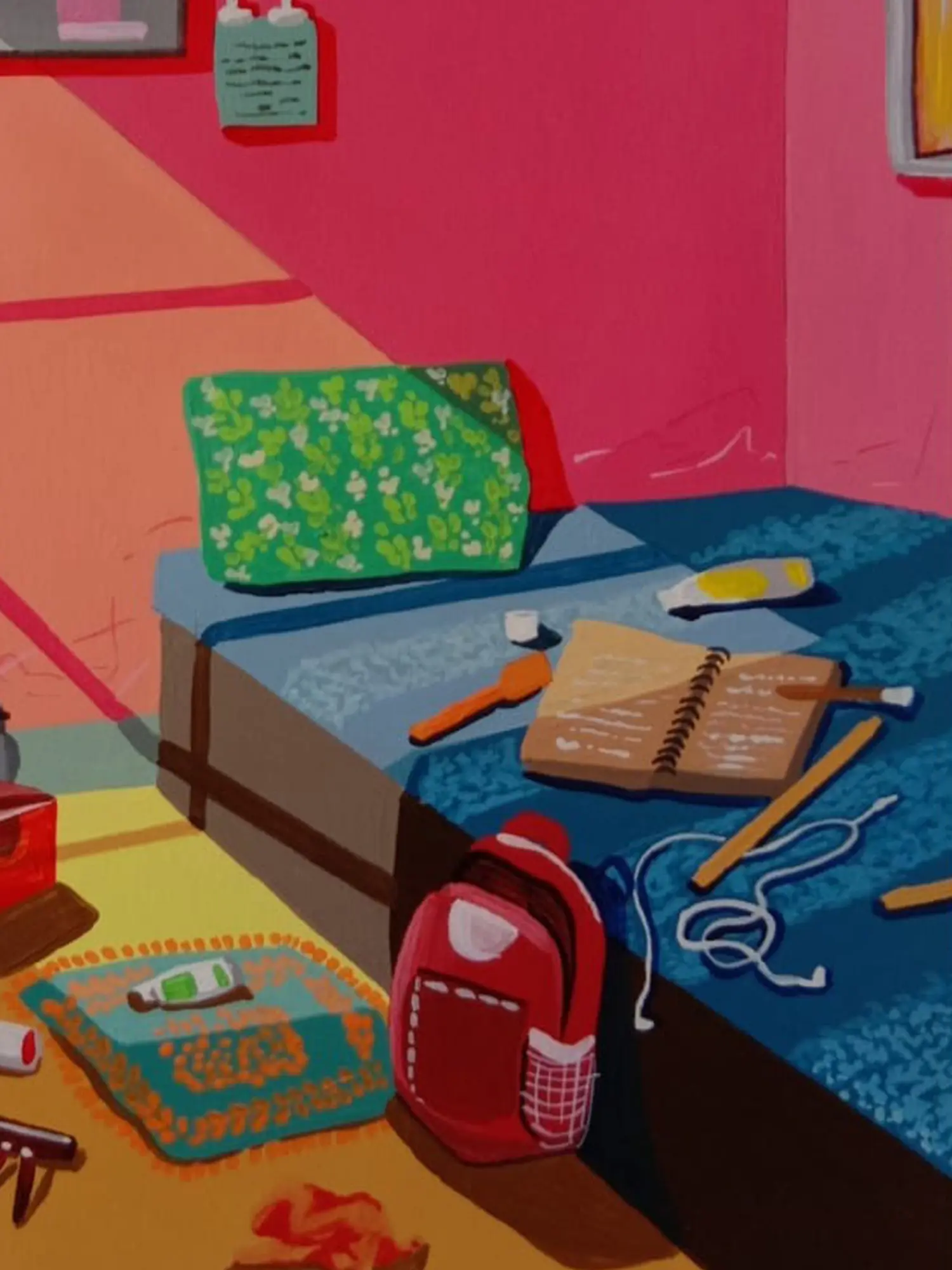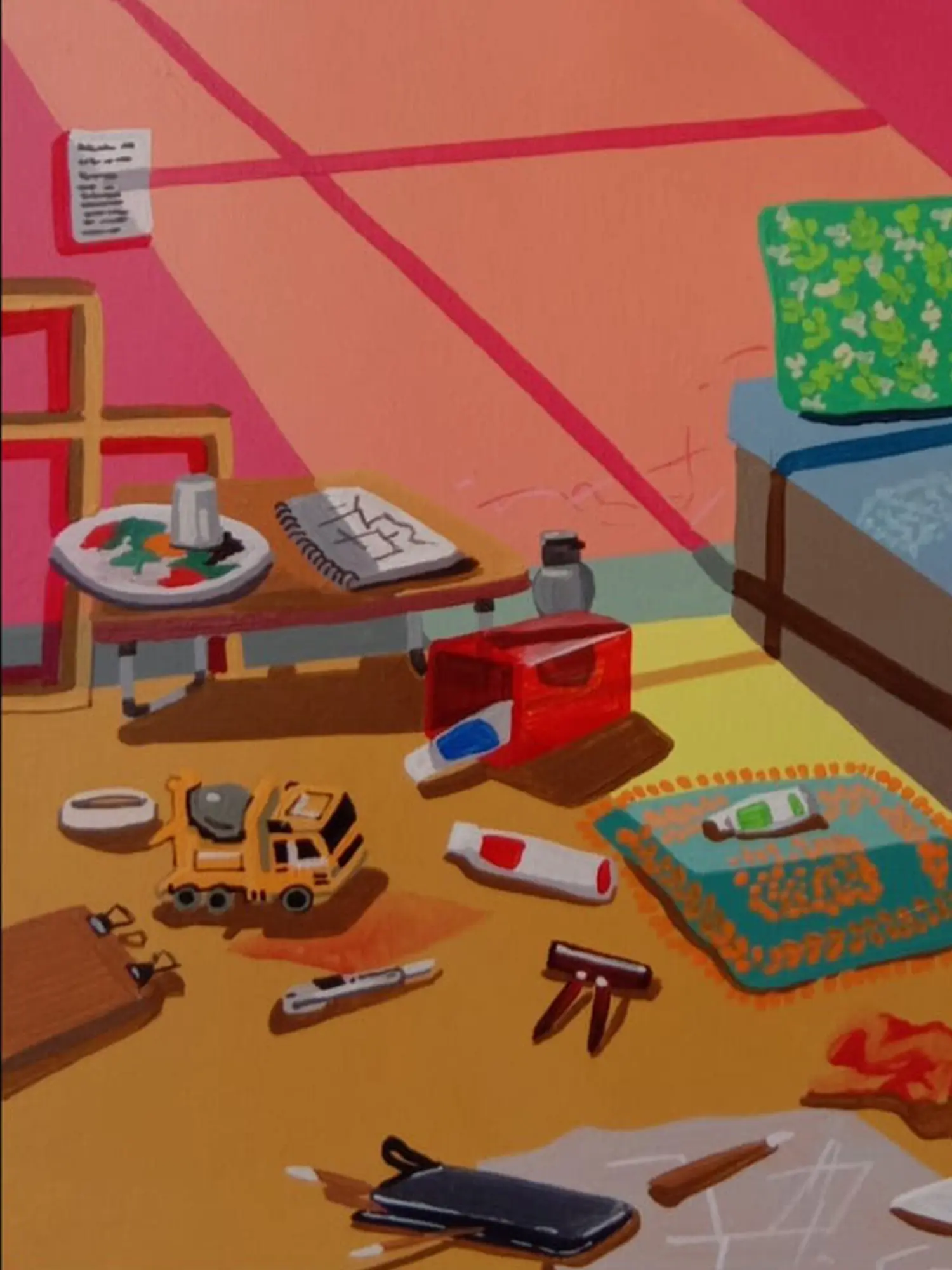 An open notebook, earphones, ladle, and scales are placed on the bed, whose blue sheets and green pillow complement the pink-hued walls of the room. On the floor are a toy truck, colors, color palettes, tools for painting, a board, a table, and a bag, and some scribblings stuck on the wall. Upon a closer look, one can see pen marks on the walls, similar to the very first artworks of toddlers, who find the walls of their home to be a fit canvas.