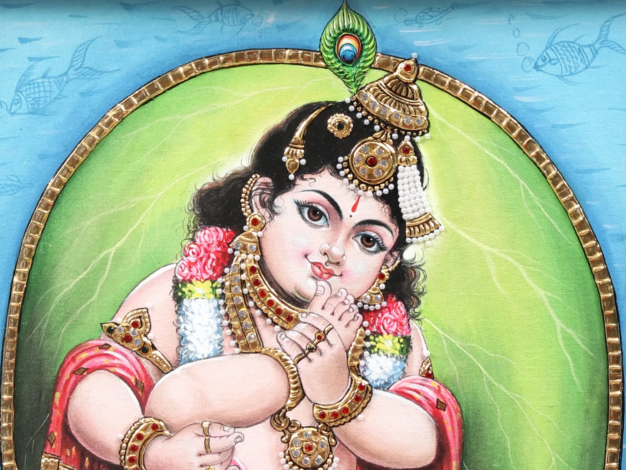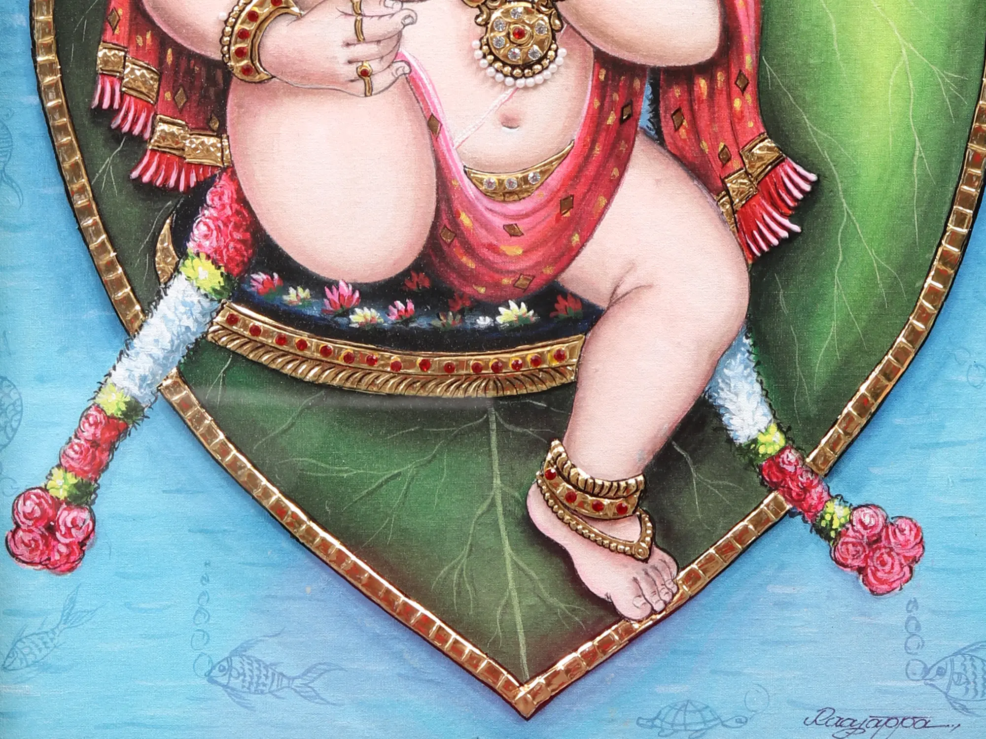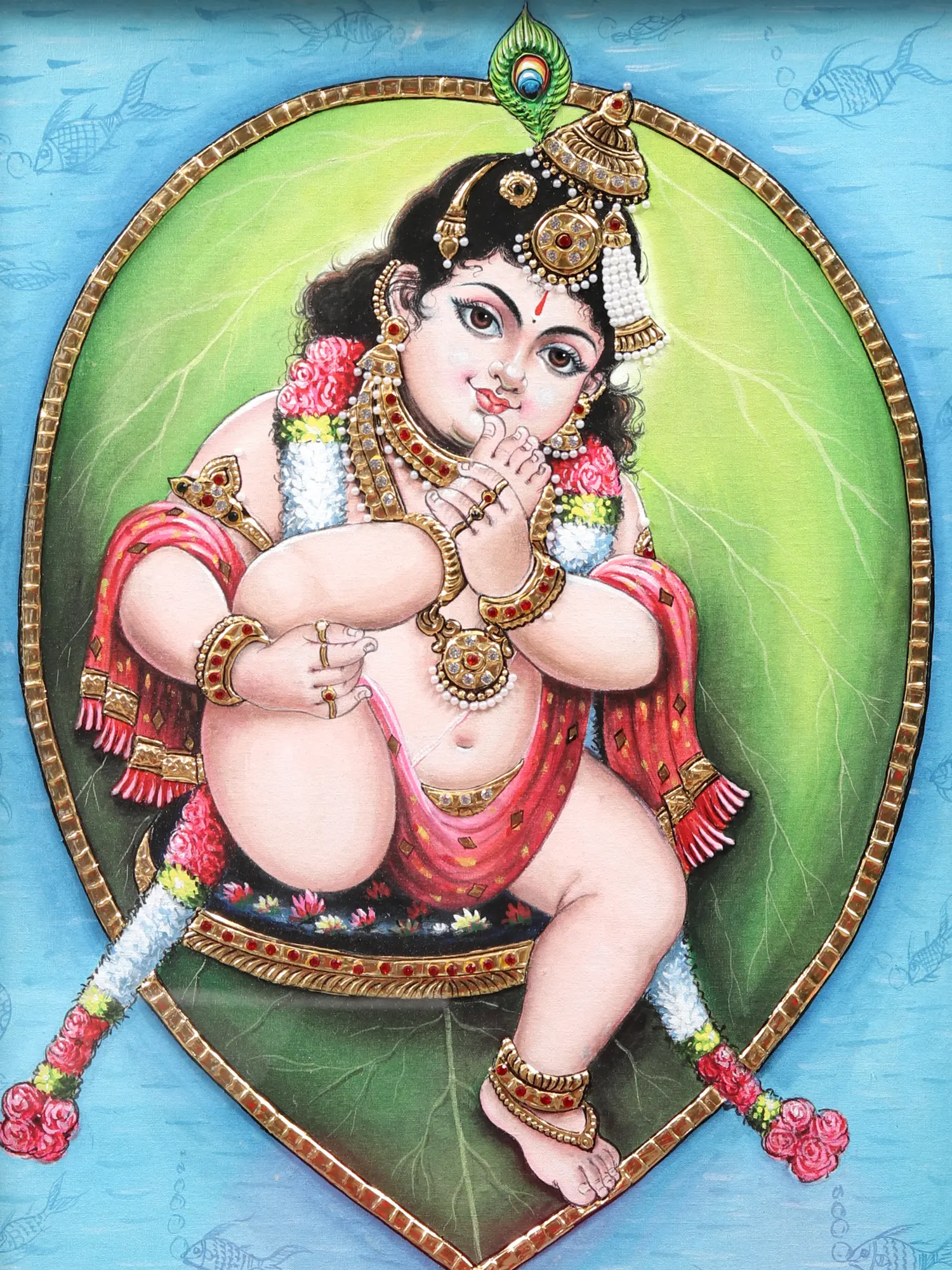 Vatapatra-Shayi Krishna- Sri Krishna laying on the Banayan tree leaf is a beautiful and profound form of the Lord mentioned in the sacred Matsya Purana and Srimad Bhagavad Purana pages. The legend narrates that amidst the great annihilation of Pralaya, sage Markandeya sees a little child, on a Banayan leaf, safely floating over the cosmic waves of Pralaya and suckling on his toe. Markandeya is drawn to the child, entering whose body he witnesses the entire Srishti, protected from the horrors of Pralaya.