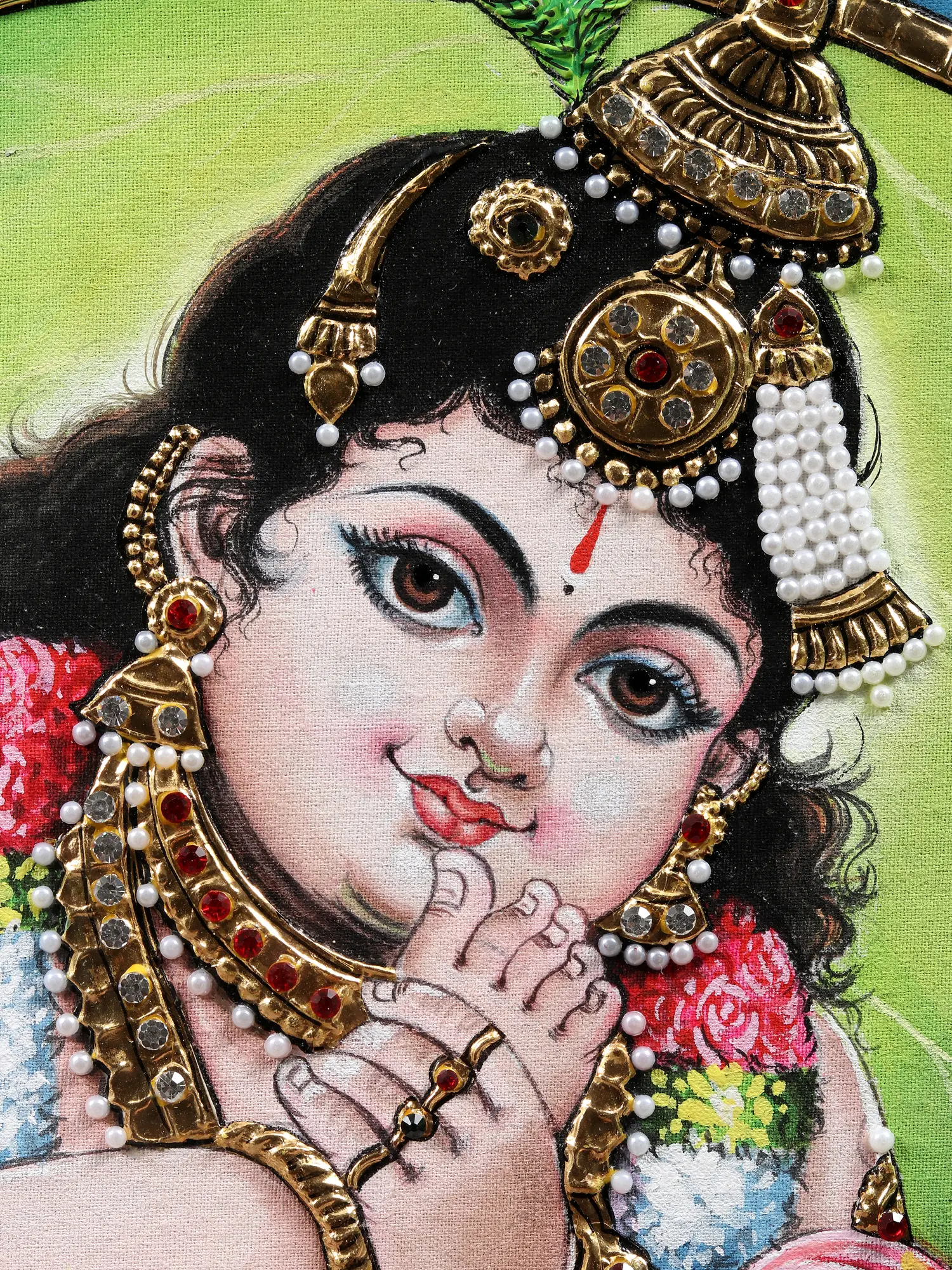 Upon witnessing such awe-inspiring heavenliness, he realizes that the child is none other than the mighty Narayana, who eternally shelters Brahma’s creation when the cycle of time enters the phase of the deluge. This Tanjore painting presents the divine Vatapatrashayi Krishna, adorned beautifully, gazing charmingly at the viewer, with his toe close to his lotus lips. This superb artwork comes with a fine teakwood frame, which will infuse your home with the exotic aesthetics of Indian art.