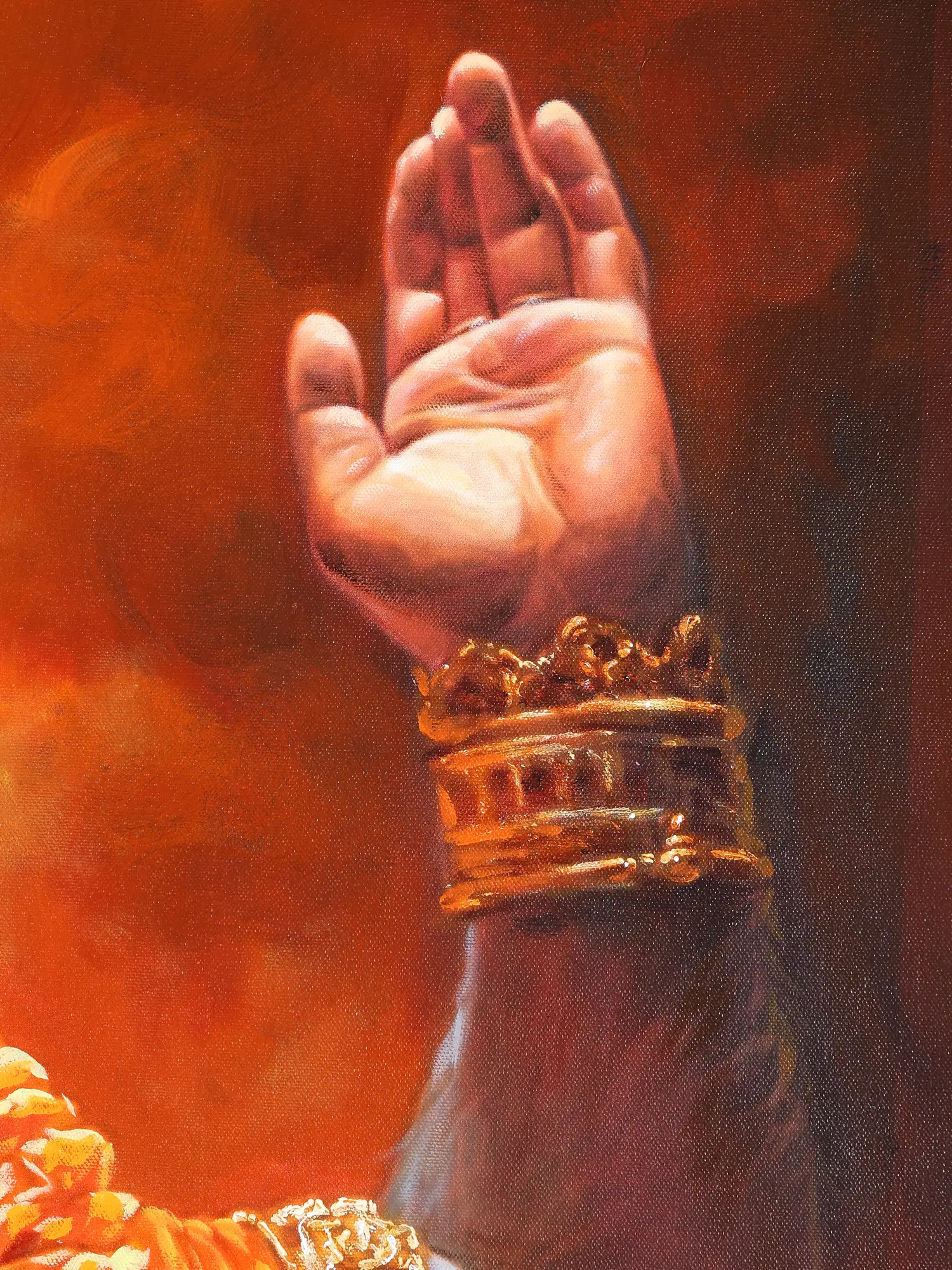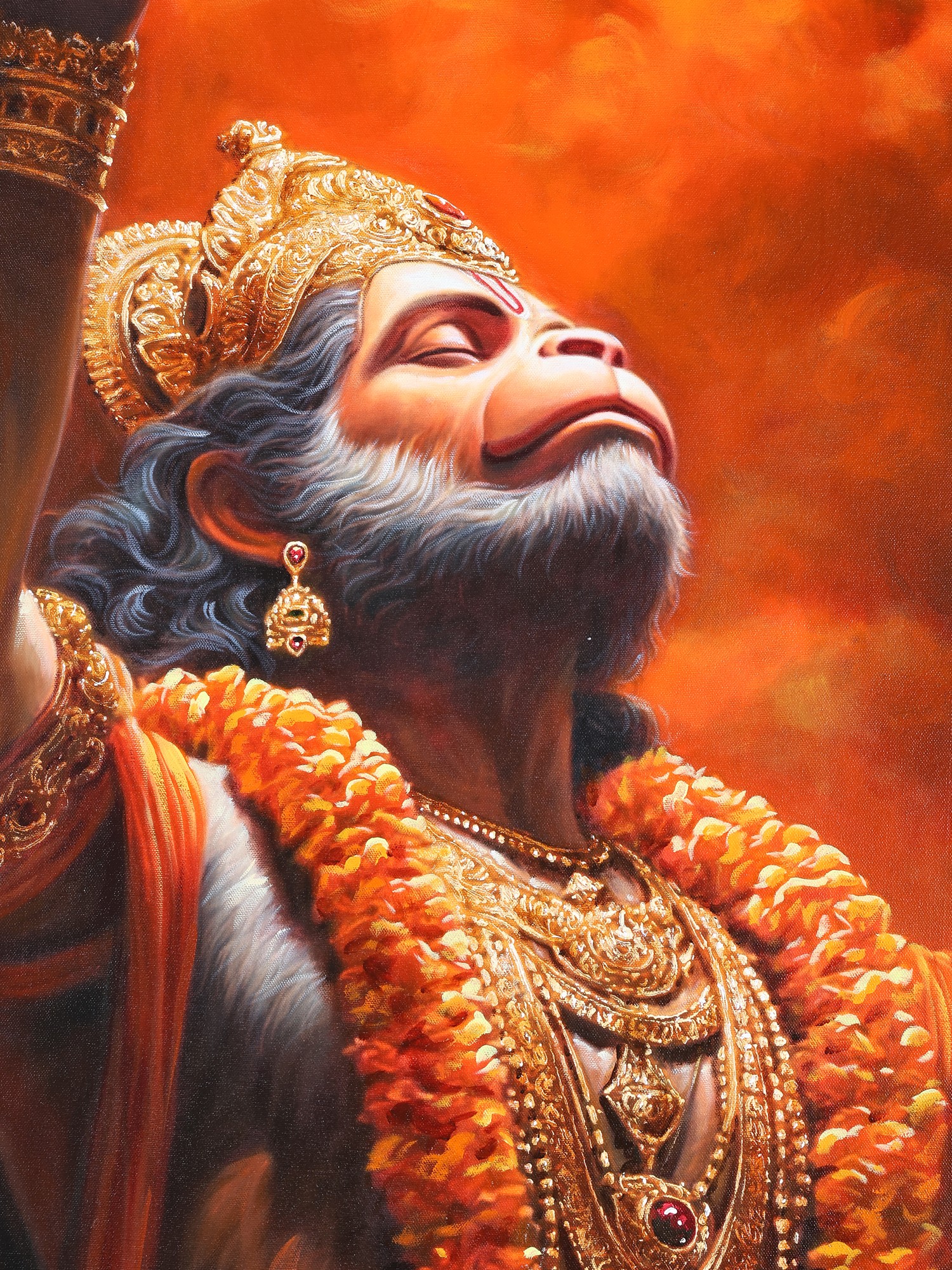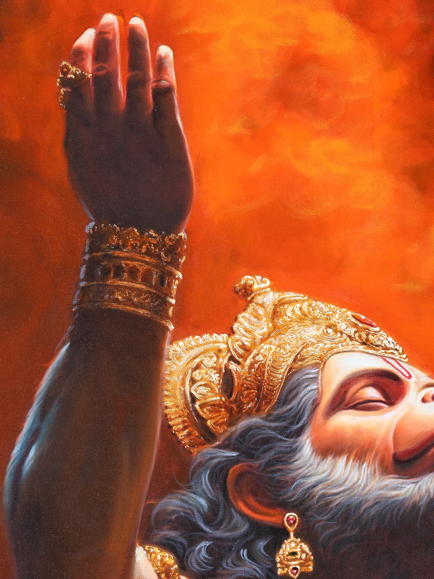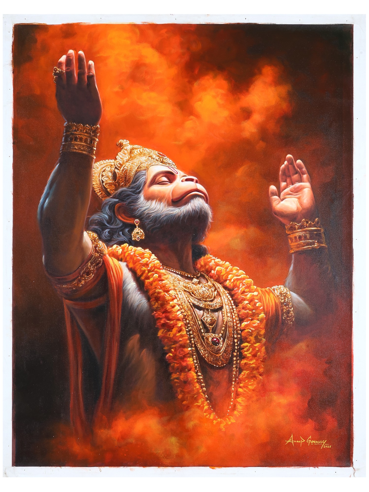 This powerful oil on canvas captures Hanuman in a moment of exalted surrender, his face uplifted toward the heavens, arms extended in a gesture that transcends prayer and becomes pure devotion. The painting blazes with shades of molten orange and gold, as though the very fire of bhakti rises around him, ignited from within.