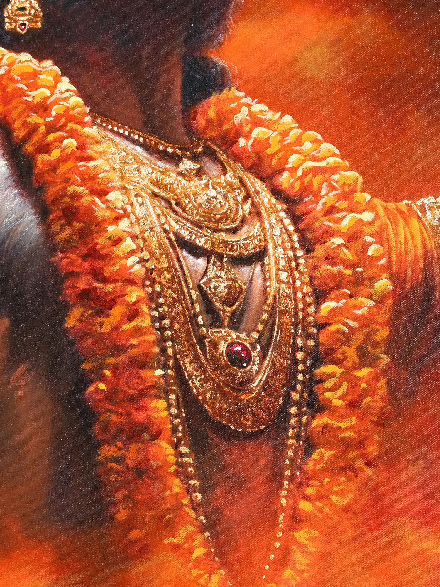 The artist captures every detail with remarkable realism- the soft white of Hanuman’s fur, the intricate jewellery, the marigold garlands resting on his broad chest. Yet it is the emotional core of the painting that commands the eye: a devotion so total that it transforms the surrounding world into its own hue.