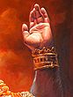 The vibrant oranges and reds that swirl around Hanuman are not merely decorative; they symbolize the auspiciousness, power, and radiant energy associated with divine beings in Indian tradition. In Hindu mythology, fire is often seen as a purifier and a messenger to the gods. Here, the fiery backdrop suggests that Hanuman's devotion is so potent it ignites the very heavens. His grey fur and stoic expression are softened by the golden ornaments that gleam with an inner light, suggesting the divine within the earthly form. The artist’s meticulous attention to texture and light creates a palpable sense of presence, inviting the viewer to share in Hanuman's spiritual experience. This artwork is a powerful reminder of the spiritual heights that can be achieved through devotion and surrender.