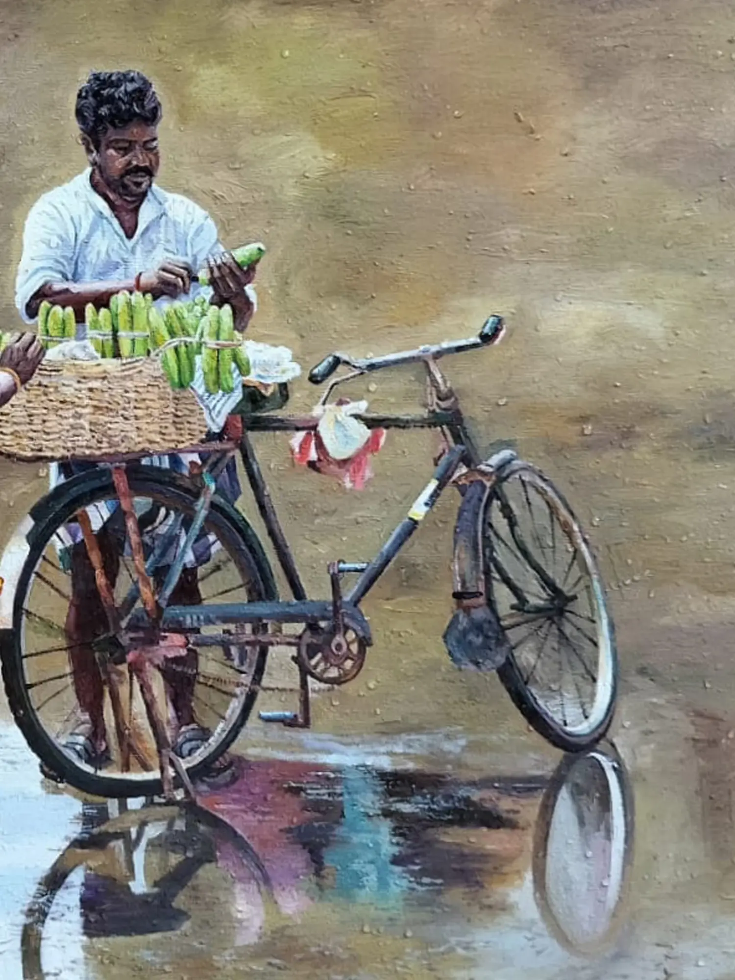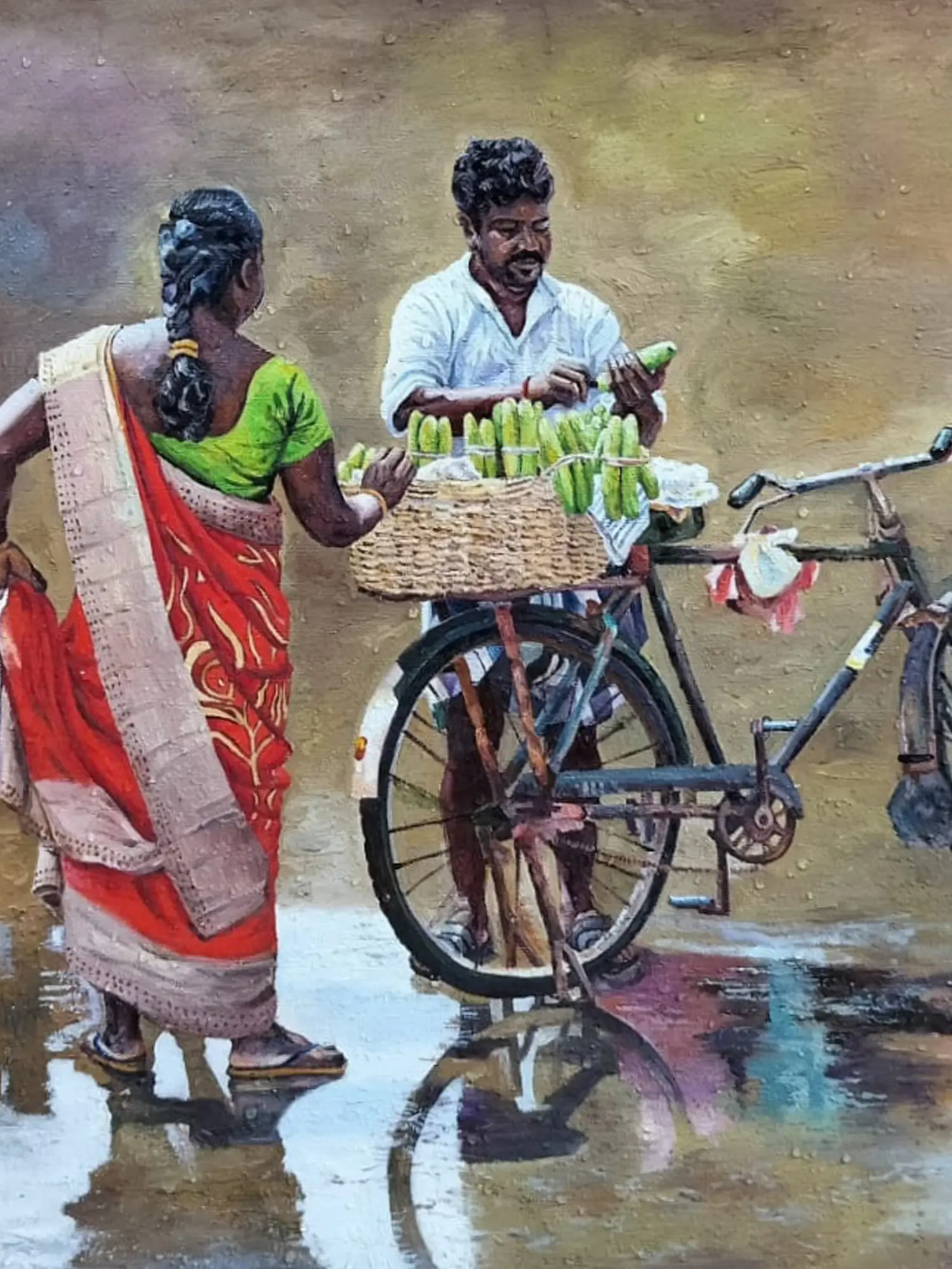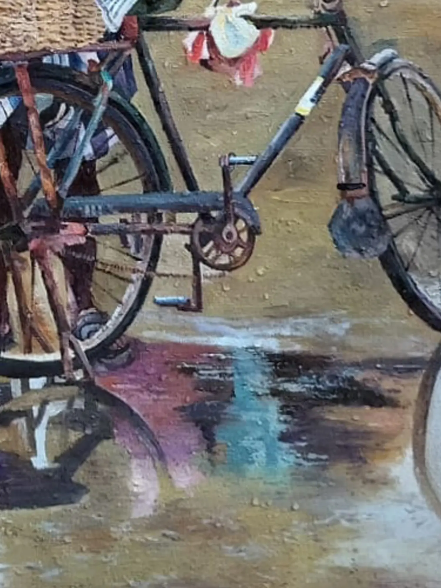 The canvas, measuring 24 inches in height and 36 inches in width, unfolds a narrative of interaction. You'll observe the interplay of figures, the texture of the vegetables, and the weathered charm of the bicycle, all rendered with stunning realism. The subtle reflections on the wet ground add depth and a sense of atmosphere, drawing you deeper into the composition.