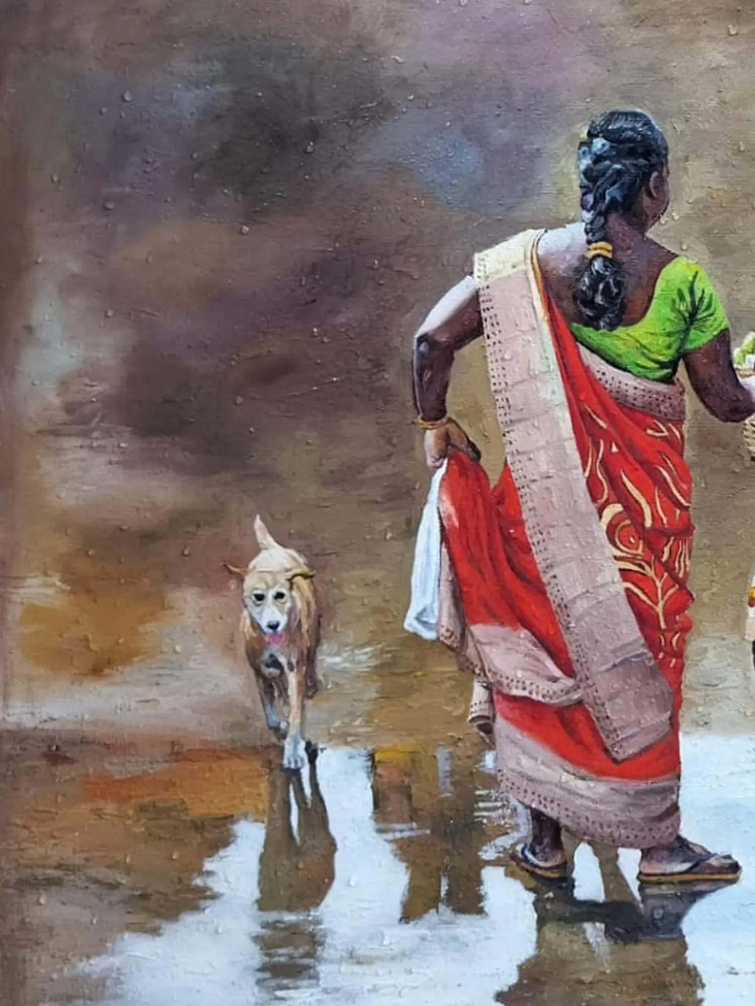 Rendered on fine paper, this watercolor showcases the masterful technique of Dhyanesh Ramani. You'll appreciate the delicate yet decisive brushstrokes that bring the scene to life, each hue blended with an expert hand. The fluidity of watercolor is perfectly employed here to convey the ephemeral nature of light and moisture, mirroring the fleeting moment captured.