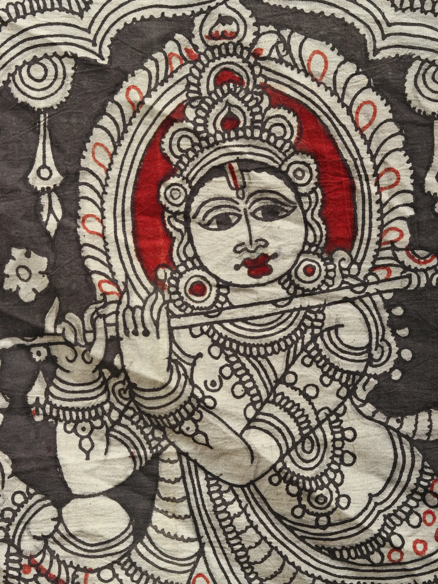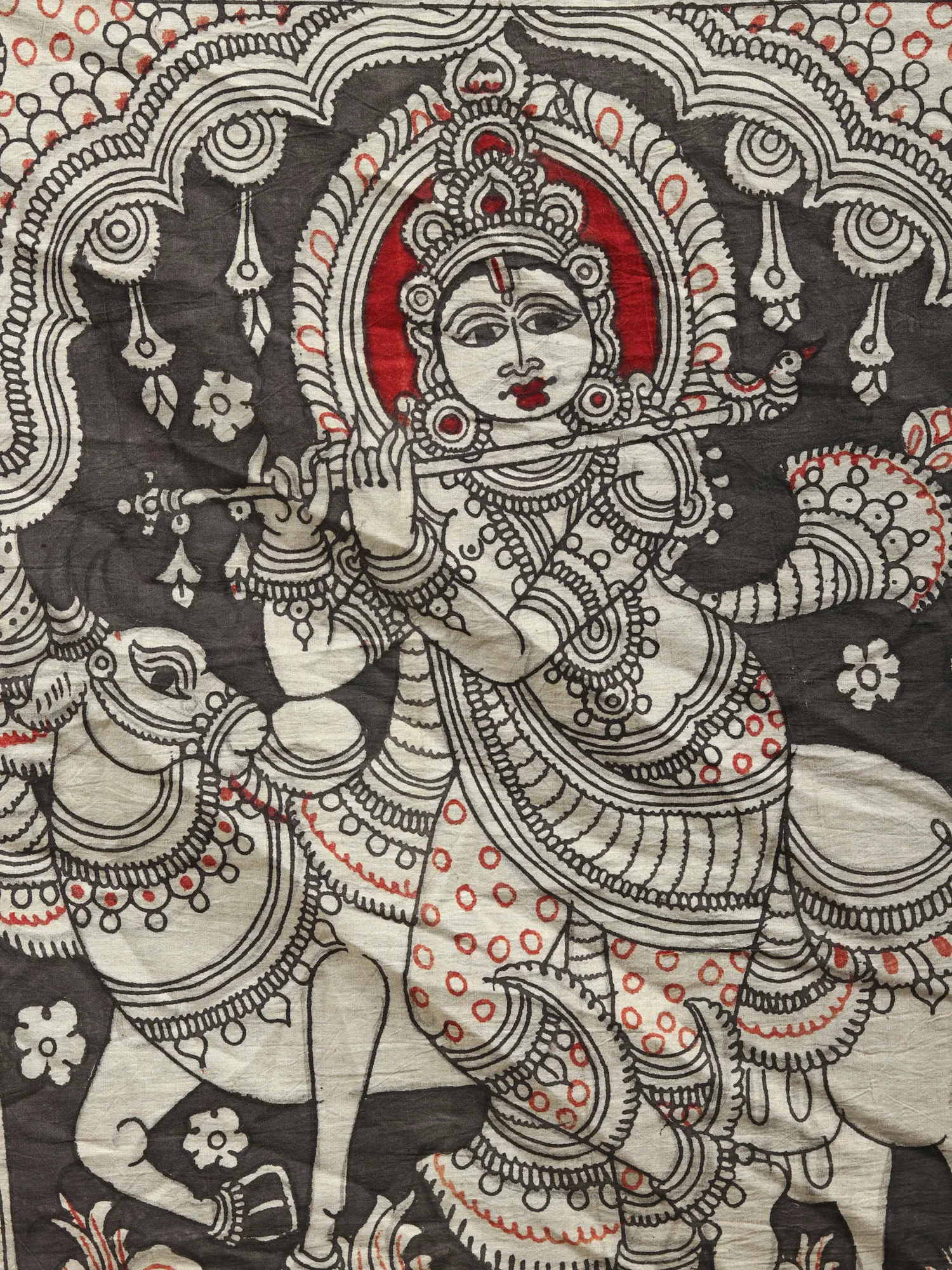 Set against a backdrop of vibrant colors and intricate patterns typical of Kalamkari art, the painting radiates a sense of tranquility and reverence. The intricate detailing and ethereal aura surrounding Lord Krishna evoke a feeling of divine presence, inviting viewers to experience a deeper connection with spirituality.