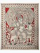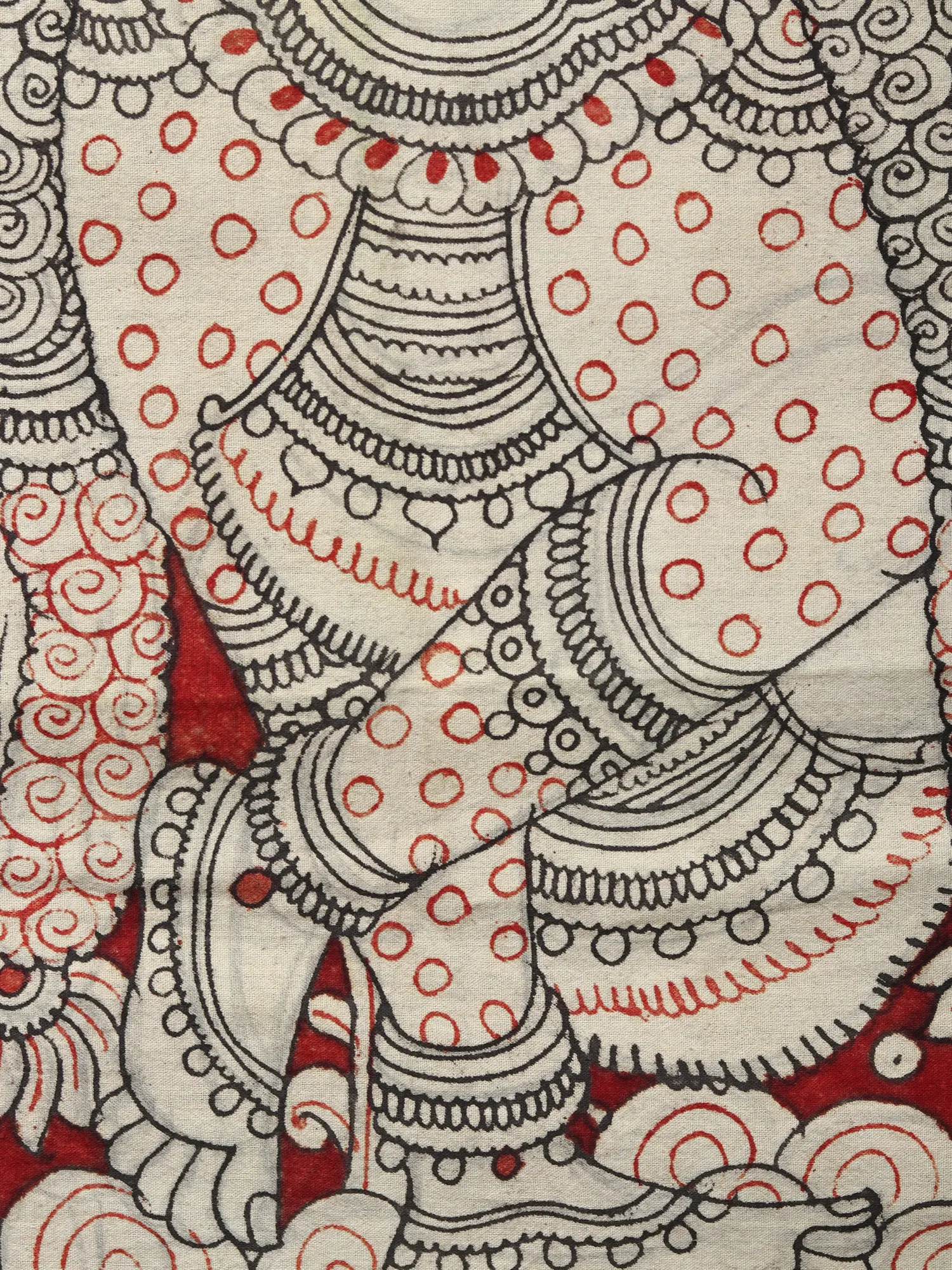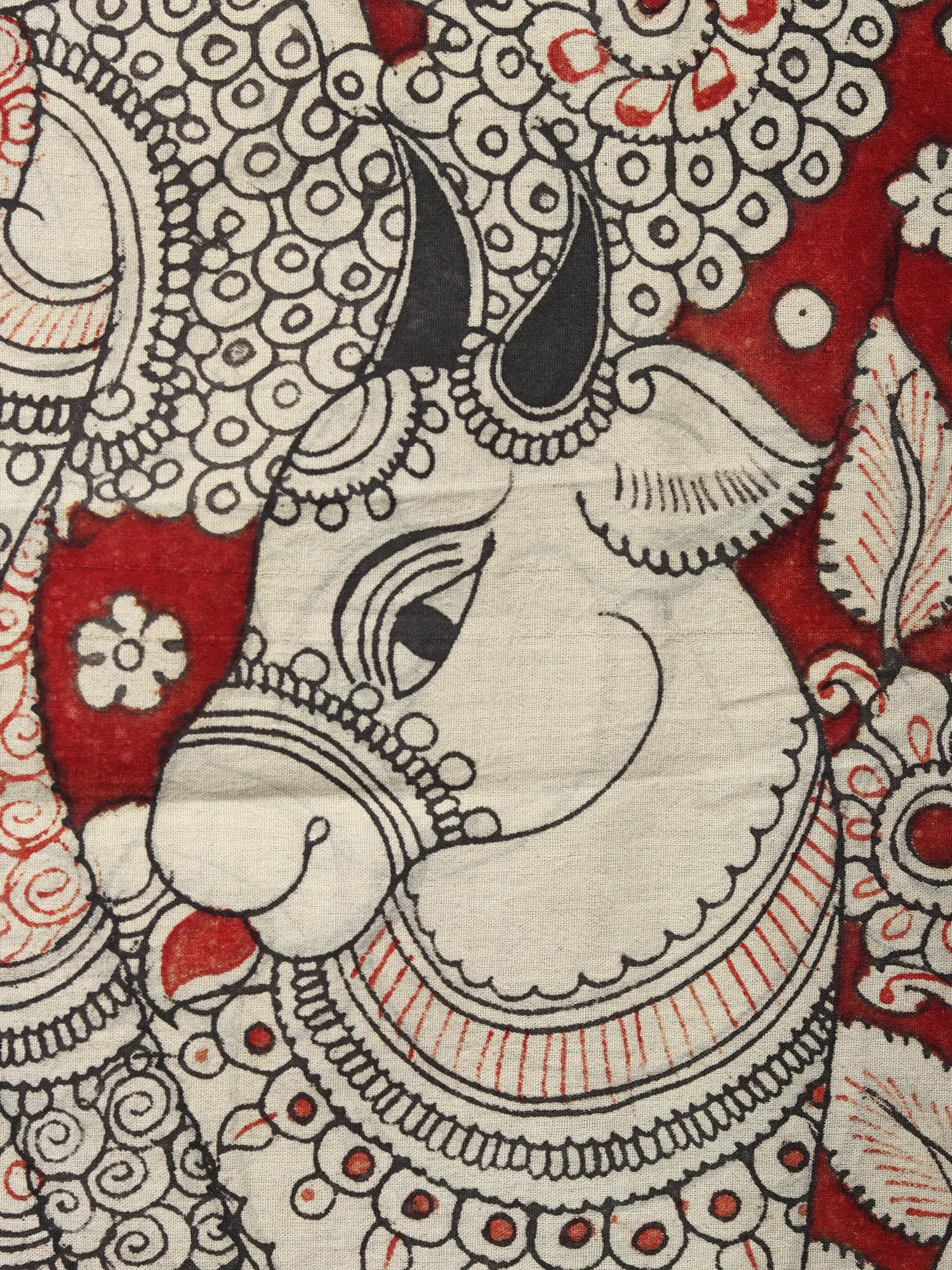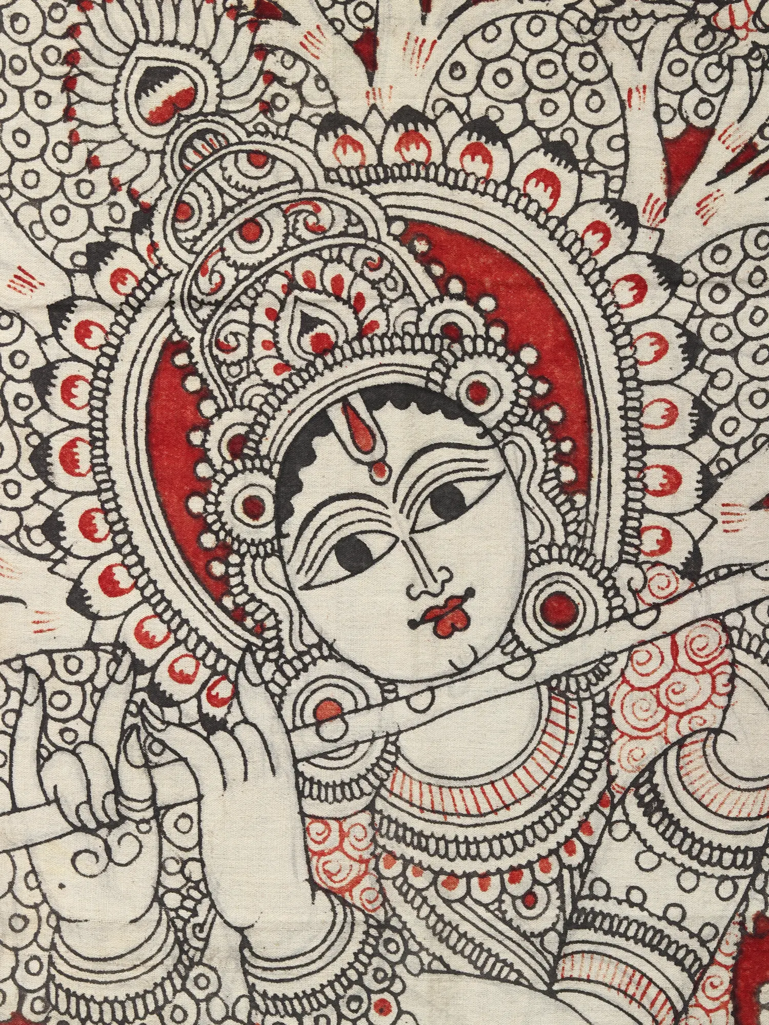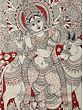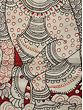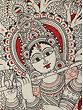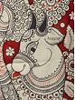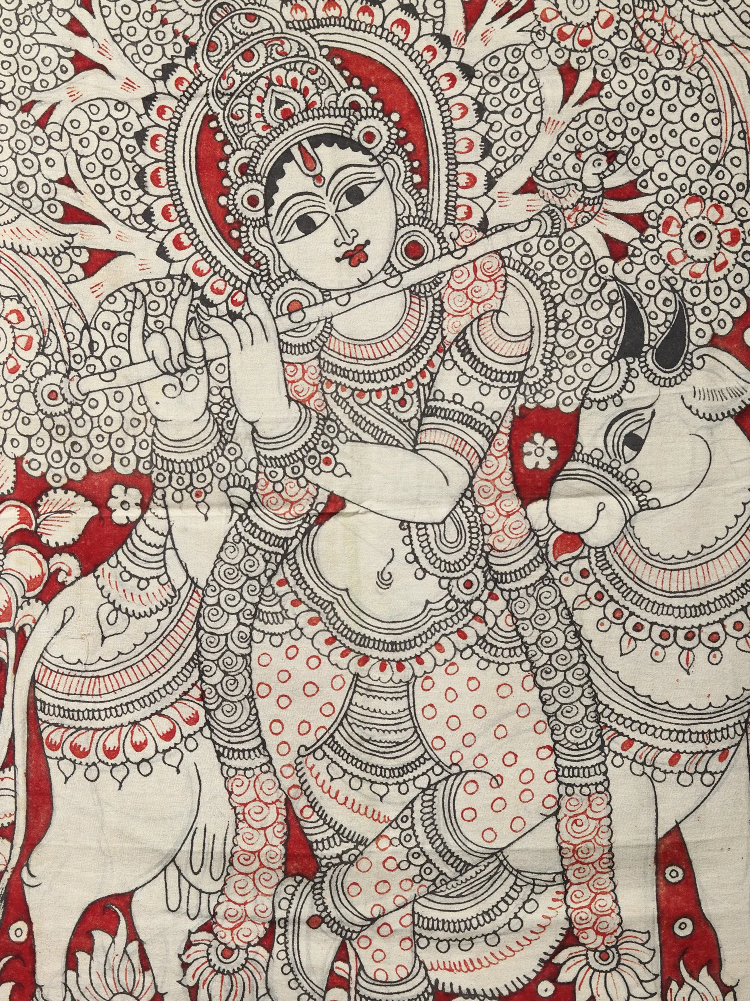 In the Kalamkari painting on cotton, Krishna's tribhanga pose, accompanied by a cow and a tree teeming with birds, immortalizes his divine charm. The intricate borders framing the image showcase the artistry of the craft, while the strategic use of red color enhances contrast and accentuates the divine presence. This masterpiece celebrates Krishna's eternal beauty and captures the essence of devotion through intricate detail and vibrant imagery.