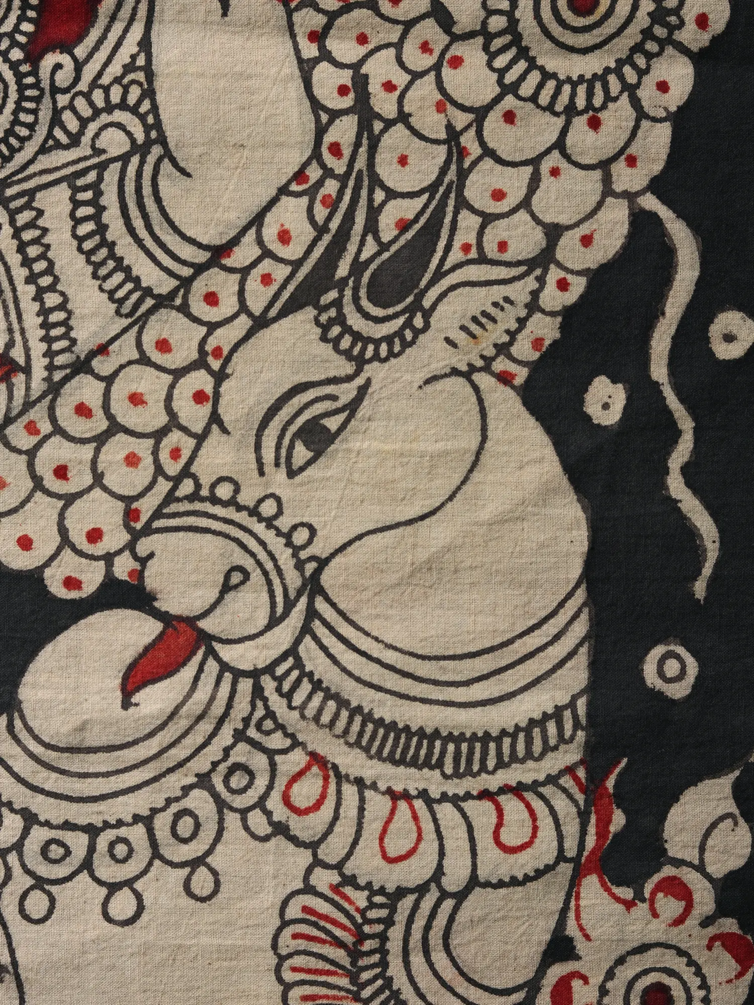 Witness the mastery of Kalamkari, an ancient Indian art form where every line is infused with tradition and passion. Crafted by skilled artisans, this piece is meticulously hand-painted on fine cotton fabric, a medium that lends itself beautifully to the bold yet delicate artistry. The pigments, derived from natural sources, imbue the work with an earthy richness and unparalleled depth, reflecting a heritage passed down through generations. You'll appreciate the careful attention to detail, from the flowing forms to the intricate patterns that adorn the figures and their surroundings.