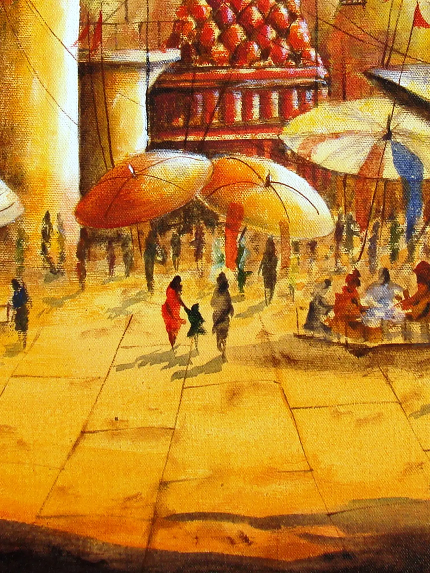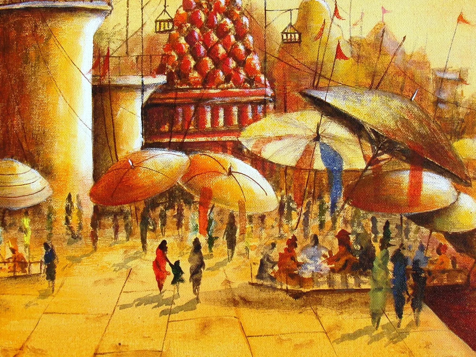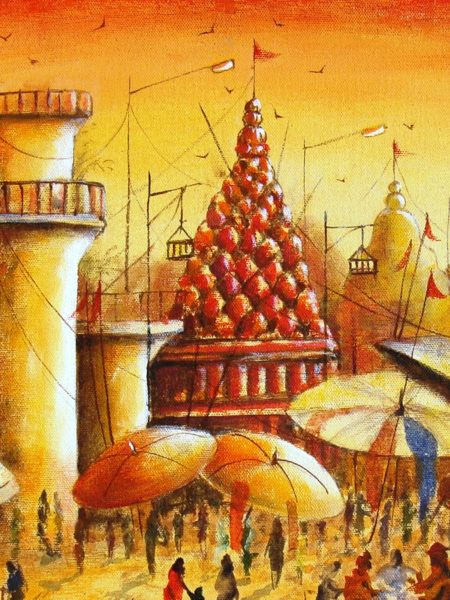 Immerse yourself in the vibrant spirit of an ancient city, captured at its most evocative moment. This striking acrylic on canvas invites you to experience the bustling energy and timeless allure of a revered riverfront. You'll be drawn into a scene brimming with life, light, and profound cultural resonance.