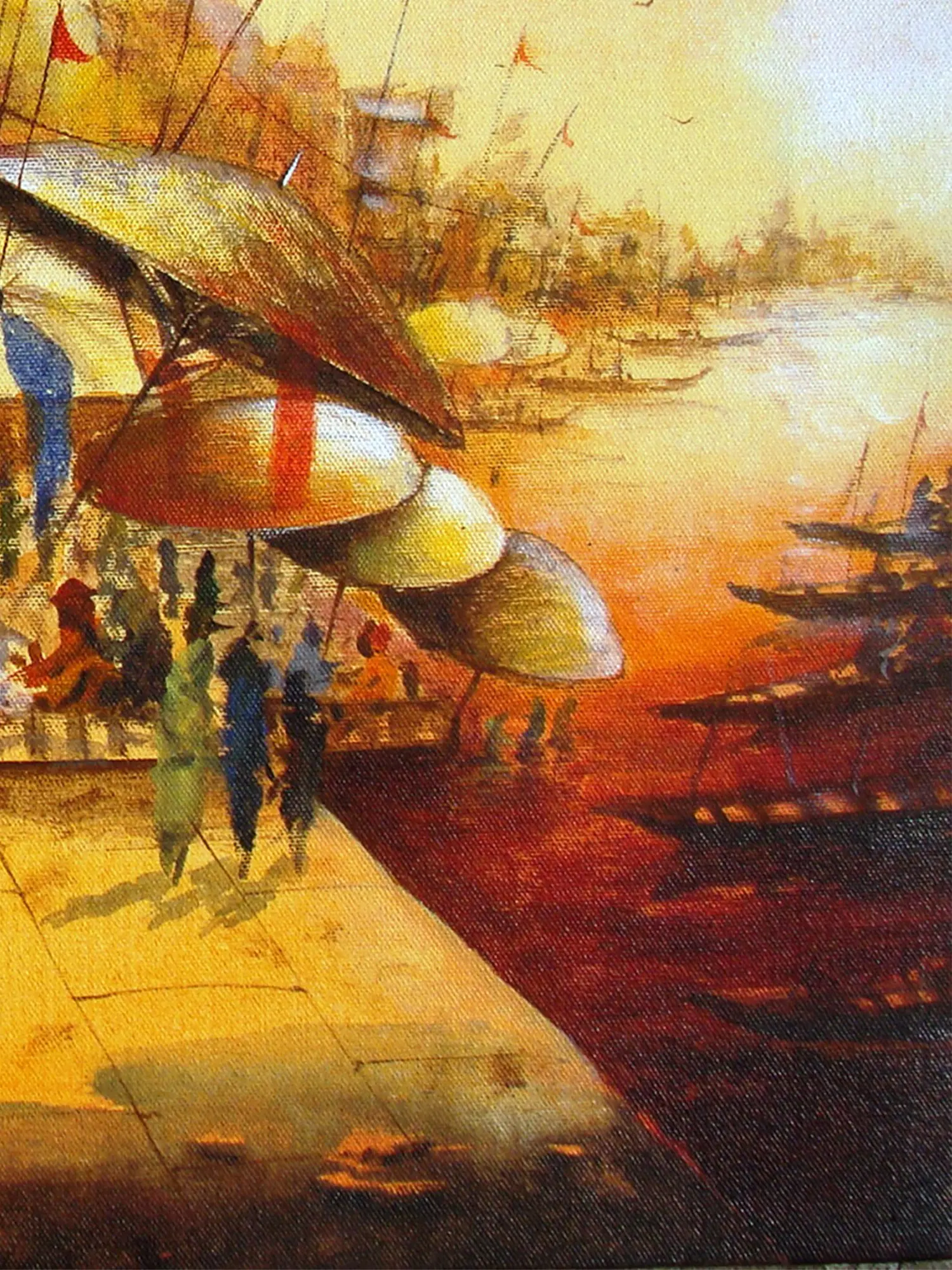 The commanding architectural elements, characterized by their sturdy towers and intricate detailing, stand sentinel against a fiery sunset sky. You’ll observe the lively promenade, where figures gather beneath colorful awnings, their interactions hinting at the pulse of daily commerce and devotion. The broad expanse of the canvas, measuring 18 inches in height and 24 inches in width, allows for a comprehensive yet intimate portrayal of this dynamic setting.