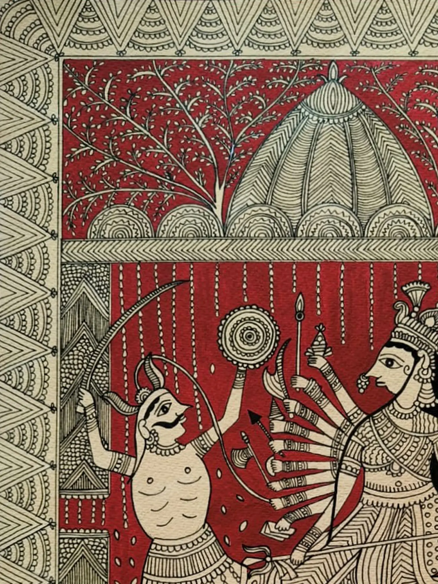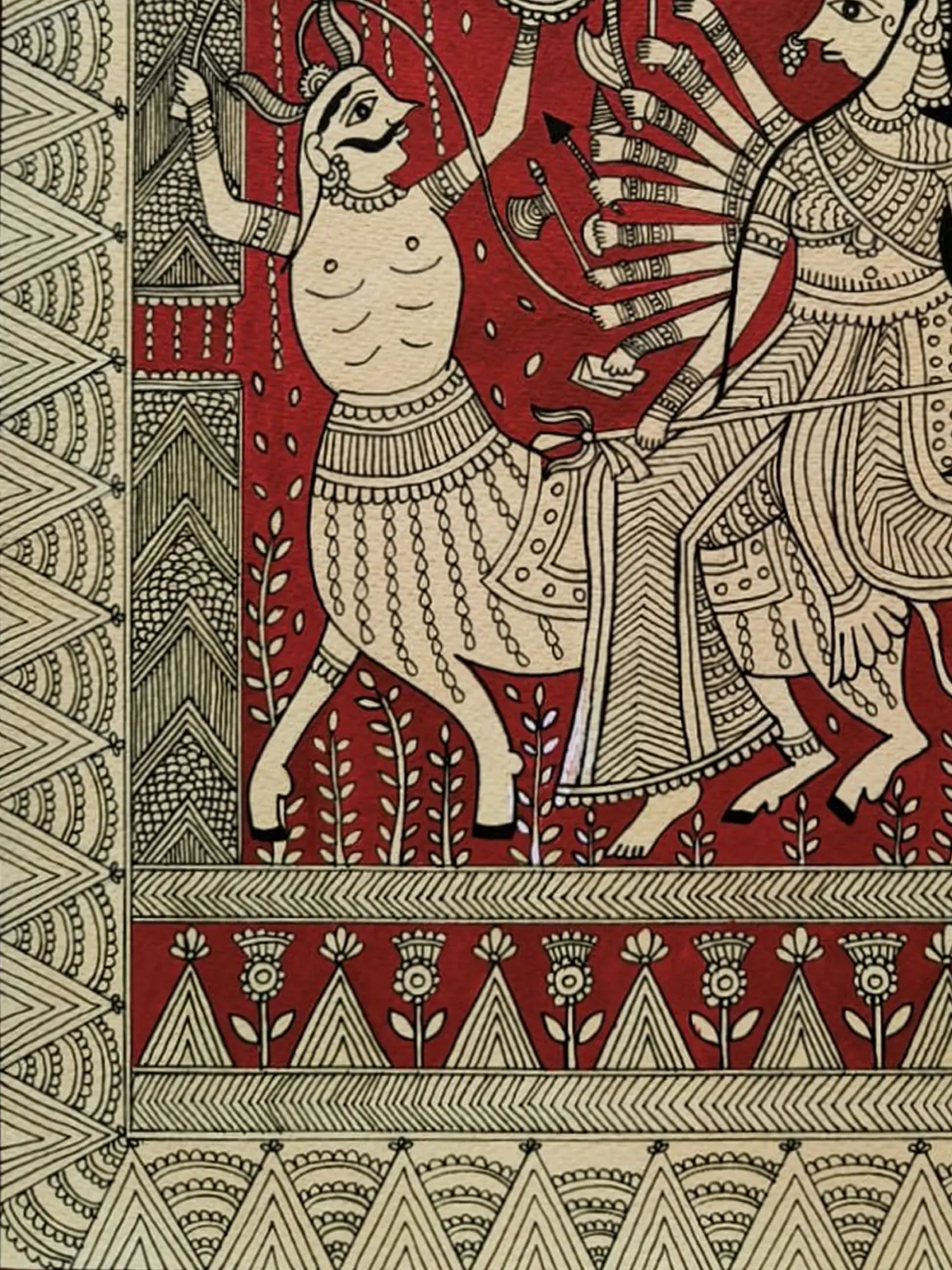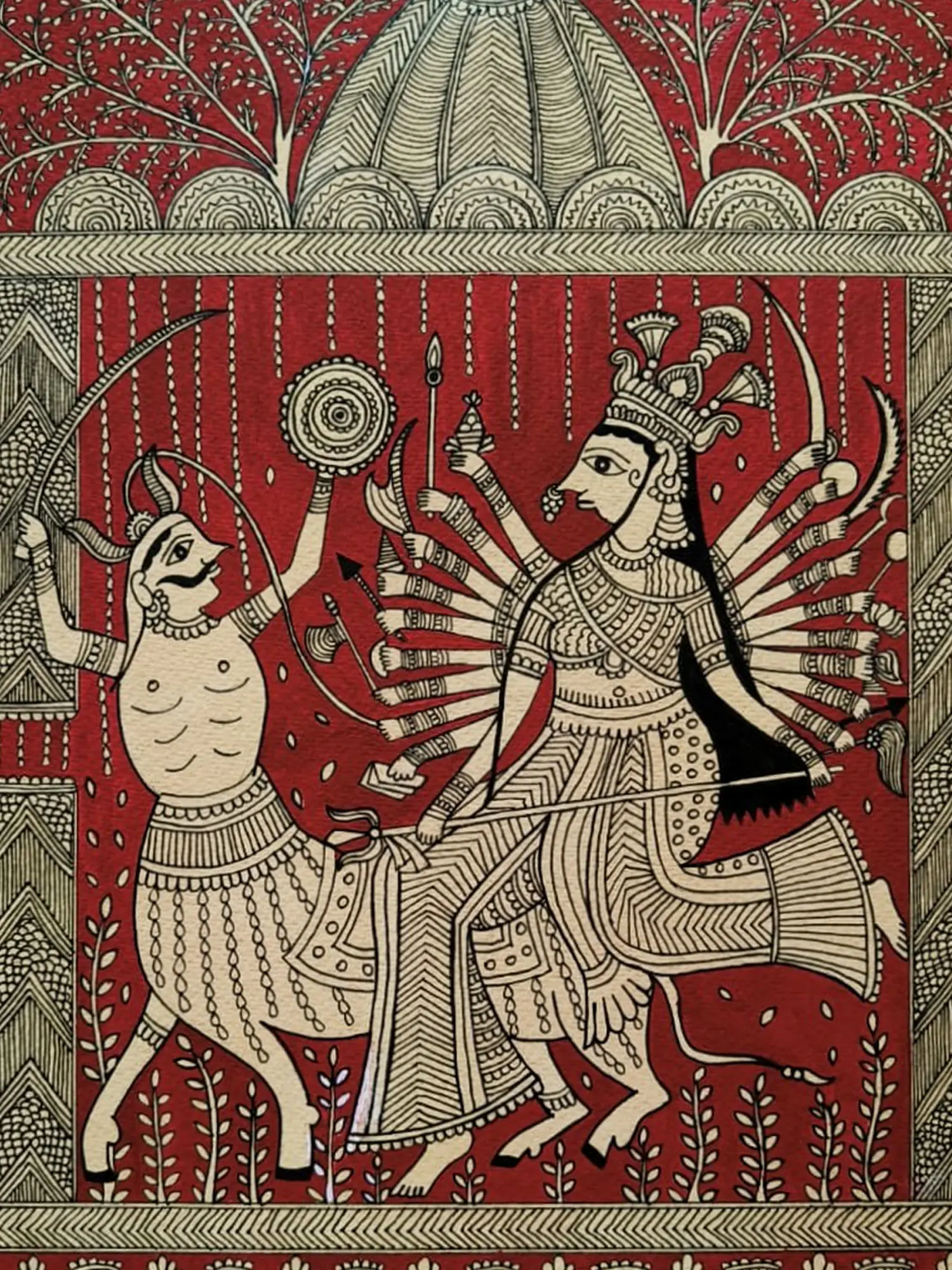 The composition is framed by intricate borders, drawing your eye towards the central figures. You'll appreciate the detailed rendering of the divine feminine, with her myriad of arms poised for action, and the fierce warrior facing her. The artist’s use of stark black outlines against the deep red backdrop creates a dramatic and dynamic contrast, enhancing the visual storytelling. The earthy tones and organic patterns in the surrounding elements further enrich the overall aesthetic appeal.